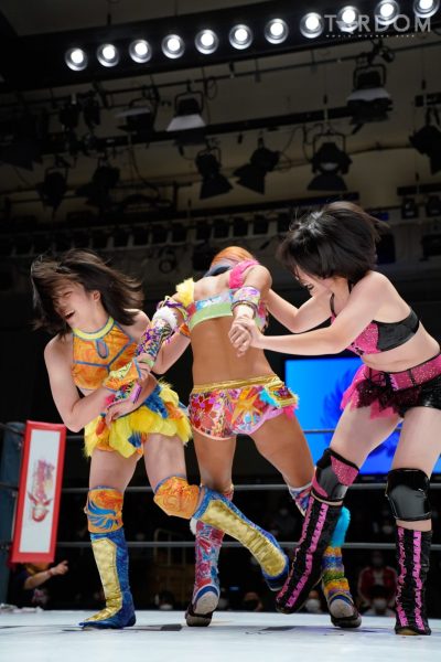 琉悪夏が舞華を捕獲、キッドが舞華の左腕を攻撃する。朱里がカットに入るも琉悪夏が場外に送り出す。キッドが背中にドロップキック。キッドは「この腕折っちゃおうかなあ」とつぶやきながら攻めていく。しかし舞華はカウンターでショルダータックル。舞華はキッドにブレーンバスター。タッチを受けようとした朱里の足をセコンドのフキゲンが引っ張って阻止。キッドと琉悪夏が連係で舞華を攻め込む。キッドは舞華にフィッシャーマン狙い。舞華が切り返しラリアット、ショルダータックル。琉悪夏がこらえてショルダータックルで吹っ飛ばす。舞華もショルダータックルでお返し。琉悪夏が舞華にフィッシャーマンを決めるが2カウント。朱里が入って琉悪夏にサッカーボールキック、舞華がスライディングラリアット、朱里と舞華が打撃の競演で琉悪夏を挟み撃ち。琉悪夏がラリアットをかわしキッドがネックブリーカー、琉悪夏が冷凍庫爆弾を投下。舞華が悲鳴も朱里がカットに間に合う。キッドが朱里を投げるとレフェリーへの誤爆が続く。キッドが舞華を捕獲し琉悪夏がイスを持ち込む。大江戸隊が朱里を固定し、見せつけるように琉悪夏がイスで殴打。キッドは朱里に軽く張り手を見舞って挑発。朱里がキッド、琉悪夏にマウントパンチ。琉悪夏もやりかえしていくがレフェリーが権利がないと止めに入る。朱里はレフェリーをはねのける。この行為が繰り返されるとレフェリーは反則の裁定。琉悪夏の反則勝ちが宣告された。