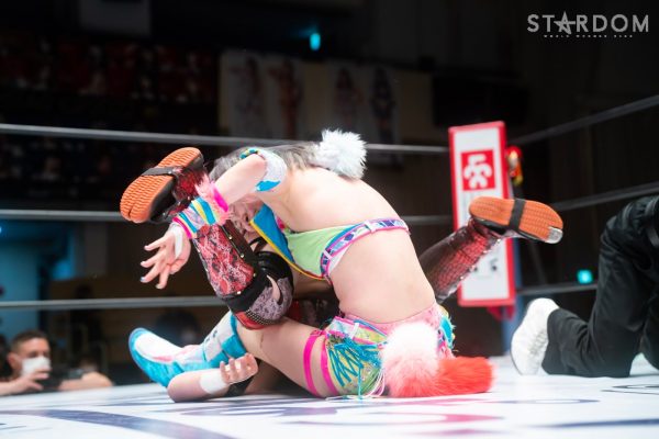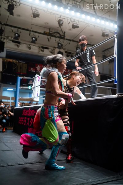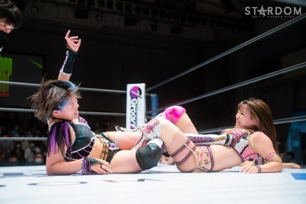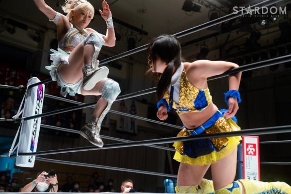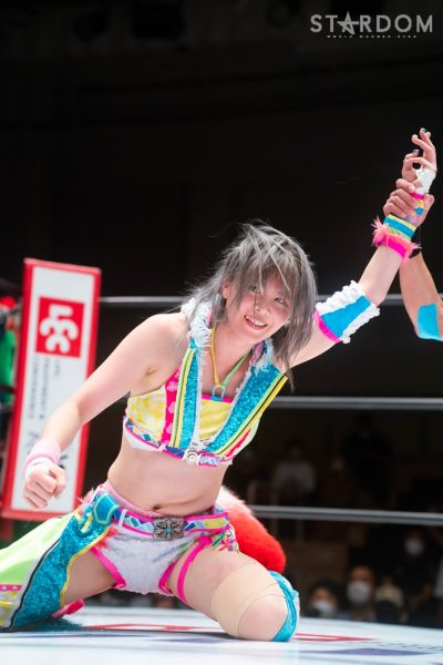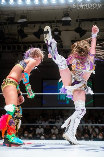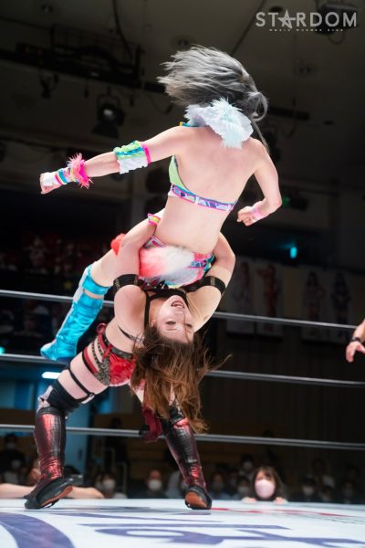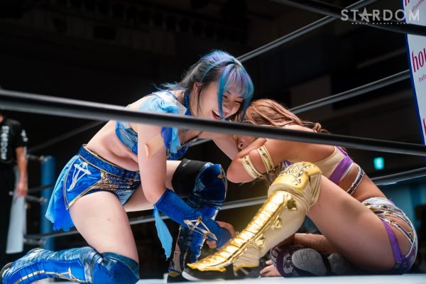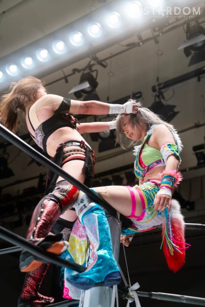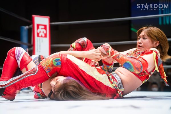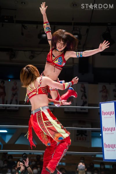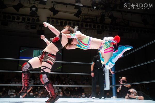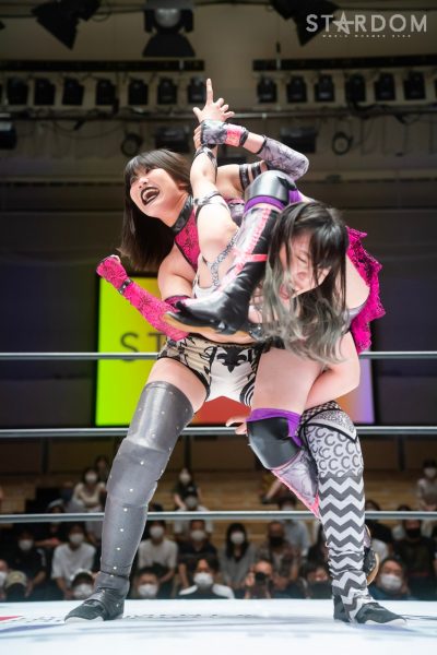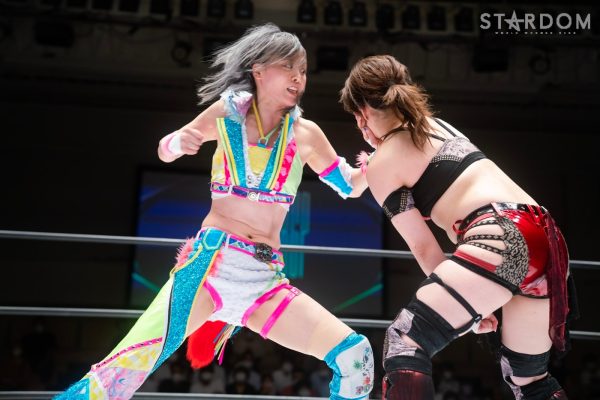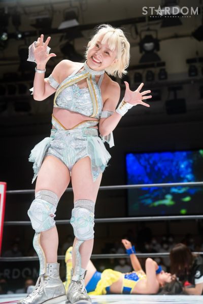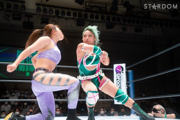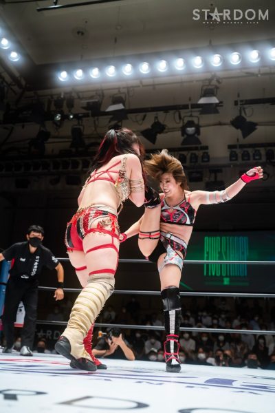 ゴッデス・オブ・スターダム王者なつぽいとフューチャー・オブ・スターダム王者・羽南による5★STAR GP公式戦。いまだ白星のない羽南が待望の初勝利を挙げるかどうかが焦点にもなるが、なつぽいは前日の横浜大会メインでゴッデス・オブ・スターダム王座を防衛。リーグ戦では後がないだけに、昨日の勢いそのままに確実に2点をゲットしておきたいところだろう。