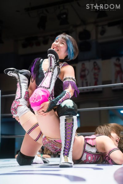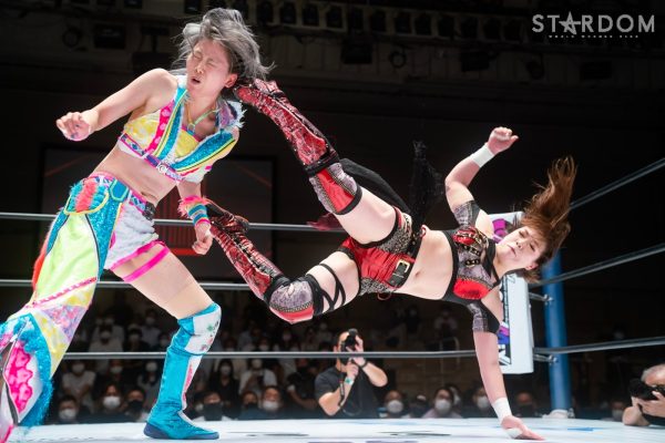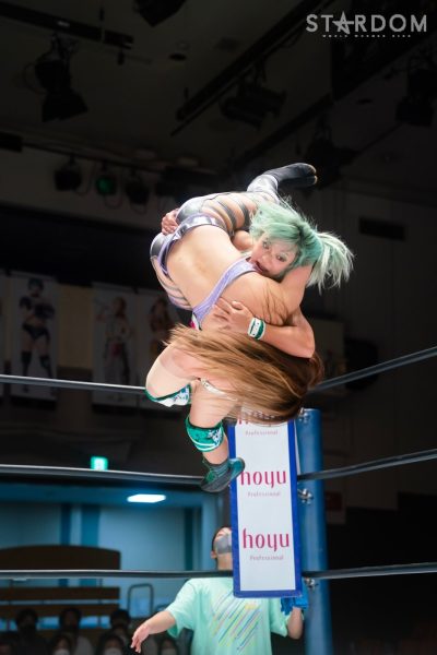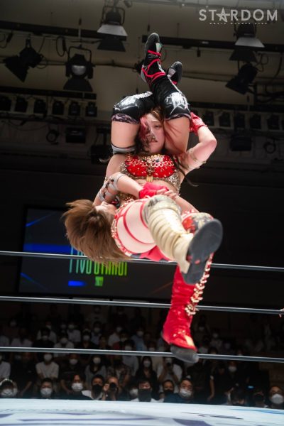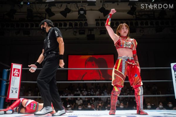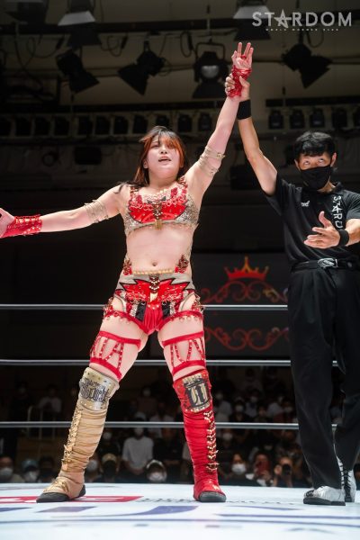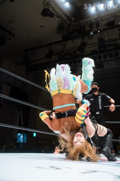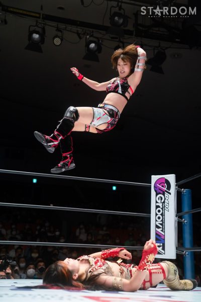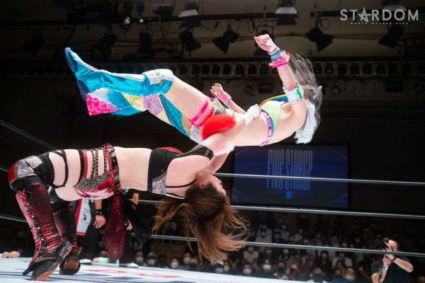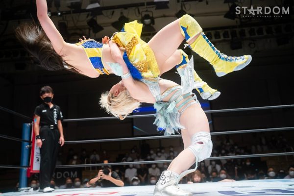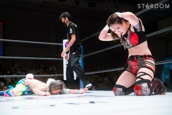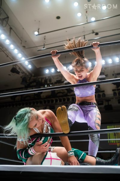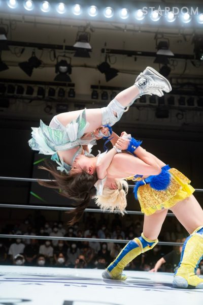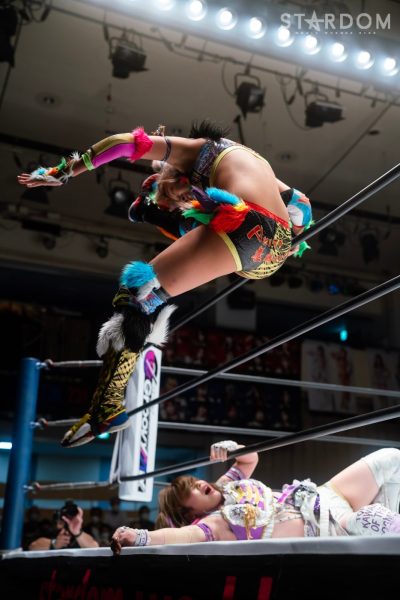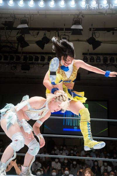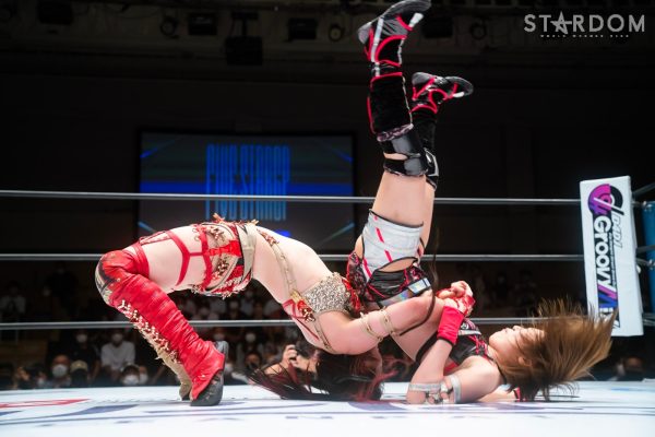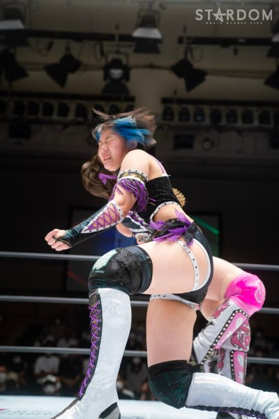 ゴッデス・オブ・スターダム王者なつぽいとフューチャー・オブ・スターダム王者・羽南による5★STAR GP公式戦。いまだ白星のない羽南が待望の初勝利を挙げるかどうかが焦点にもなるが、なつぽいは前日の横浜大会メインでゴッデス・オブ・スターダム王座を防衛。リーグ戦では後がないだけに、昨日の勢いそのままに確実に2点をゲットしておきたいところだろう。