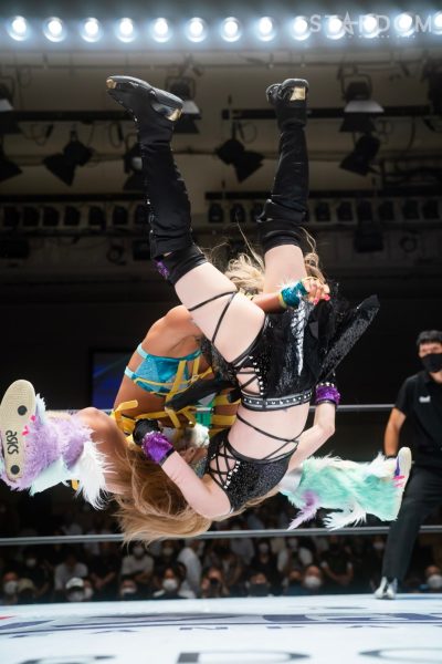 中野たむとウナギ・サヤカがCOSMIC ANGELS同門対決。中野はこれまで4勝2敗で決勝進出争いで好位置をキープ、前日の横浜ではなつぽいとのタッグでゴッデス・オブ・スターダム王座を守っているだけに、その勢いのまま同門対決をクリアー、初の決勝進出に向けてさらに前進したいところだろう。一方のウナギはこのリーグ戦でわずか1勝、まさかの不振にあえいでいる。優勝争いからは脱落と見られるが、中野との同門対決を契機に何かをつかみたい。