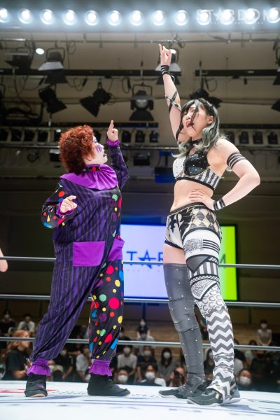 AZMは前日の横浜大会で林下詩美との同門対決に勝利、前赤いベルトの王者を差し置いてレッドスターズのトップを走っている。この日の相手はプロミネンスの世羅りさ。試合数こそ異なるが、世羅もAZMと同じく2敗をキープしているだけに、まだまだ圏内。優勝争いの行方を左右する一番と言っていいだろう。はたして、異色の対決で最後に勝ち名乗りを受けるのは?