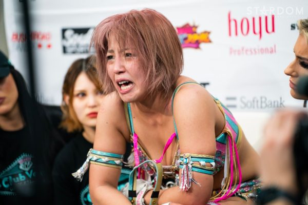「悔しい…。自分から2冠戦ぶちあげといて、すごいたくさんのファンの人が応援してくれてたのは知ってるし、白いベルト取ったばっかで希望つかんだばっか…。つらい。申し訳ないですね。つらいです。中野たむに勝てない!今日も勝てなかった。とにかく申し訳ない気持ちしかない。ファンの人、クラブビーナス。みんなに希望を見せたいんだよ…。なんとか頑張って這い上がったら、でっかくなって、頂きに立てるっていうのを見せたいんだよ。うぁああ…。本当にごめんなさい。次に何をすればいいか、自分のこれからはちょっと考えさせてください。負けることは考えてなかった。次はIWGP(女子)に挑戦する予定だった。あこがれの新日本プロレスのリングでもまだ試合をしたことないから。試合しにいくつもりだった。本当にごめんなさい。こんな姿しか見せきれなくてごめんなさい。ちょっと待っててください」