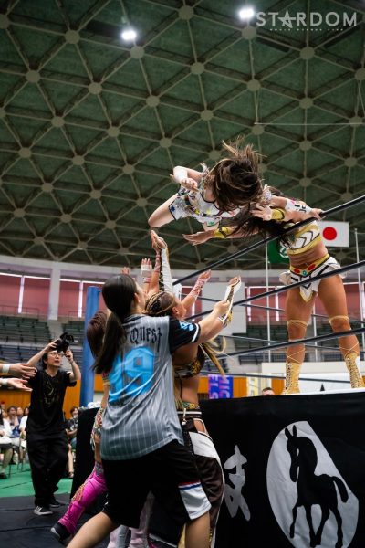 舞華「いやいや、優勝するのはこの私って決まってんだよ。優勝してベルト巻いたら逆指名してやるよ。楽しみにしてて。待て待て、帰るな。一歩戻ってこい。せっかくねえ、こんな暑いなかメインイベント引き分けで、一人で締めるのもよくないよねえ。どうせなら2人で締めたいよねえ。こんだけ大人数きたからちょっとやりたいことあって。私の掛け声に合わせてみんなは『すがすがしいぜ!』(と叫ぶ)。みんなですがすがしく帰りましょうよ。今日初めてだから成功させて帰りたいからさ、みんな腹の底から今日一の声出せるか!? オマエらが一番(「すがすがしいぜ!」)、スターダムが一番(「すがすがしいぜ!」)。なかでも一番舞華が(「すがすがしいぜ!」)。