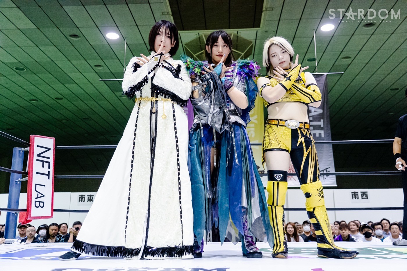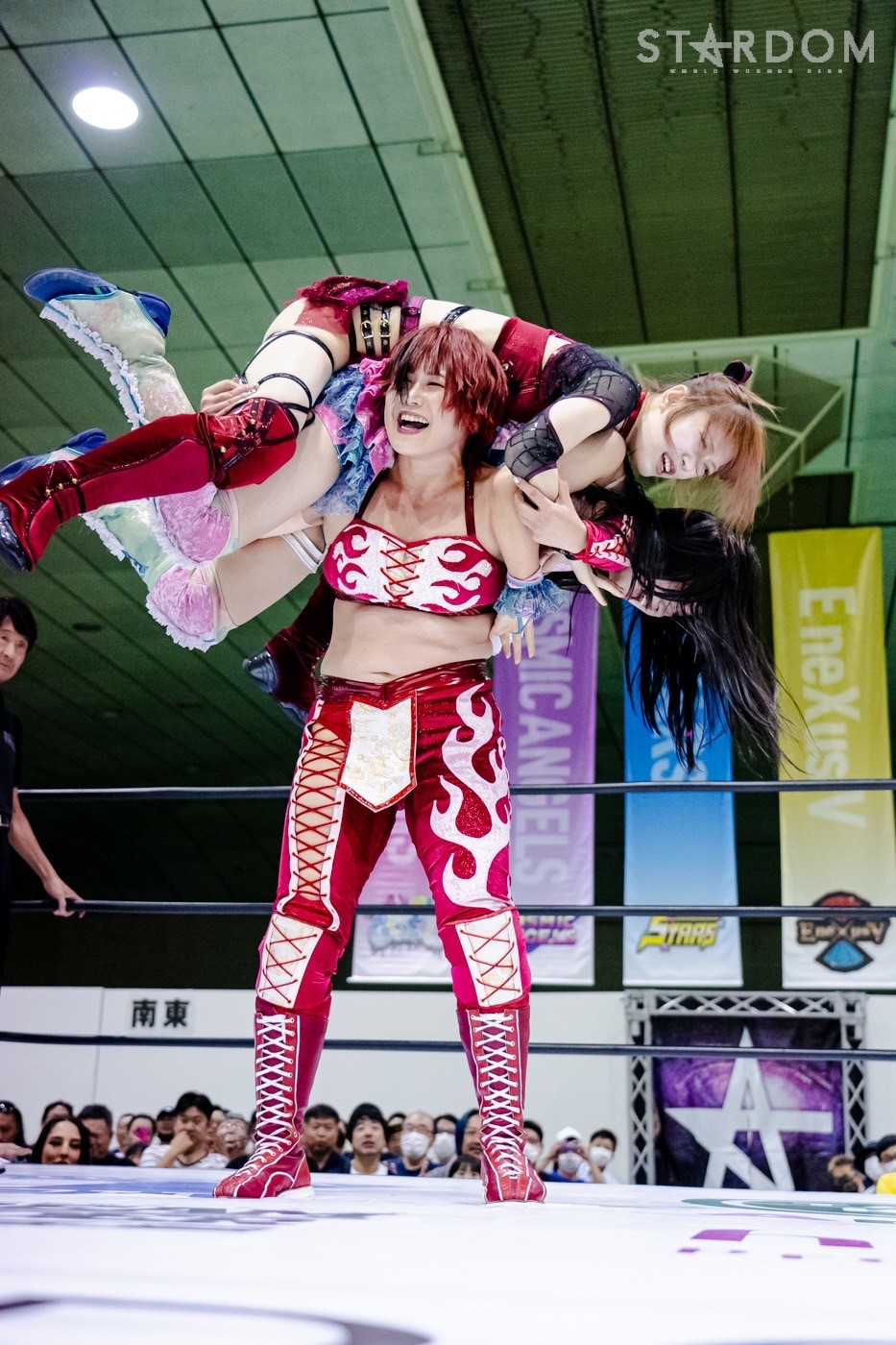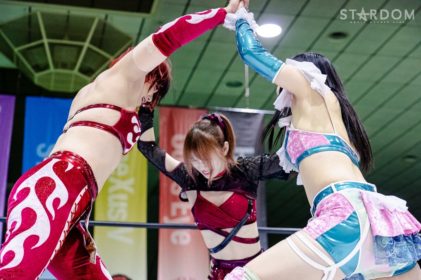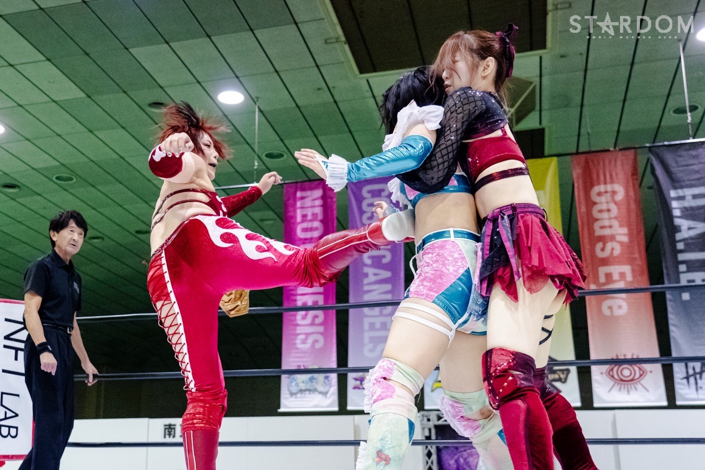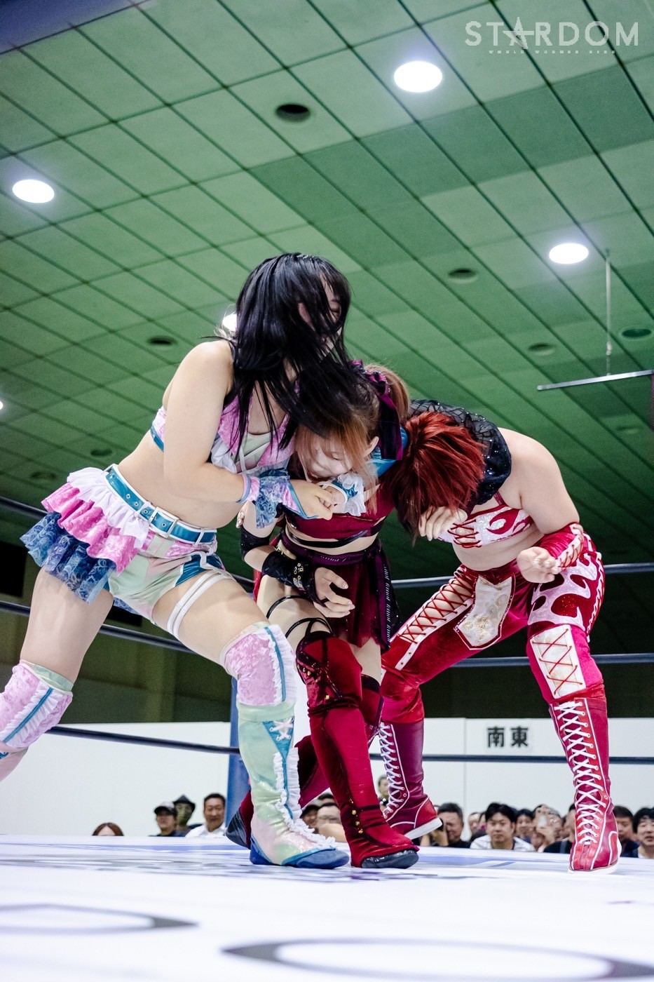 鹿島がレフェリーに「オマエ、ひいきすんなよ」と牽制。鹿島はレフェリーを気にしながら手四つの構えに加わる。力比べで鹿島と玖麗で押し込みにかかるが、鹿島だけが抜け出し後ろから舞華を押す。舞華が上になると鹿島が「玖麗をいじめるな!」とヘッドロック。玖麗が鹿島にヘッドロックをかけると舞華がまとめてロープに振る。鹿島が丸め込むと玖麗も丸め込みへ。鹿島が舞華のバックを取ると、舞華は「くるな」鹿島は「こい」、玖麗が困りながらも突進すると鹿島がフルネルソン。舞華はまとめて持ち上げコーナーに押し込む。舞華は串刺しラリアット、玖麗にショルダータックル、ボディースラム連発。玖麗は舞華のラリアットをかわしてドロップキック、ボディースラム狙い。鹿島がカットし玖麗とともにブレーンバスターを決める。玖麗は腰を押さえる鹿島を攻撃、鹿島は玖麗をコーナーに追い込むがかわされる。玖麗がドロップキックを鹿島に決める。玖麗の突進に玖麗が舞華を差し出す。鹿島が玖麗をカバーすると舞華がカット。鹿島が舞華に起死回生狙いも阻止される。鹿島が舞華を押さえ込む2カウント。鹿島は玖麗に「のぼれ!」と指示。鹿島が舞華を押さえ玖麗がミサイルキック。舞華がかわし鹿島に命中。玖麗は舞華にドロップキック。舞華が玖麗にブレーンバスターを狙うが切り返され、ネックブリーカーを食らう。玖麗は舞華にエルボー連打、舞華をかいくぐりスピアを決める。舞華が返すと、玖麗は不知火狙い。舞華が切り返し、パワースラム、スライディングラリアット。玖麗が返すと舞華はフィニッシュを予告して山茶華。そこに鹿島がコルバタ、その勢いで玖麗に覆いかぶさり押さえ込むと3カウントが入った。試合後の鹿島は客席に向かい照れ笑い。舞華が詰め寄ると鹿島が逃走。しかし舞華が捕まえ、鹿島を担いで退場した。