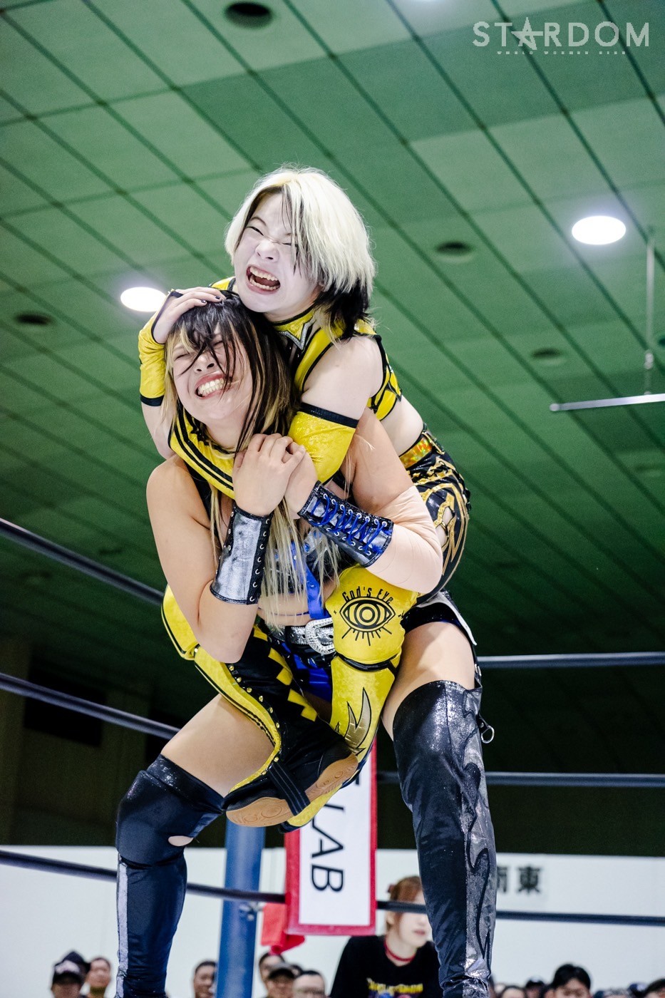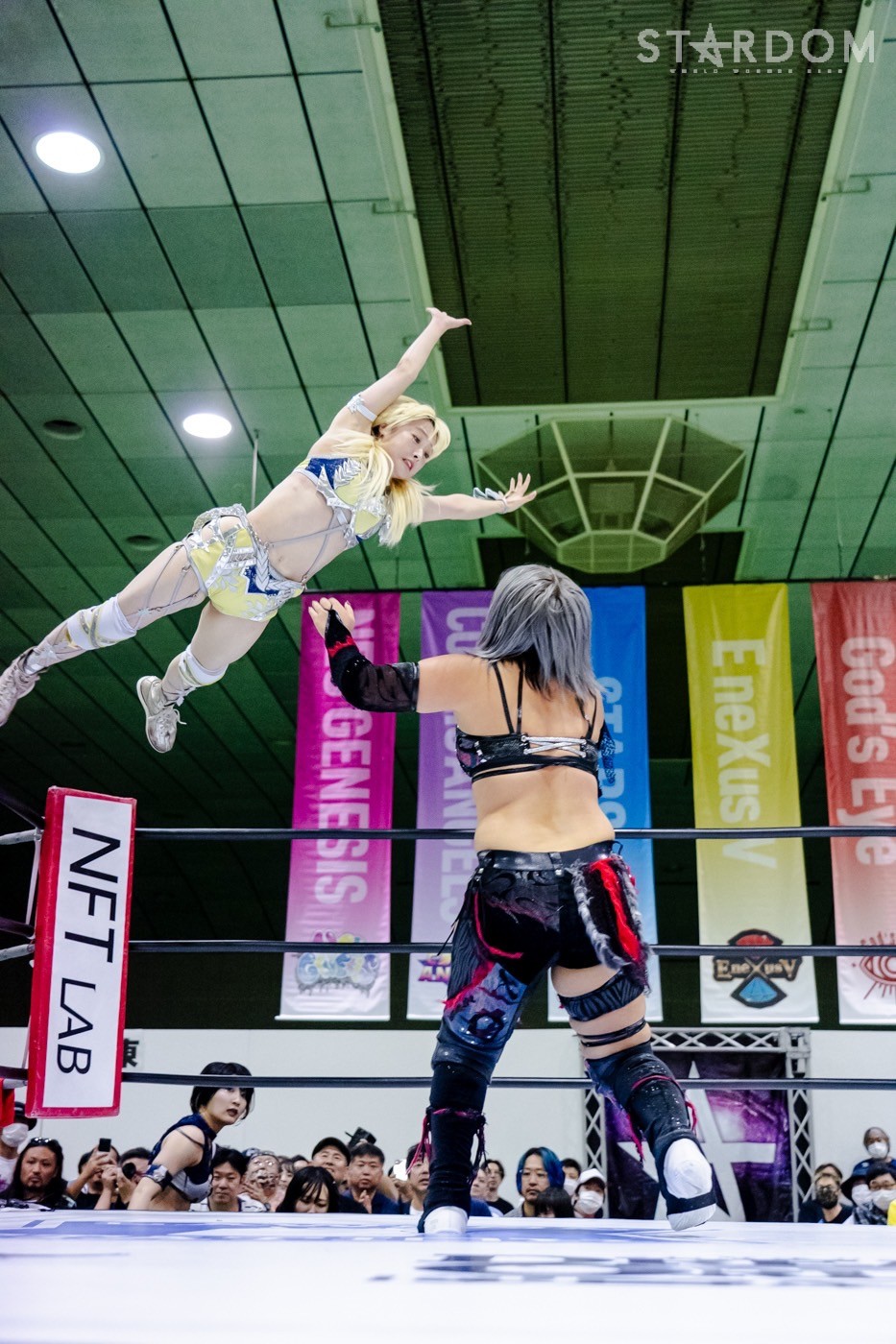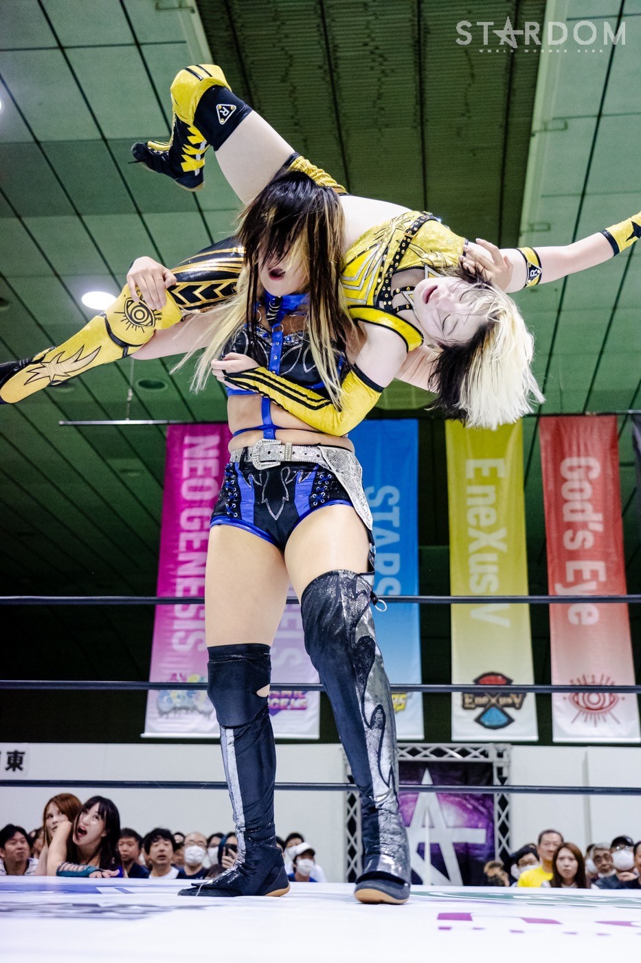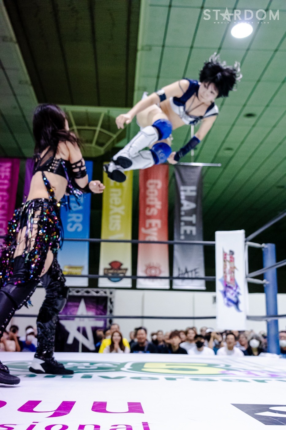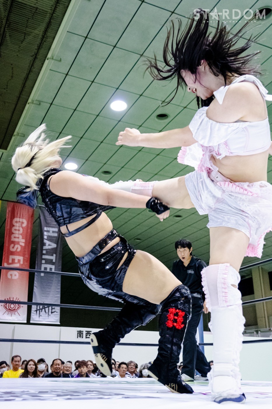 HANAKOが先発に名乗りを上げると、ゴッズアイからはレディが出てくる。ロックアップからレディがヘッドロック。HANAKOがロープに振ると、ショルダーをぶつけ合う。レディがHANAKOを走らせ、ショルダーが交錯。HANAKOがレディを走らせショルダータックルを決める。月山がレディにヒップバット連打。レディが月山のクロスボディーをキャッチして、ジャイアントスイングに移行し10回転。レディが押さえ込みの連続。月山が返すがレディがコブラツイスト。ゴッズアイがサブミッションで競演しカットさせず。レディは自軍コーナーに追い込み逆水平。朱里が月山にサッカーボールキック連打。月山が返すと、朱里はコーナーに追い込み串刺しニーアタック。朱里は「ケツそんなもんか?」「きかねえぞ」と月山のエルボー連打に仁王立ち。朱里がビッグブーツでダウンさせ、ストンピング連打。月山がフェースクラッシャーを決め、ジーナに託す。ジーナが朱里に串刺しエルボー、変則的ロープワークからコルバタを決め、串刺しドロップキックへ。ジーナは朱里の蹴りをかいくぐり、ともに蹴り足をつかみ合う。ジーナの突進をかわして朱里がドロップキック、フロントネックチャンスリードロップ、サッカーボールキック。八神がジーナにドロップキック連打、ミドルキック連打。ジーナがしのいでスープレックス。HANAKOが八神へショルダータックル、アルゼンチンからコーナーに叩きつけ串刺しボディーアタック、ニードロップ。八神が返すと、HANAKOがコブラクラッチ狙い。しかしゴッズアイがカットする。朱里、レディが次々とショルダータックル、八神がミドルから三角絞め。HANAKOが持ち上げコーナーに叩きつける。八神はHANAKOの突進をかわして串刺しハイキック。背中へのミドルキック。HANAKOが返すと、八神が腹部にニー、腕固め。HANAKOがエスケープすると八神がミドル、ジーナが八神を止めて旋回式サイドスラム。月山とジーナが合体プレス、HANAKOがその場跳びボディープレス。八神が返すと、HANAKOはフィニッシュを宣言してアルゼンチン。八神が切り返し丸め込む。HANAKOのビッグブーツをかわして八神がゼロ戦キック。10分経過。八神がハイキックもHANAKOがかわしてブレーンバスター。返した八神にHANAKOは白鷺。もち上げて締め上げると八神がギブアップした。