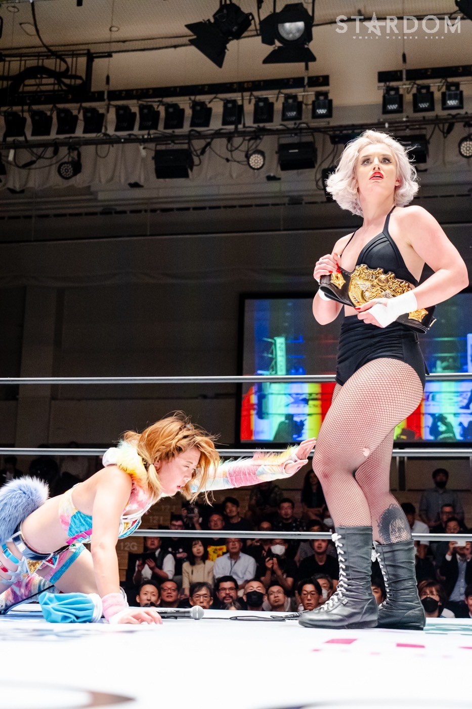 トニー「オフコース。よくおぼえてらっしゃい。すぐに、名古屋で、私がIWGP女子王者になるの。バカビッチのマユイワタニを倒してね。マユ、王者でいるのもすぐ終わりね。なぜなら、私がすぐに、“タイムレス”トニー・ストームがアナタからベルトを引っぺがすから。ユー、マユ、ビッチ! 名古屋はアナタにとって現の悪い場所。そこで私がアナタからベルトを奪う! OK。これで気分がよくなったわ。ゴメンナサイ。これ言って、だいぶ気持ちが落ち着いたわ。じゃあ、パーティータイムね。その前に少しスペシャルなマッサージを受けないといけないわ。じゃあ、行きましょう。行きましょう」