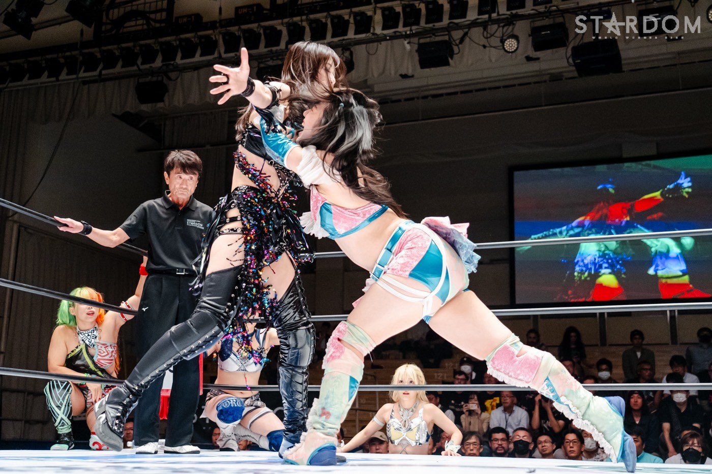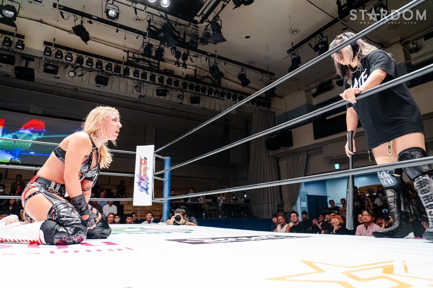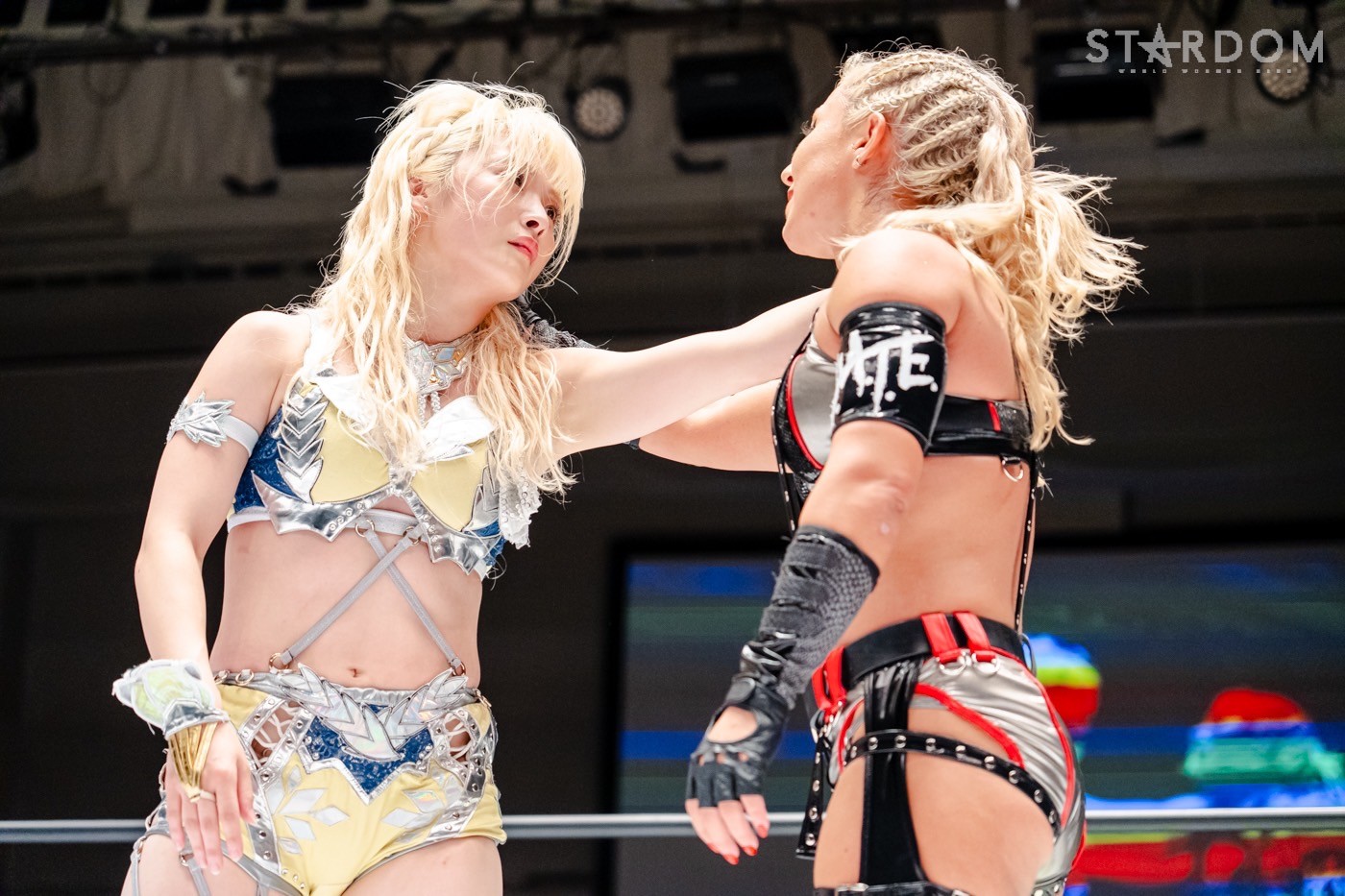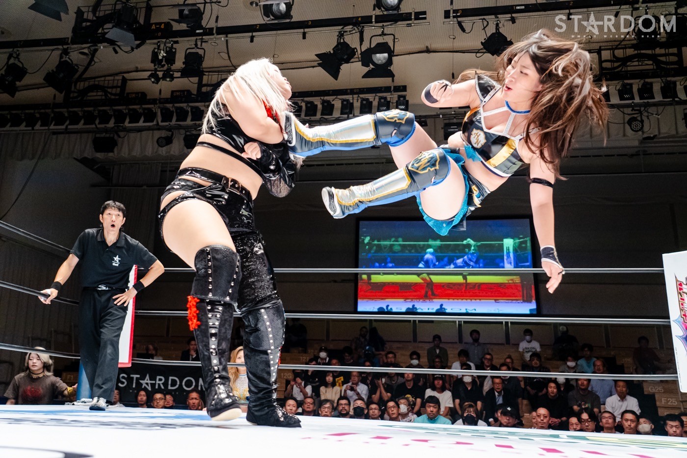 STARSのFWC葉月&コグマ組とネオジェネシスのスターライト・キッド&星来芽依組がタッグ対戦。10・5名古屋で一騎打ちをおこなう葉月とキッドには前哨戦。ワンダー・オブ・スターダム王座奪取失敗のショックから立ち直った葉月の闘いぶりが注目される。
