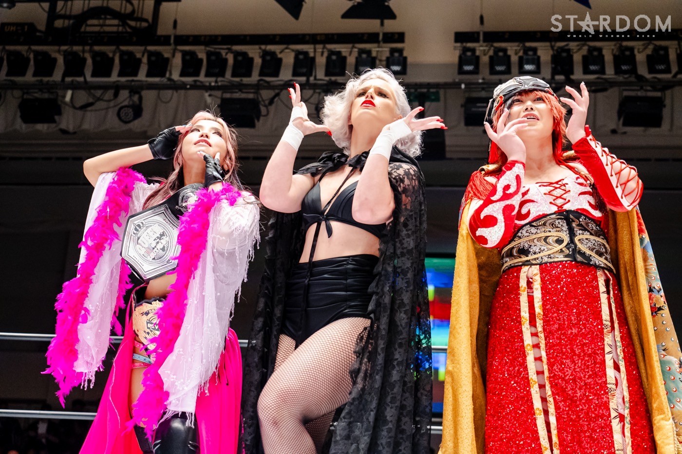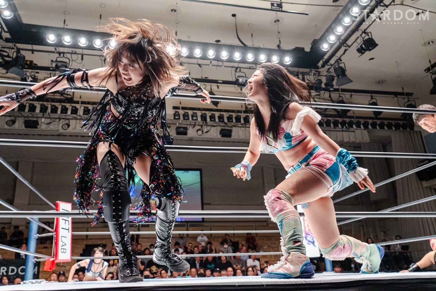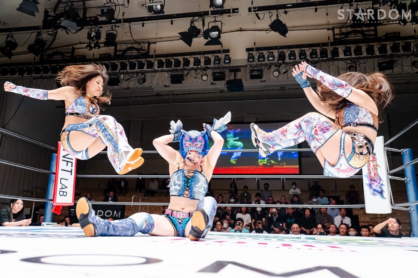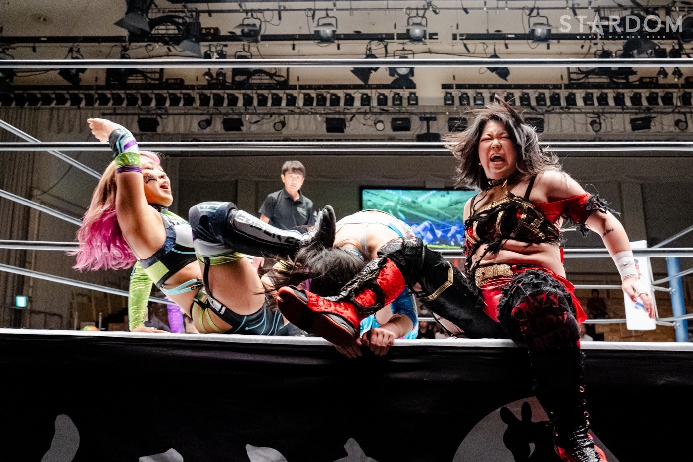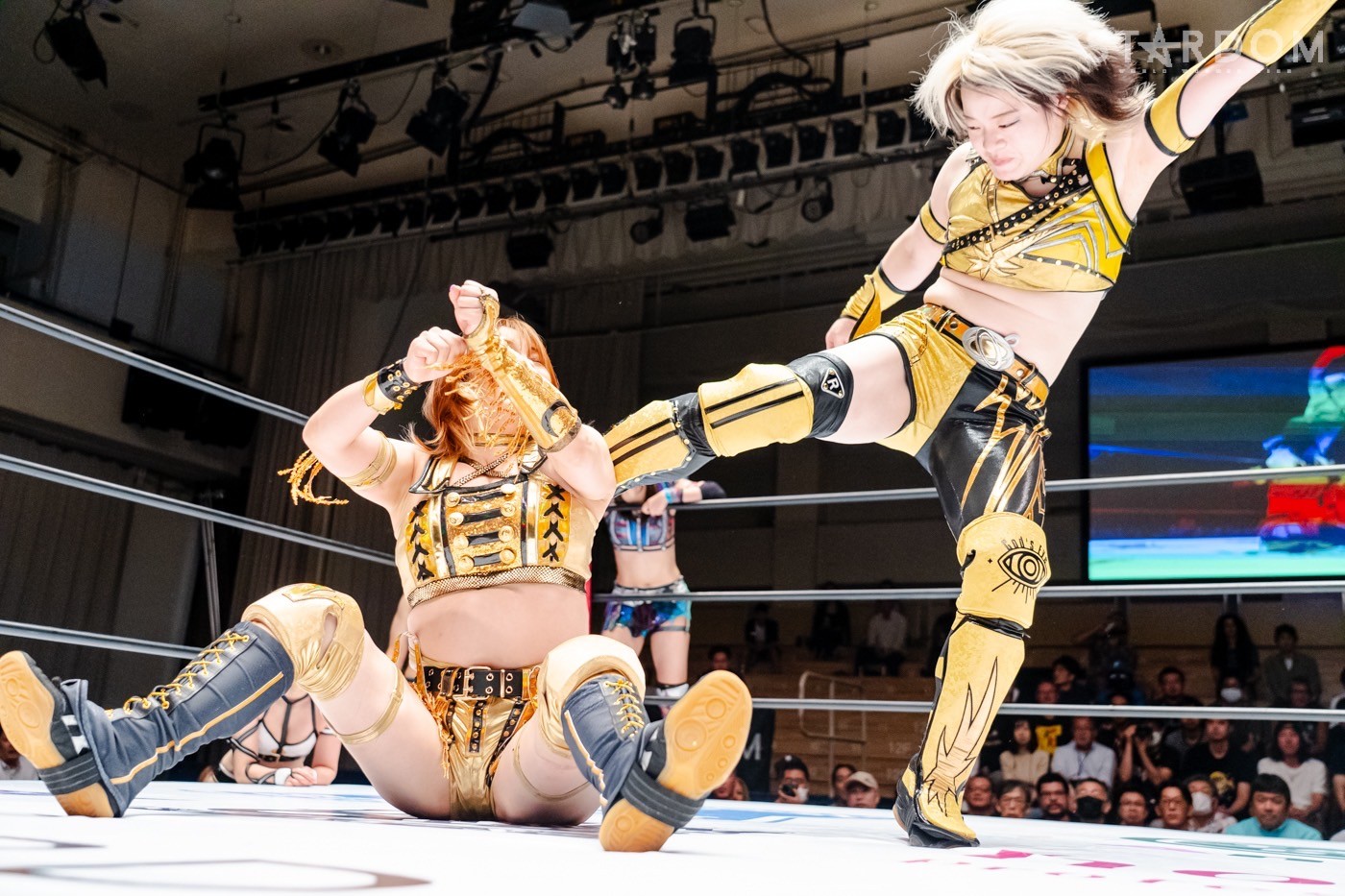 中野が鈴季に詰め寄りエルボーを見舞う。「おい、やり返せよ」とさらに詰め寄り中野がエルボー。鈴季が髪をつかんでグラウンドにもっていきスリーパー。中野が抜け出し、エルボーの応酬。鈴季がエルボー連打からサッカーボールキック。中野がかわすと、鈴季も蹴りをかわして視殺戦。AZMとさくらが入り、AZMがドロップキック、串刺しドロップキック。AZMのカバーをさくらが返す。AZMと鈴季がさくらを捕獲し、リング下から顔面蹴りの挟み撃ち。さくらが返すと、鈴季にドロップキックを決める。中野が鈴季にニーアタックで場外に転落させる。中野もリング下に出て突進するが、カウンターのトラースキックを浴びる。鈴季は中野を連行し南側客席へ。リンスサイドではAZMとさくらがやり合う。鈴季の蹴りで中野が階段を転落。鈴季は中野をリングに戻しバズソーキックの3連打。中野が起き上がるがもう一発食らう。中野が返すと、鈴季がジャーマン。中野もジャーマンからスピンキック。タイガースープレックスも決めるが鈴季がすぐに返してテキーラショット。中野もすぐに返してエルボーを打ち合い、ハイキックが交錯。さくらがAZMにドロップキックの連打、AZMの蹴りをかわして、さくらがもう一発。さくらは中野を呼び込み、キックのサンドイッチ攻撃。さくらは串刺し後ろ回し蹴りからカバーするが、AZMが返す。さくらは三角絞めも、AZMがエスケープ。AZMがさくらの突進をかわし、鈴季と串刺し攻撃、ドロップキックの挟み撃ち。AZMがミサイルキックをヒットさせるが、中野がカット。AZMのブレーンバスター狙いをさくらがこらえてミドルキック、AZMはエルボー連打。「こんなもんか」と挑発されたさくらがミドルキック、AZMがブレーンバスター。AZMがダイビングフットスタンプにいくがさくらがかわして中野がトラースキック、さくらが丸め込む。返したAZMがあずみ寿司、さくらが切り返して押さえ込む。AZMが返すと、さくらがカウンターのミドルから変型三角絞め。中野とさくらが合体を試みるが、鈴季がまとめてスピア、AZMと鈴季が合体でさくらを叩きつけると、AZMがダイビングフットスタンプ。中野のカットも間に合わず、AZMがさくらをフォールした。