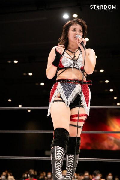 「桜井まい、チャレンジマッチ、桜井まいは覚悟を持ってこのスターダムのリングで輝くために来たんだと思います。なので、このリングに来たことが本人にとって、本当に正解だったと思えるようにこれから頑張ってほしいなと思うし、スターダムにはたくさんいろんなキャラが濃い選手がいます。そこでいまチャレンジマッチ、いろんな人と試合ができる。経験をたくさんつんで吸収して、何かをつかみ取ってほしいなと自分の中で、思います。自分のことなんですが、明日5★STAR、ウナギ・サヤカ、もう落とせません。必ず勝利します」