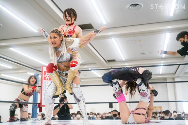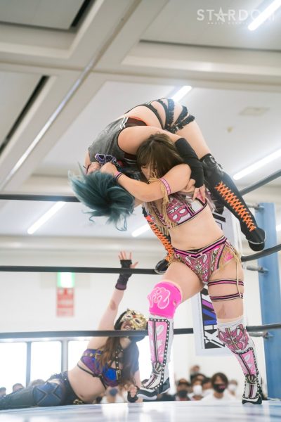 ドンナ・デル・モンドのジュリア&桜井まい組、COSMIC ANGELSの白川未奈&月山和香組、大江戸隊のスターライト・キッド&琉悪夏組が一度に対戦する3WAYタッグマッチ。予想不可能な組み合わせの中で、月山の初勝利にも期待がかかる。チームでの白星もない月山だけに、白川のリードがカギを握る。5★STAR GPではともに前日白星を挙げたジュリア&桜井組が精神的には優位か。とはいえ大江戸隊がセコンドもまじえた闘いで勝利をかっさらう可能性も大いにある。はたして、最後に笑うのはどのチームか。