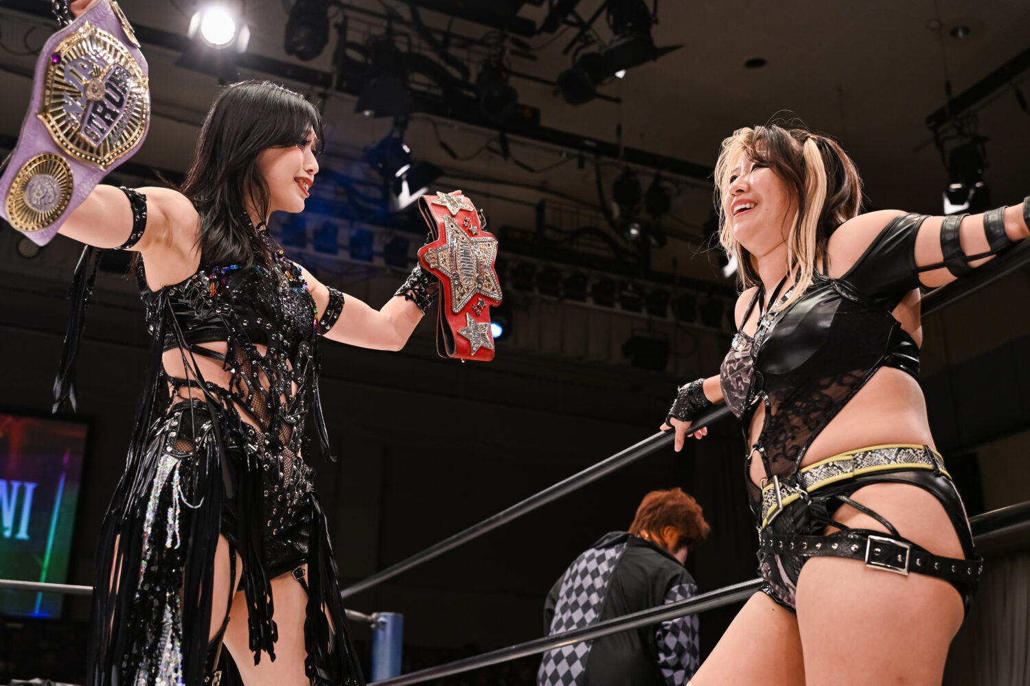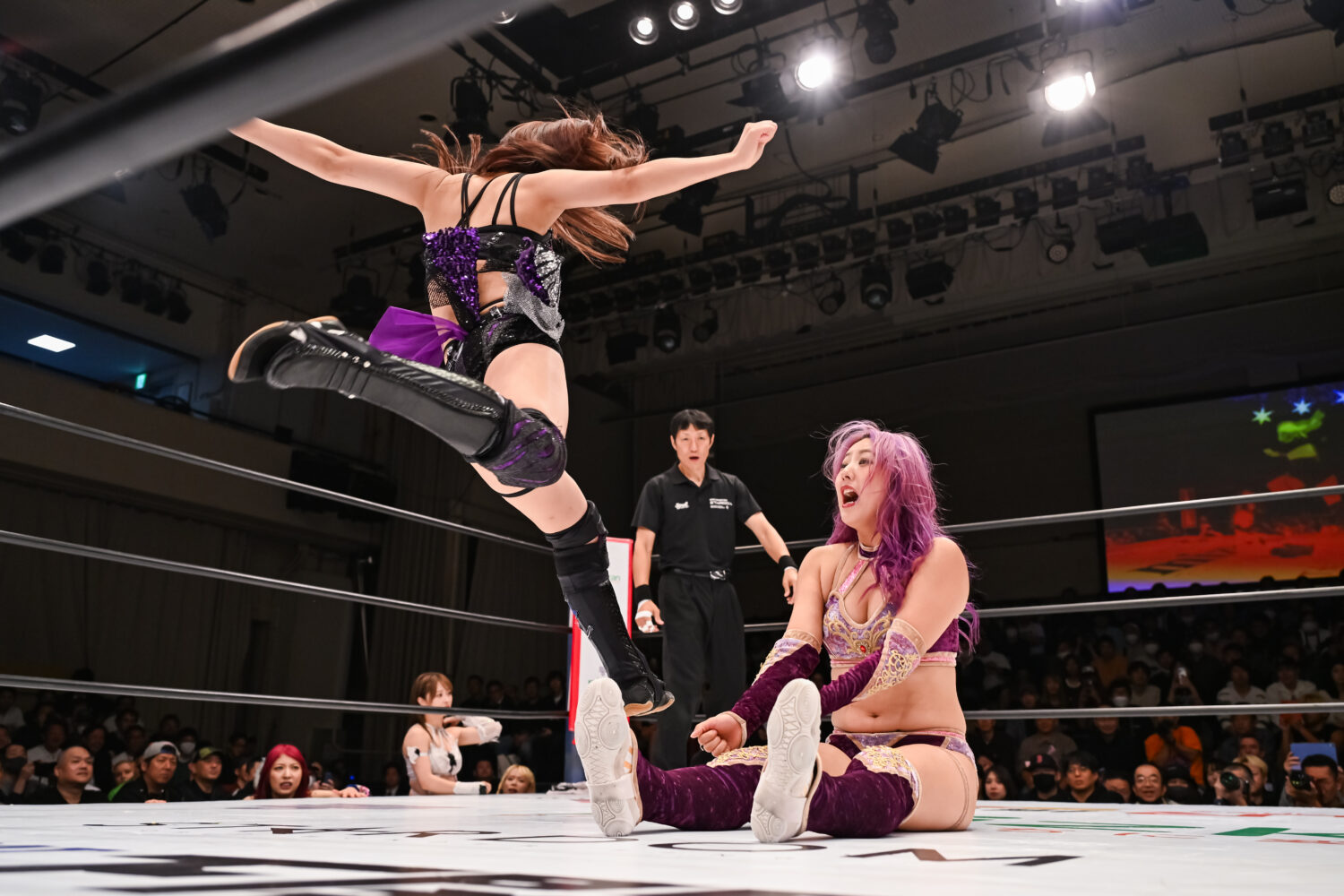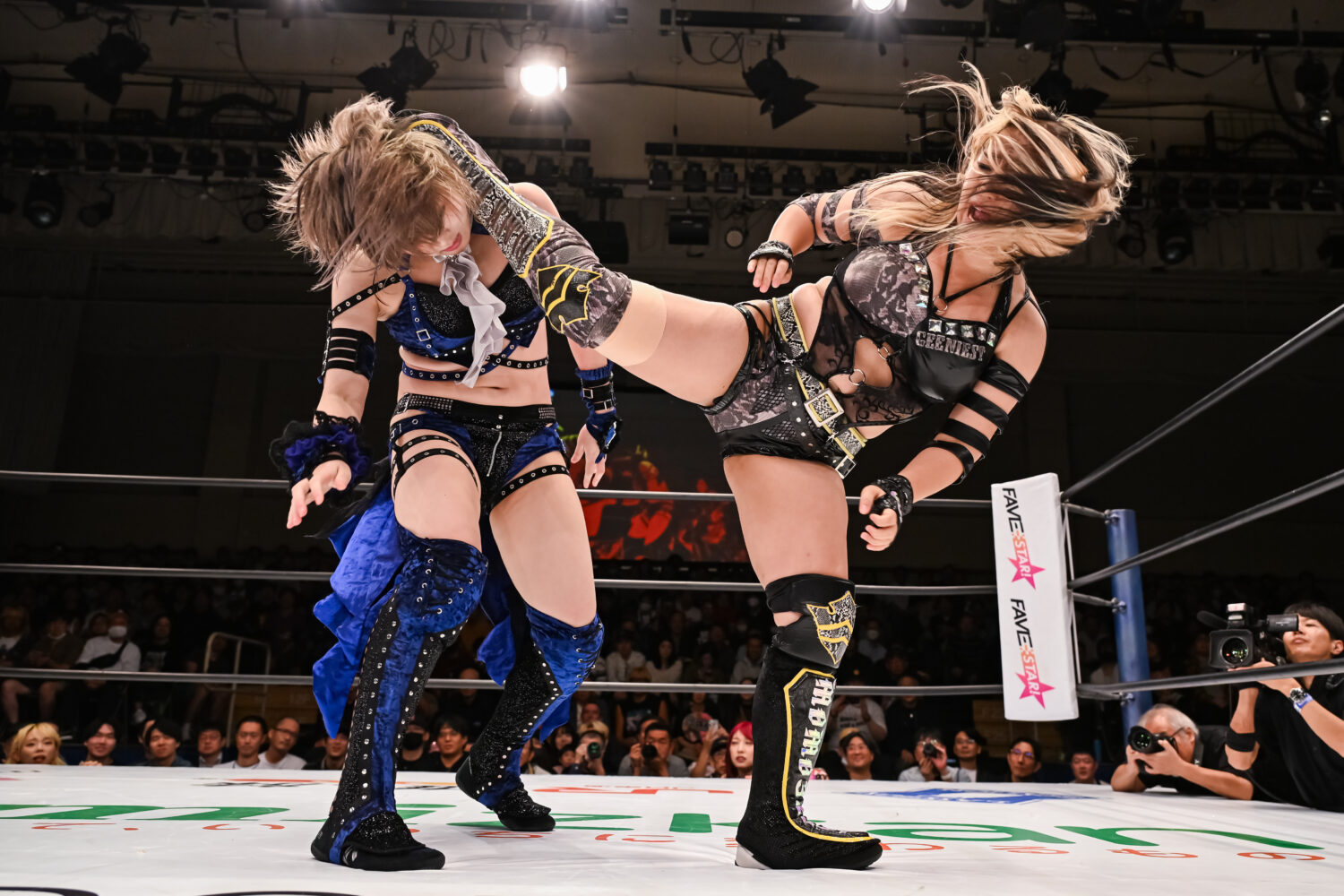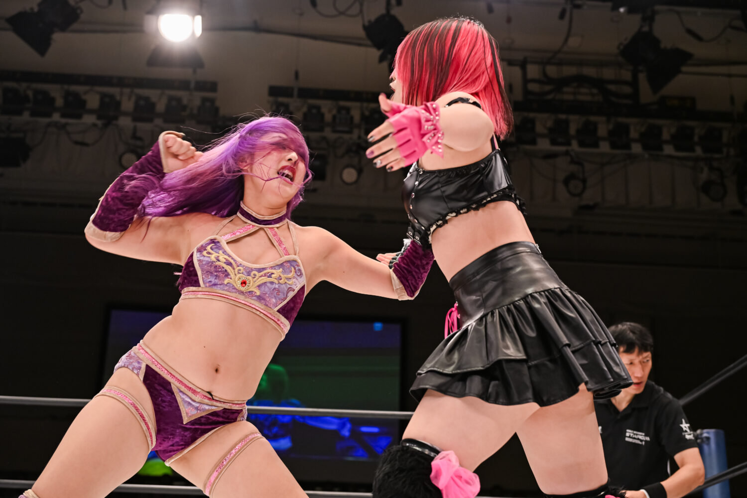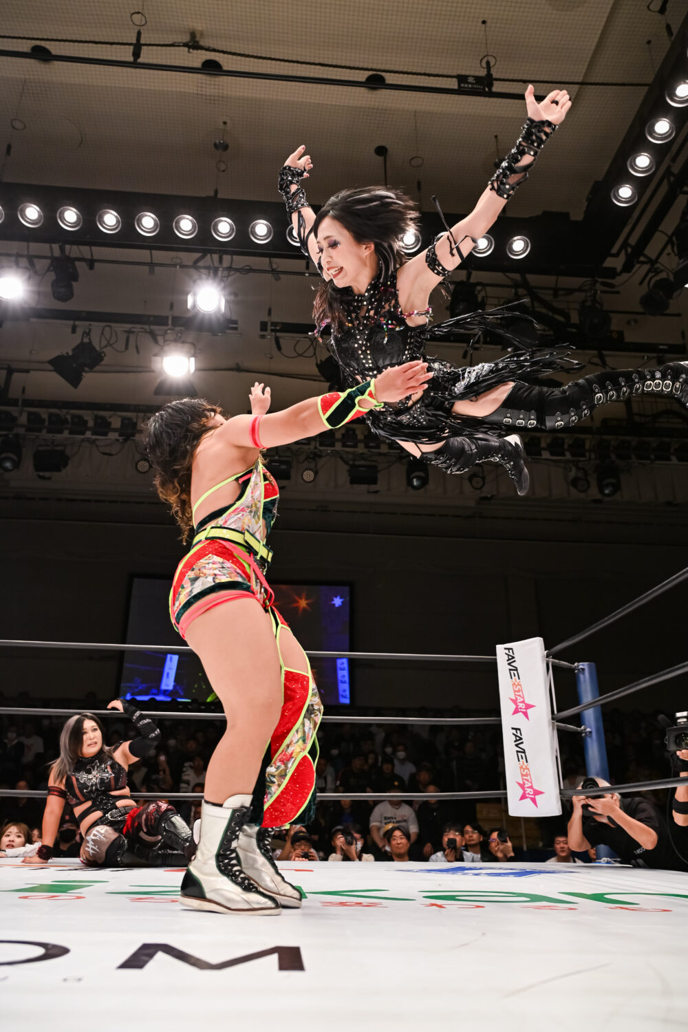 STARSの飯田沙耶&向後桃&姫ゆりあとコズミックエンジェルズのなつぽい&安納サオリ&水森由菜が合体し、H.A.T.E.の上谷沙弥&小波&吏南&フキゲンです★&渡辺桃&稲葉あずさ組と12人タッグマッチで対戦。スターダムの正規軍的立場にあるSTARSとコズエンの合体で、打倒H.A.T.E.達成なるか? それともワールド・オブ・スターダム&STRONG女子2冠王の上谷を要するH.A.T.E.が2つのユニットを同時に粉砕してみせるか? 上谷の2冠に同門対決で挑む桃との関係は?