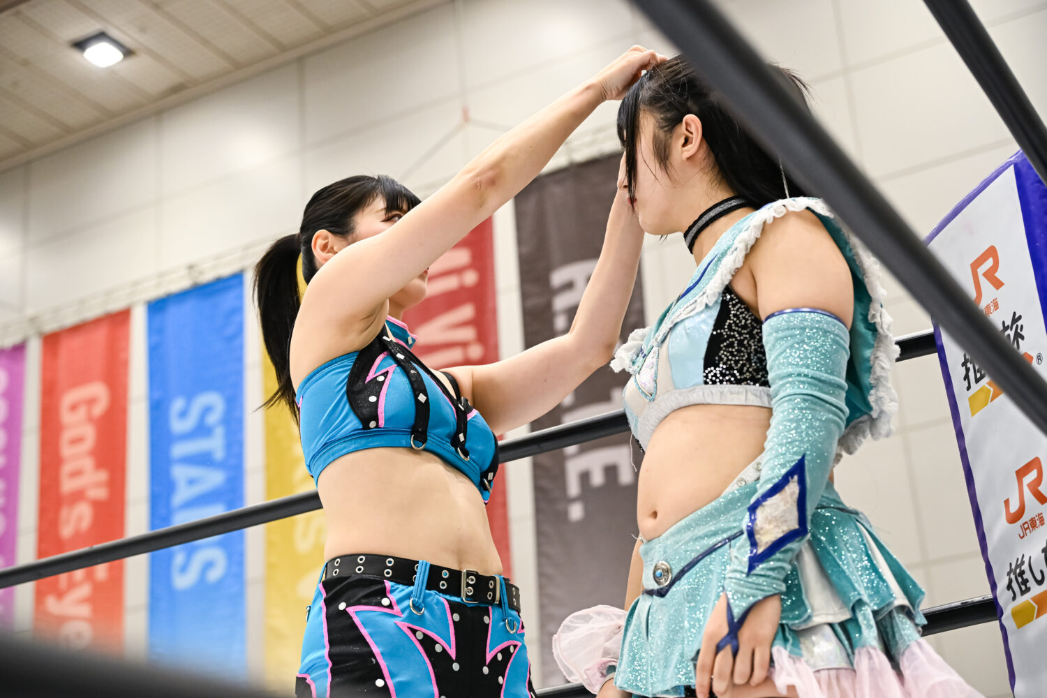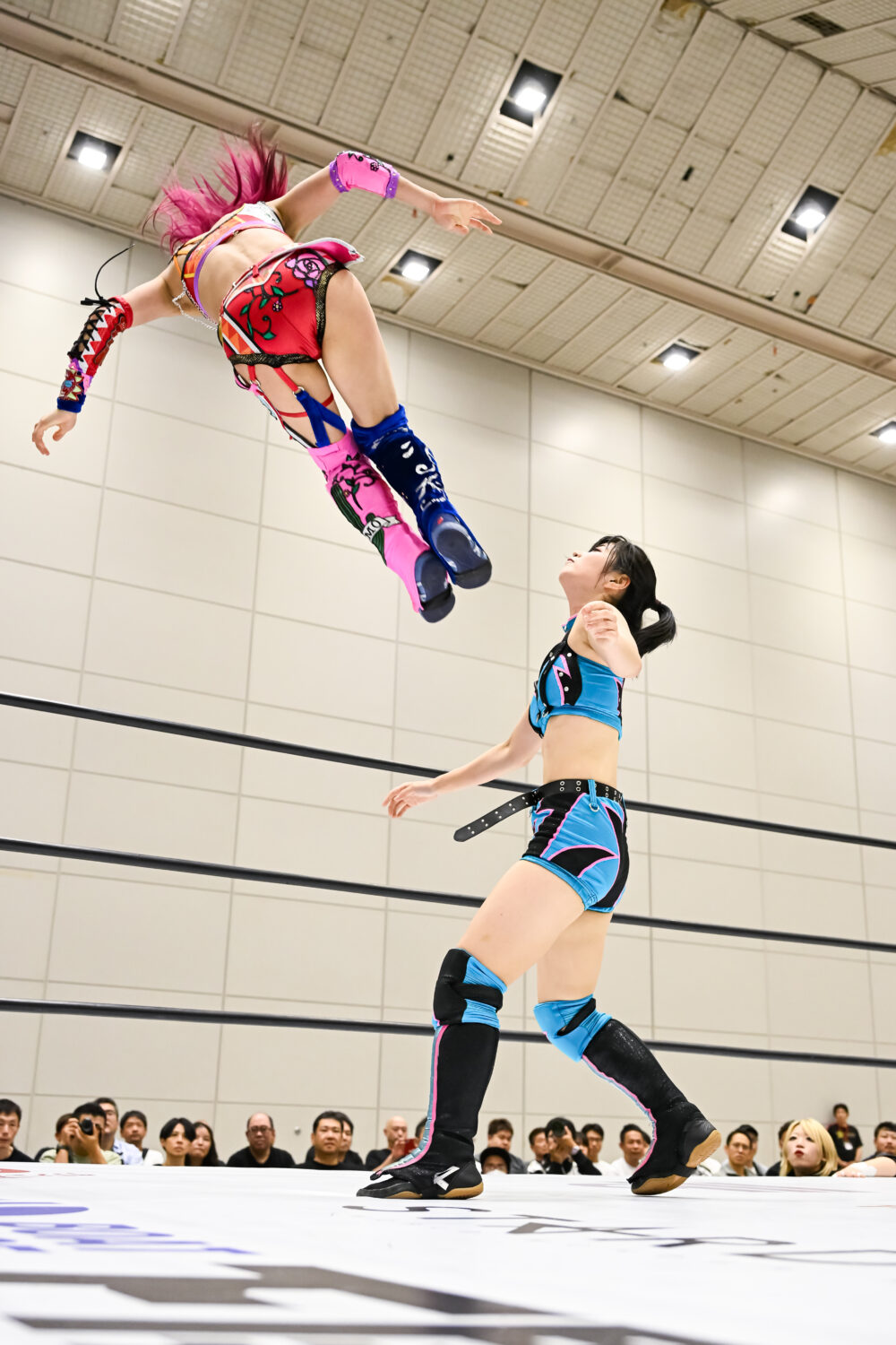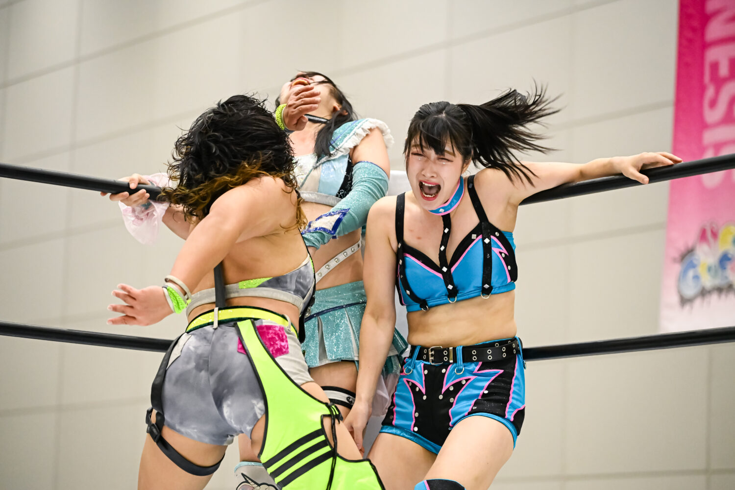 玖麗が名乗りを挙げると、「かわいい方」と飯田が先発に立候補。ロックアップで組み合うと飯田が「もっとこいよ!」と挑発。飯田が腕を取りヘッドロックへ。玖麗がロープに振るが、飯田はドロップキックをかわす。しかし、玖麗が決めてみせる。向後が乱入して連係で攻撃、ドロップキックの挟み撃ち。玖麗が返すと、飯田が逆水平連打。さくらがカットに入り玖麗と合体を試みる。しかし、飯田がまとめてチョップの餌食にしてみせる。「まだまだ!」と飯田ロケットを玖麗に発射。玖麗が逆水平を連打するが、飯田は胸を突き出して受けて立つ。そして飯田が「チョップはね、こうやって(打つんだよ)」と逆水平。しかし、玖麗がドロップキックを放ち、さくらに託す。さくらが突進すると向後が阻止して合体。しかし、玖麗が飯田にドロップキック、串刺し攻撃、2方向からミサイルキック。さくらが飯田をボディースラム。飯田が返すと、カウンターのジャンピングチョップ。向後がさくらへドロップキック。619はさくらがかわすが、向後がダイビングボディーアタックから桃絞り100%。さくらと玖麗が向後にダブルのドロップキック、さくらがサッカーボールキック、ミドルキック連打。向後が受けて立ち、蹴り足にエルボー。しかし、さくらがカウンターでミドルキック。飯田が乱入して向後の619を引き出す。向後はスワンダイブ式ミサイルキック。返された向後は予告してネクターピーチの構え。さくらが切り返して丸め込む。向後が返してトラースキック、脚を取っての変型バックドロップからカバーする。さくらが返すと、フィッシャーマン。しかし、飯田のカットが間に合う。玖麗のスピアからさくらが足を取って丸め込む。さくらのさくらっちで3カウントが入り、向後がフォールを奪われた。