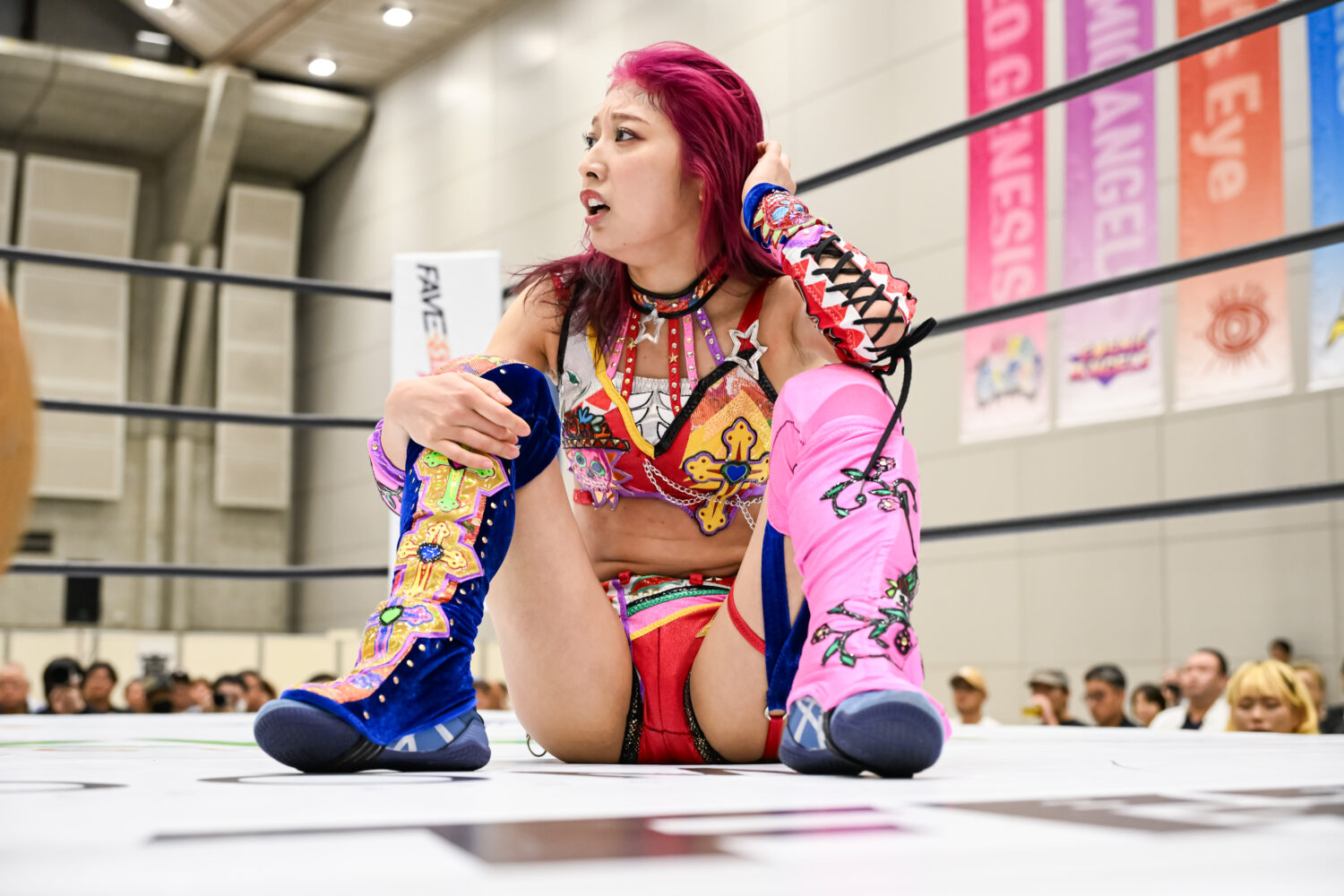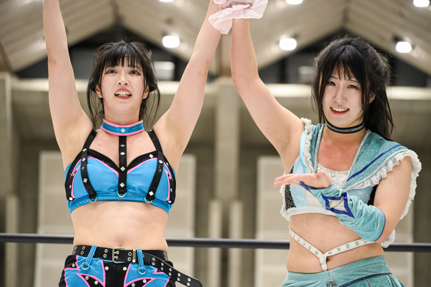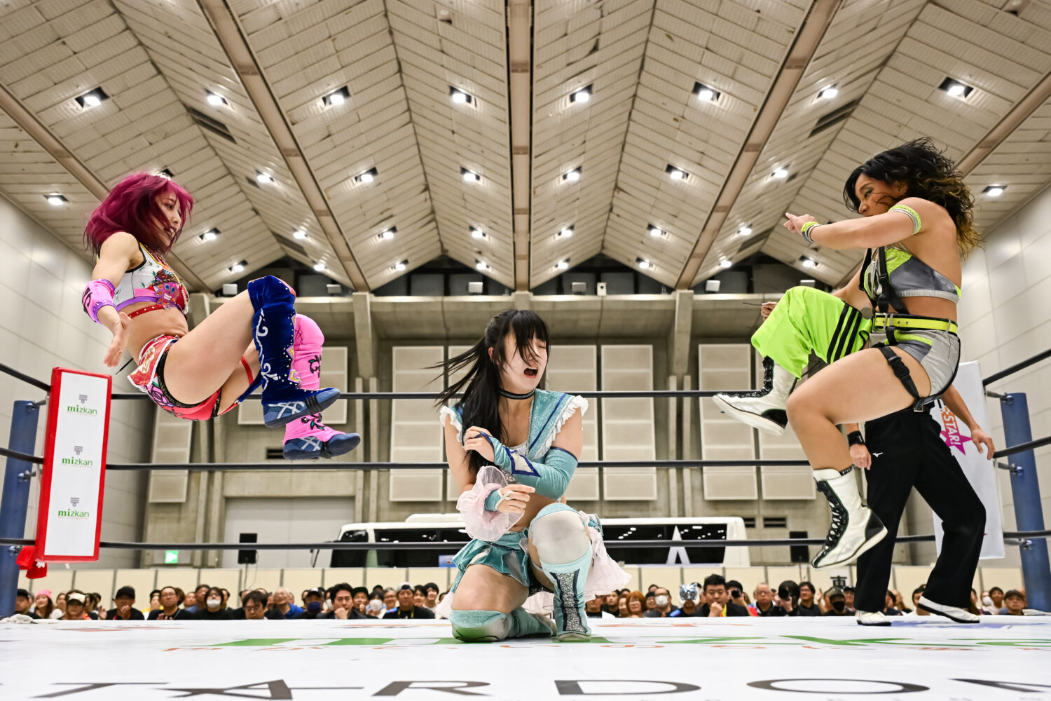玖麗が名乗りを挙げると、「かわいい方」と飯田が先発に立候補。ロックアップで組み合うと飯田が「もっとこいよ!」と挑発。飯田が腕を取りヘッドロックへ。玖麗がロープに振るが、飯田はドロップキックをかわす。しかし、玖麗が決めてみせる。向後が乱入して連係で攻撃、ドロップキックの挟み撃ち。玖麗が返すと、飯田が逆水平連打。さくらがカットに入り玖麗と合体を試みる。しかし、飯田がまとめてチョップの餌食にしてみせる。「まだまだ!」と飯田ロケットを玖麗に発射。玖麗が逆水平を連打するが、飯田は胸を突き出して受けて立つ。そして飯田が「チョップはね、こうやって(打つんだよ)」と逆水平。しかし、玖麗がドロップキックを放ち、さくらに託す。さくらが突進すると向後が阻止して合体。しかし、玖麗が飯田にドロップキック、串刺し攻撃、2方向からミサイルキック。さくらが飯田をボディースラム。飯田が返すと、カウンターのジャンピングチョップ。向後がさくらへドロップキック。619はさくらがかわすが、向後がダイビングボディーアタックから桃絞り100%。さくらと玖麗が向後にダブルのドロップキック、さくらがサッカーボールキック、ミドルキック連打。向後が受けて立ち、蹴り足にエルボー。しかし、さくらがカウンターでミドルキック。飯田が乱入して向後の619を引き出す。向後はスワンダイブ式ミサイルキック。返された向後は予告してネクターピーチの構え。さくらが切り返して丸め込む。向後が返してトラースキック、脚を取っての変型バックドロップからカバーする。さくらが返すと、フィッシャーマン。しかし、飯田のカットが間に合う。玖麗のスピアからさくらが足を取って丸め込む。さくらのさくらっちで3カウントが入り、向後がフォールを奪われた。
