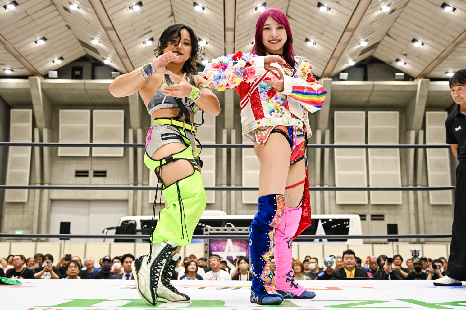STARSの飯田沙耶&向後桃組とコズミックエンジェルズのさくらあや&玖麗さやか組によるタッグマッチ。クリーンな攻防が期待されるなか、勝ち名乗りを受けるのは?