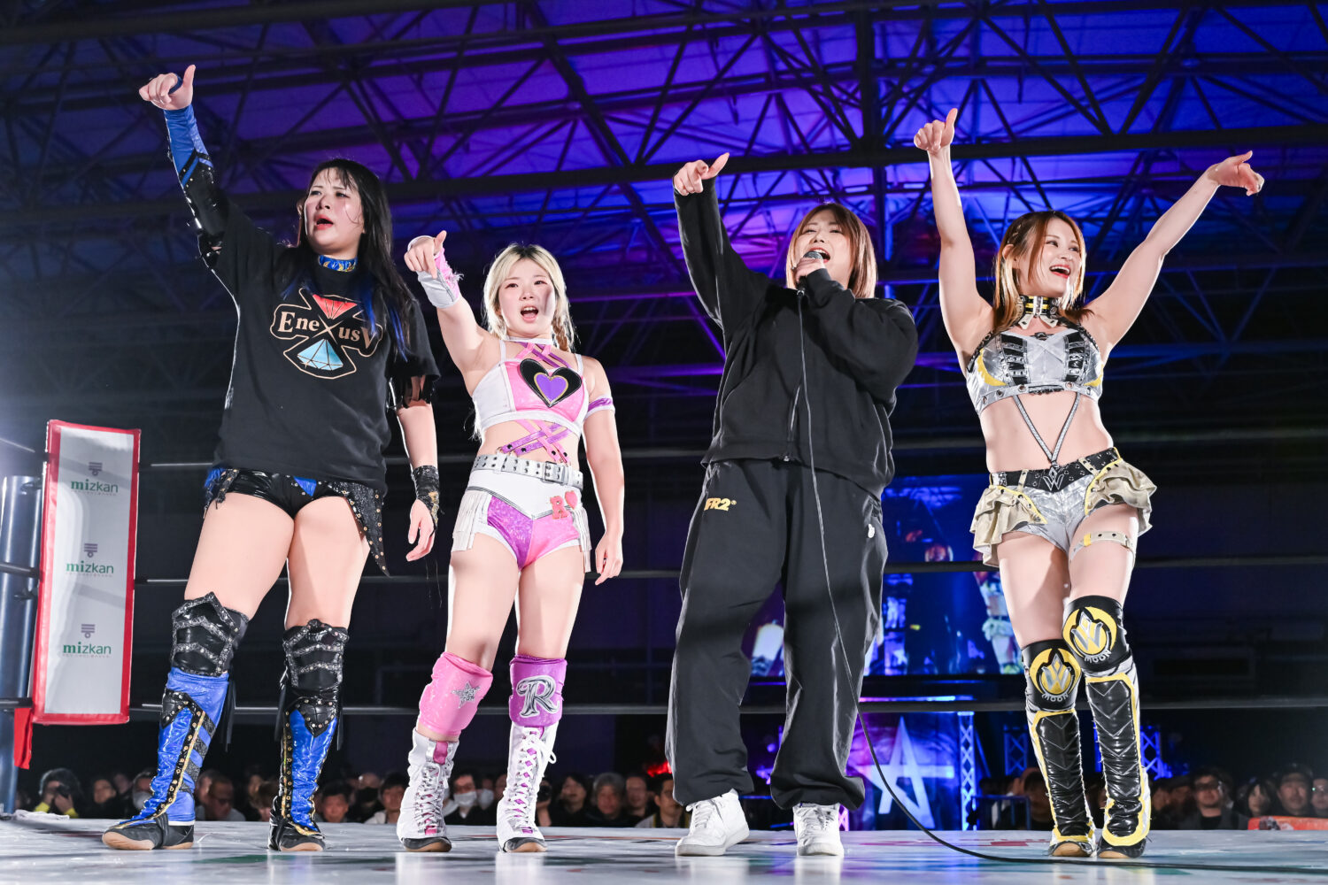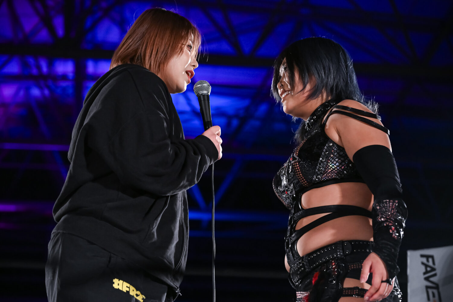 吏南と小波が月山と梨杏を暴行。すると舞華がリングに駆け込み、マイク。
