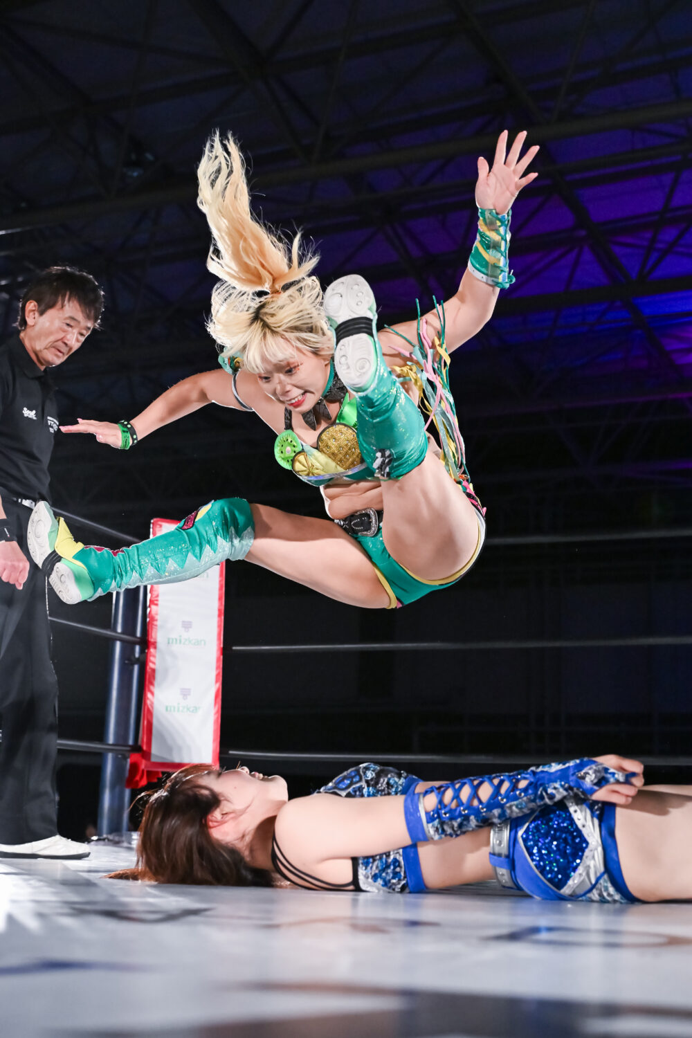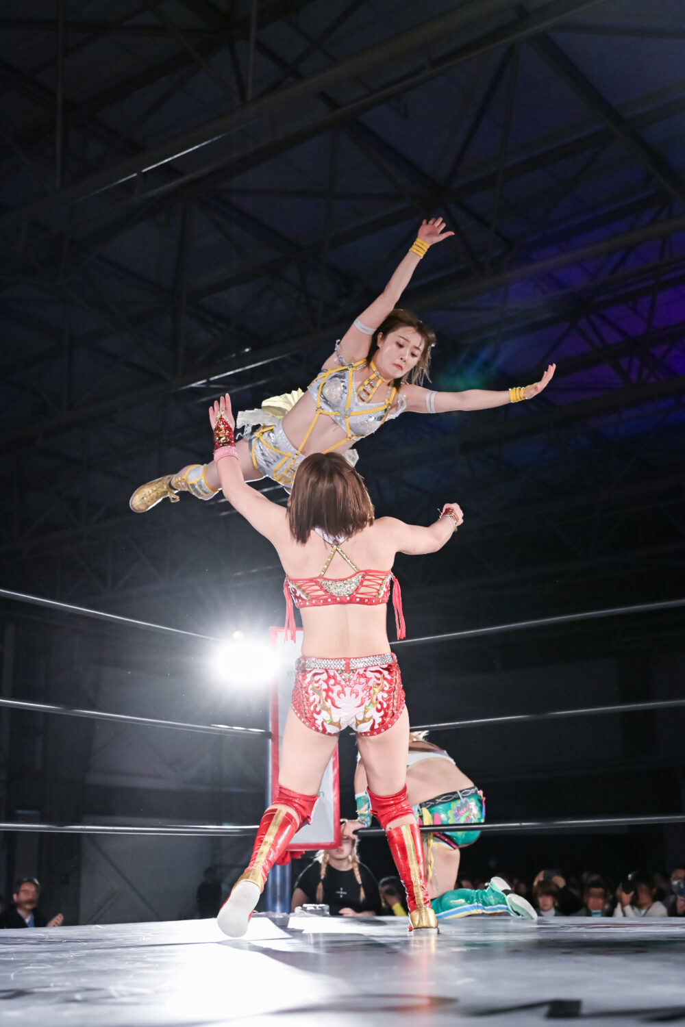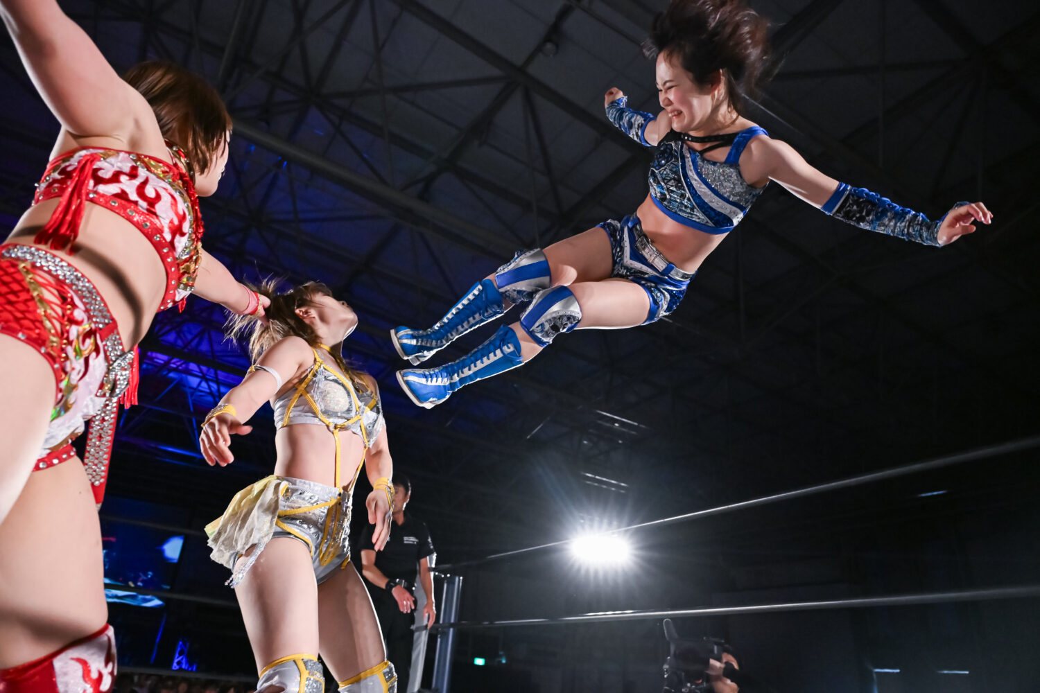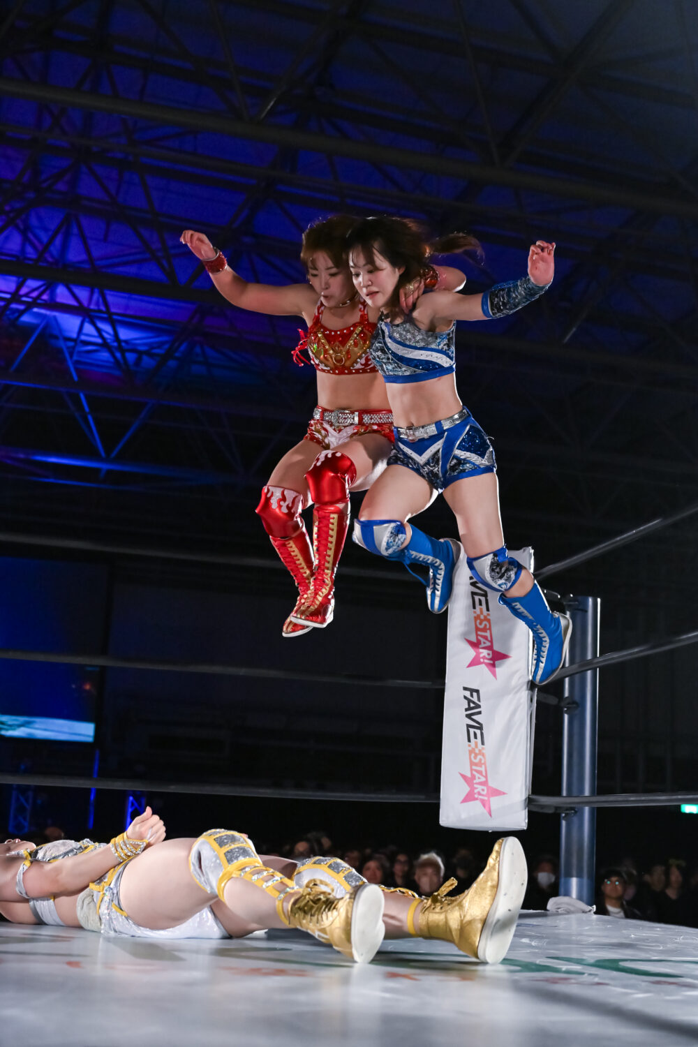 叶が手を上げるとSareeeが抑えてなつぽいと睨み合う。水森がSareeeを指名も、叶がドロップキック。丸め込みの応酬から、叶のドロップキックをかわして水森がドロップキックを決める。水森は控えのSareeeにエルボー。なつぽいが控えのSareeeに向かっていく。Sareeeはリングを下りる。なつぽいが叶にドロップキック。水森が叶にボディースラム、片足でカバーし、返されるとギロチン3連打。叶が返してエルボー連打。水森がコーナーに追い込むが、叶が反転してボディーアタック。Sareeeが水森にミサイルキック、フィッシャーマン。水森が返すと、Sareeeのダイビングフットスタンプをかわしてエルボー。Sareeeもエルボーをやり返す。エルボーの応酬から水森がラリアット連打。至近距離からのラリアットも連打すると、スライディングラリアットへ。なつぽいがタッチを申し出てSareeeへダイビングボディーアタック、ワキ固め、右腕を蹴り上げる。ジャーマン狙いをこらえられたなつぽいがエルボー、バックキック、ネックブリーカー。Sareeeが返すと、なつぽいがコーナーへ。叶が止めてSareeeが雪崩式ブレーンバスター。しかし、なつぽいが返してみせる。叶がなつぽいへミサイルキック。なつぽいがトラースキックも、Sareeeがエプロンで妨害し、ドロップキック。Sareeeと叶がダブルでコーナーへ。水森が止めて、ダブルでデッドリードライブ。なつぽいがドロップキックからフィニッシュを宣言し叶のバックを取る。叶が切り返すがトラースキックを食らう。なつぽいがフィニッシュを宣言してフェアリアルギフト。叶がかわしてSareeeがフットスタンプ。なつぽいの丸め込みを叶が返す。Sareeeと叶がダブルでダイビングフットスタンプ、叶がダイビングサマーソルトドロップ。なつぽいが返すと、ポイ捨てジャーマン、水森がラリアット、なつぽいがジャックナイフ。返した叶になつぽいはフィニッシュを宣言してフェアリアルギフトを決める。しかし、Sareeeのカットが間に合う。水森がSareeeにラリアット、なつぽいがフェアリアルリングで叶をフォールした。