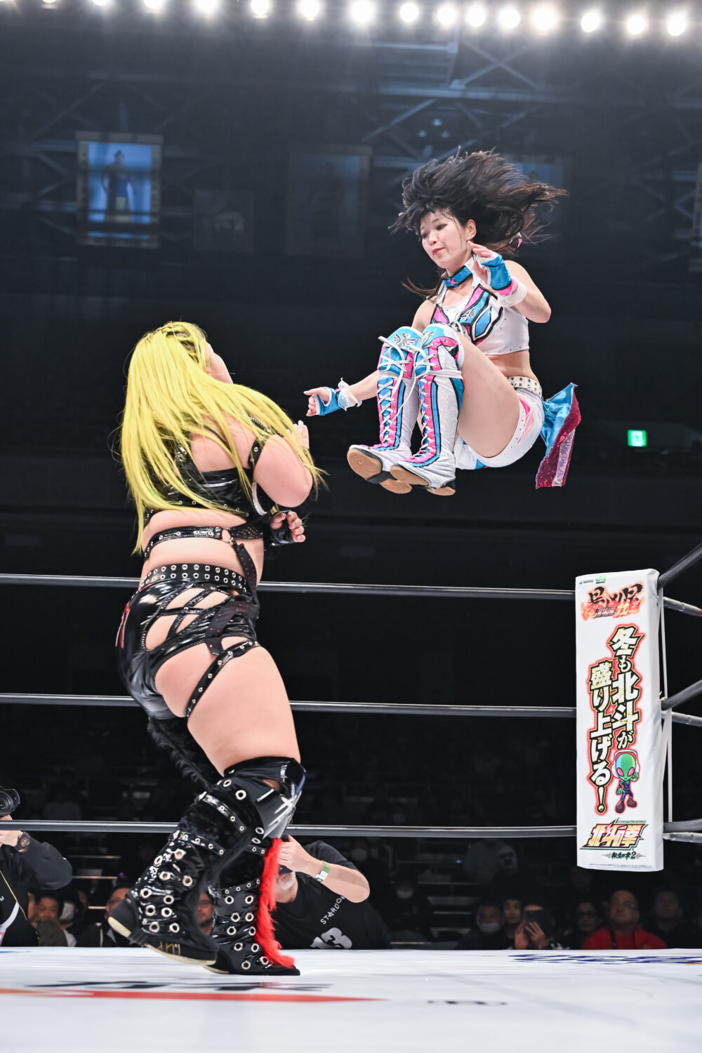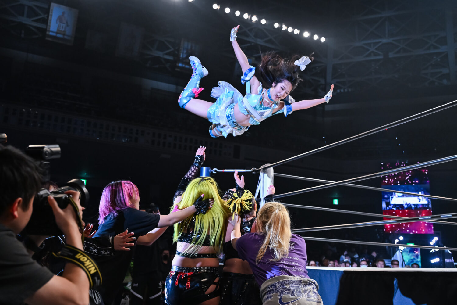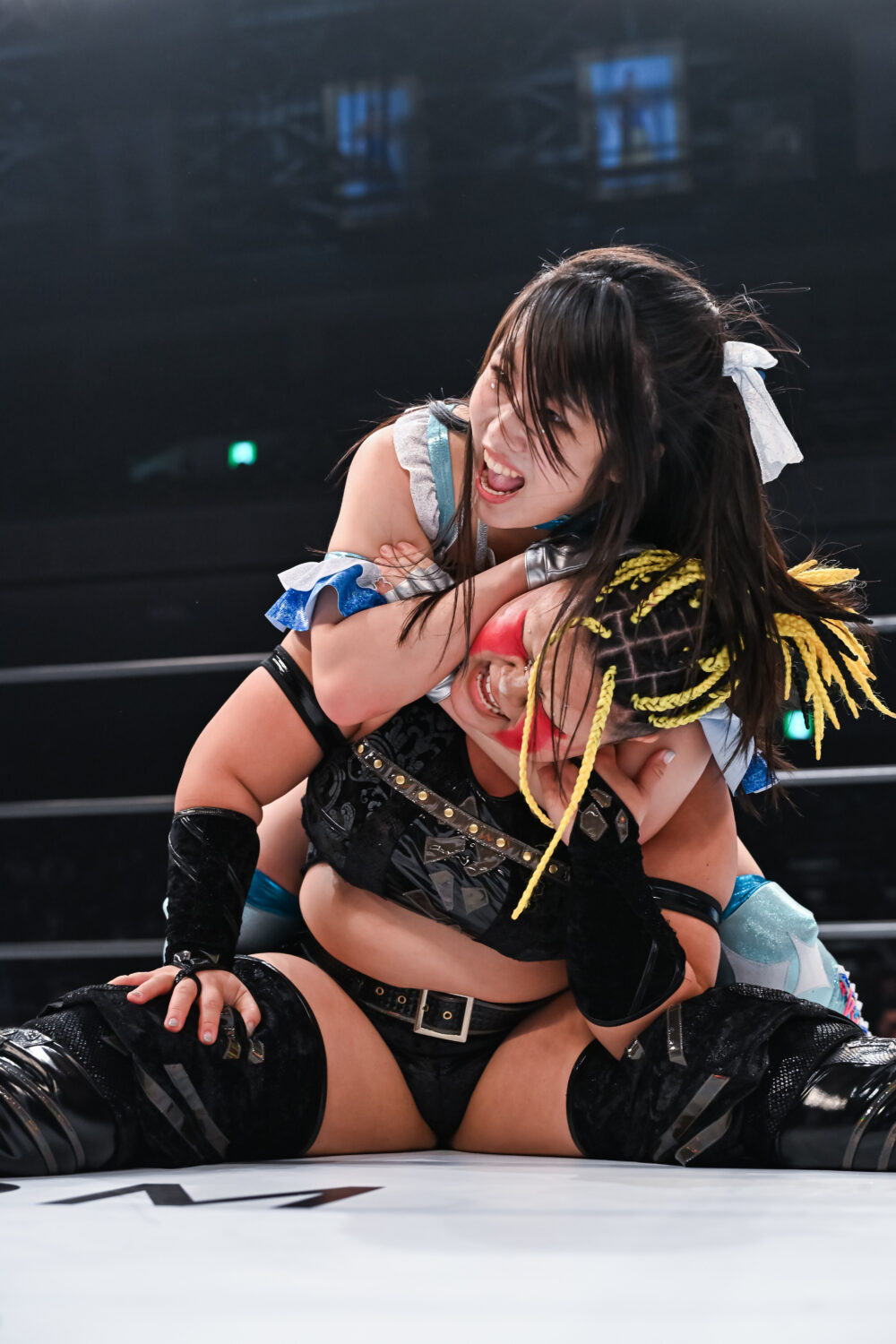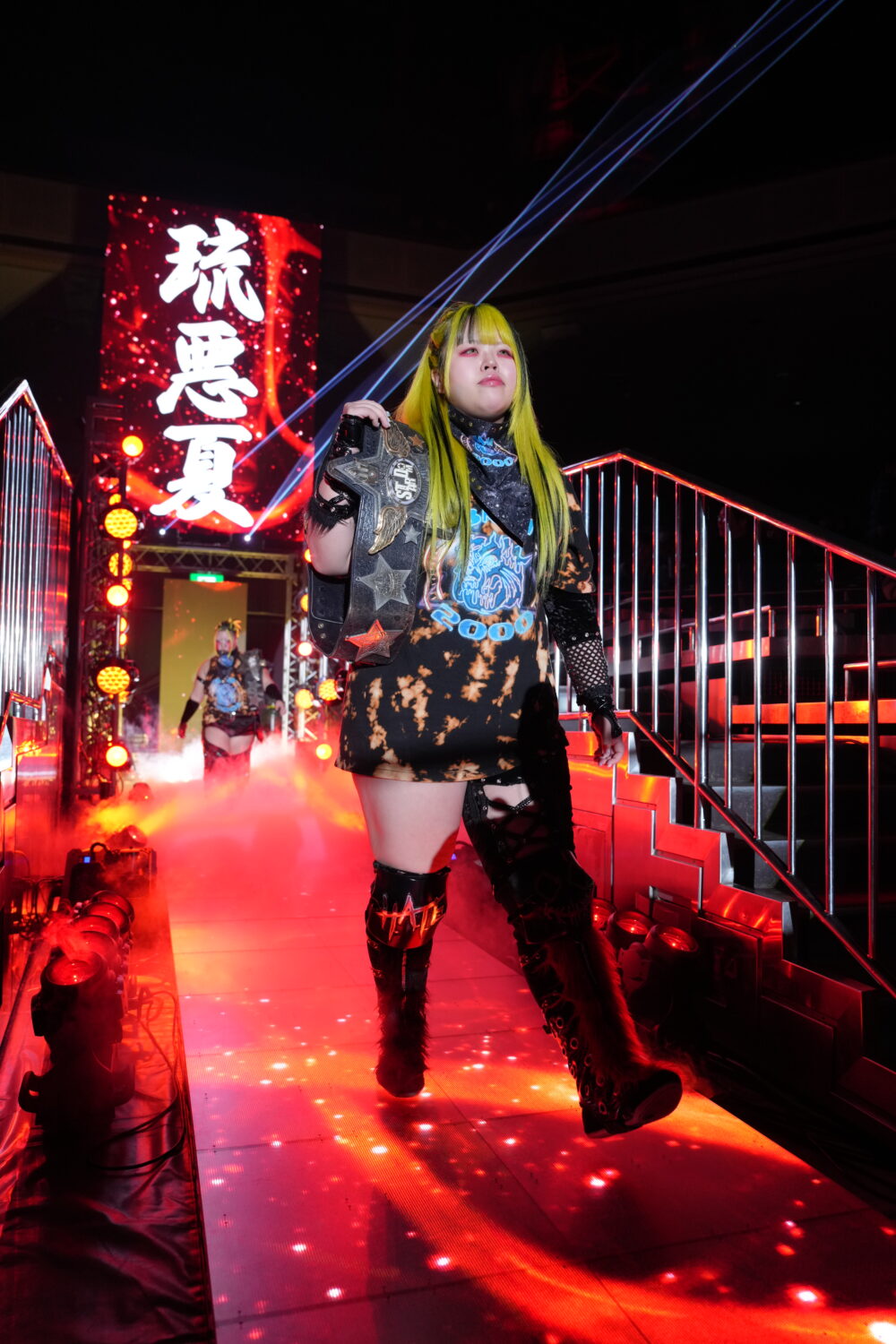 王者組がクロスボディーの競演から場外戦にもっていく。さくらをリングに戻してナツコがヒップドロップ。琉悪夏がさくらに串刺しボディーアタック。さくらが返してミドルキック連打。さくらがドロップキックを連打。ナツコと琉悪夏が連係でさくらを攻撃。ナツコがさくらに逆水平連打、串刺しラリアット、バックフリップ。玖麗が乱入してドロップキック、さくらがミドルキック。玖麗が向かっていくが、琉悪夏が阻止。玖麗が切り返し、まとめての串刺しドロップキックを連発。ナツコが返すと玖麗がスリーパーでギブアップを迫る。玖麗がコーナーに上がると、ナツコが雪崩式水車落とし、ショルダータックル。キャノンボール狙いを玖麗がスピア。しかしナツコが受け止める。玖麗はジャックナイフも、ナツコが反転してセントーン。ナツコがラリアットを決めるが2カウント。琉悪夏が串刺しラリアット、ショルダータックル、セントーン。玖麗が返すと、琉悪夏がエルボー。さくらが乱入してダブルのドロップキック、玖麗がエルボードロップ。10分経過。さくらが琉悪夏へミサイルキック、串刺しニーアタック、三角絞め。ナツコが髪を引いてさくらを走らせず。ナツコと琉悪夏が合体ボディープレス。さくらが返すと、琉悪夏はフェースロック。さくらがエスケープすると、玖麗がクロスボディー。返したさくらに琉悪夏がフェイントをかけてエルボー。玖麗がドロップキック、さくらと合体で串刺し攻撃、さくらがミドルキック。ナツコがまとめてラリアット。場外で同士討ちを誘い、玖麗、さくらが場外に飛ぶ。さくらと玖麗が打撃で合体、さくらが琉悪夏に三角絞め。琉悪夏が持ち上げようとするが、さくらが絞め続ける。琉悪夏がエスケープすると、さくらが琉悪夏にハイキック、回し蹴り。桜花爛漫を琉悪夏がかわすと玖麗がミサイルキック、さくらがハイキック。カットに来たナツコのセントーンがかわされて琉悪夏に誤爆。さくらがダイビングニーアタック。琉悪夏が返すと、さくらがバックを取る。琉悪夏が切り返すと、玖麗のスピアがかわされて誤爆。ナツコと琉悪夏がサンドイッチ式でキックをぶち込む。琉悪夏がネックハンギングボム。さくらが返すと、ナツコと琉悪夏がファンタスティックフリップを連発。しかし、玖麗がカットする。ナツコが玖麗にデスバレー。琉悪夏がさくらへ、ナツコが玖麗へダイビングボディープレスで競演。琉悪夏がジャーマン、ダルマ式狙い。さくらが切り返して丸め込むが、ナツコがカット。さくらの突進に琉悪夏がラリアット、さくらの蹴りをかわして琉悪夏がジャーマン、ダルマ式ジャーマン。さくらが返せず琉悪夏が勝利した。