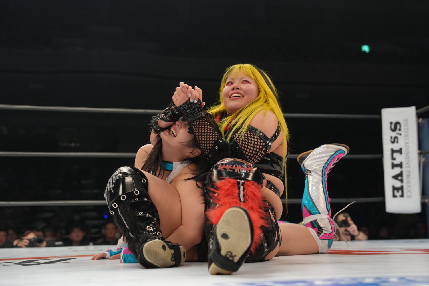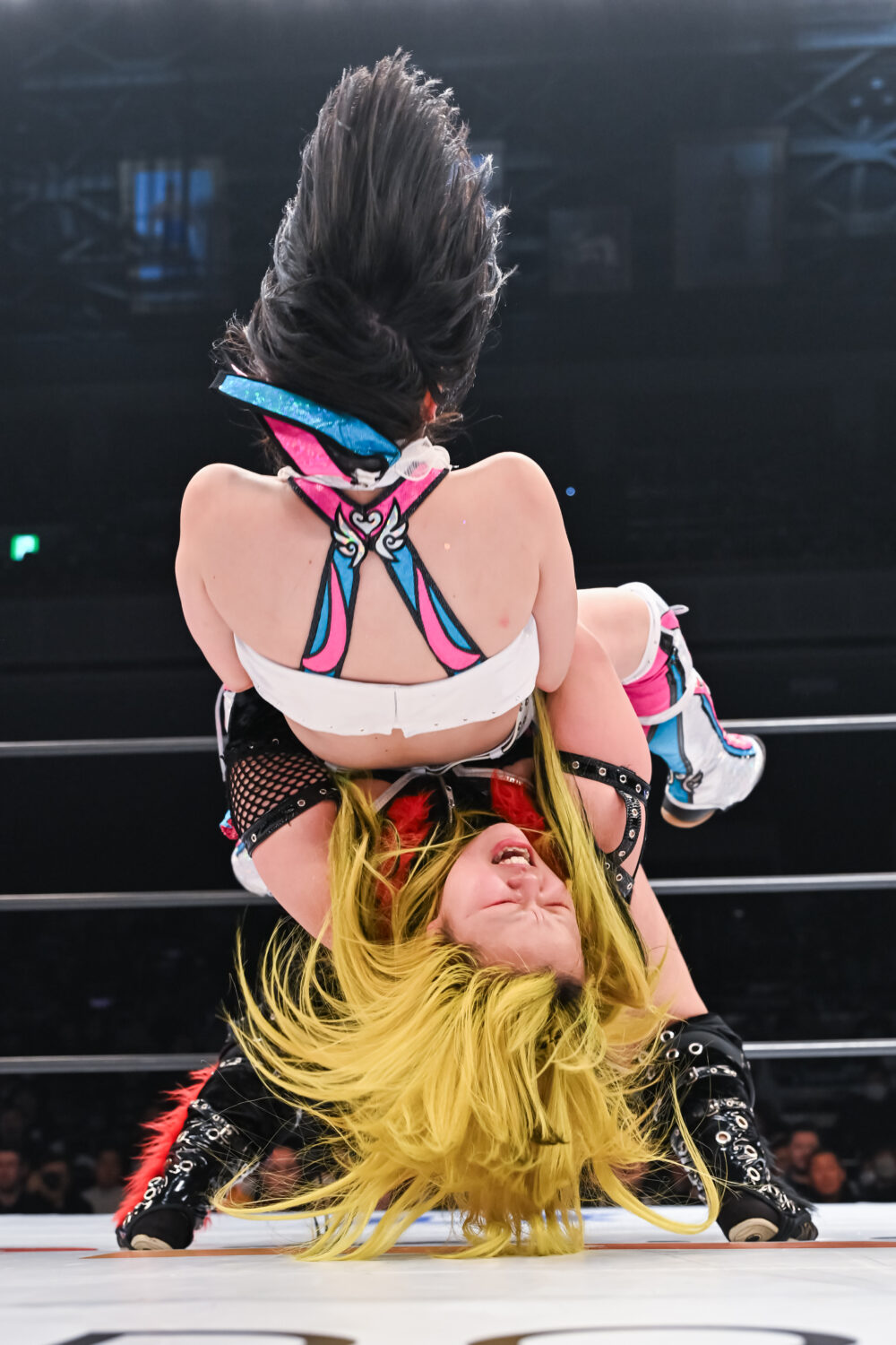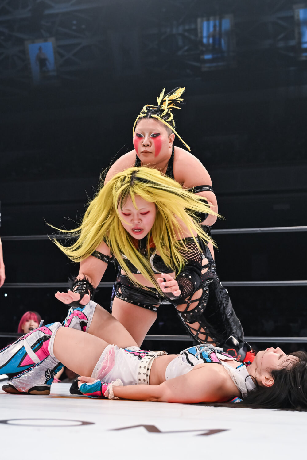 NEW BLOODタッグを奪取し、その勢いでゴッデス・オブ・スターダムタッグリーグ戦に出場、まさかの優勝を成し遂げたさくらあや&玖麗さやか組がゴッデス王座に挑む。王者はH.A.T.E.の刀羅ナツコ&琉悪夏組。優勝決定戦の再現となるわけだが、ナツコ組としては2連敗は許されない。決勝のリベンジか、それとも挑戦者がタッグ2冠を達成するか?