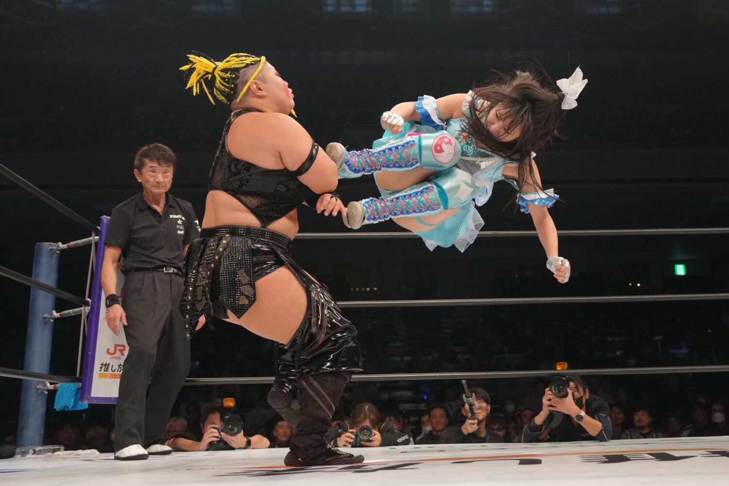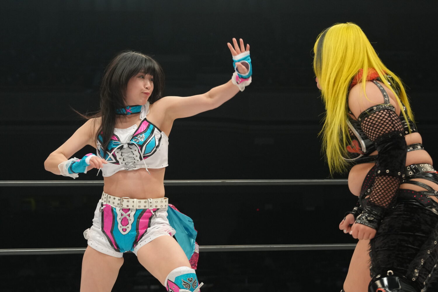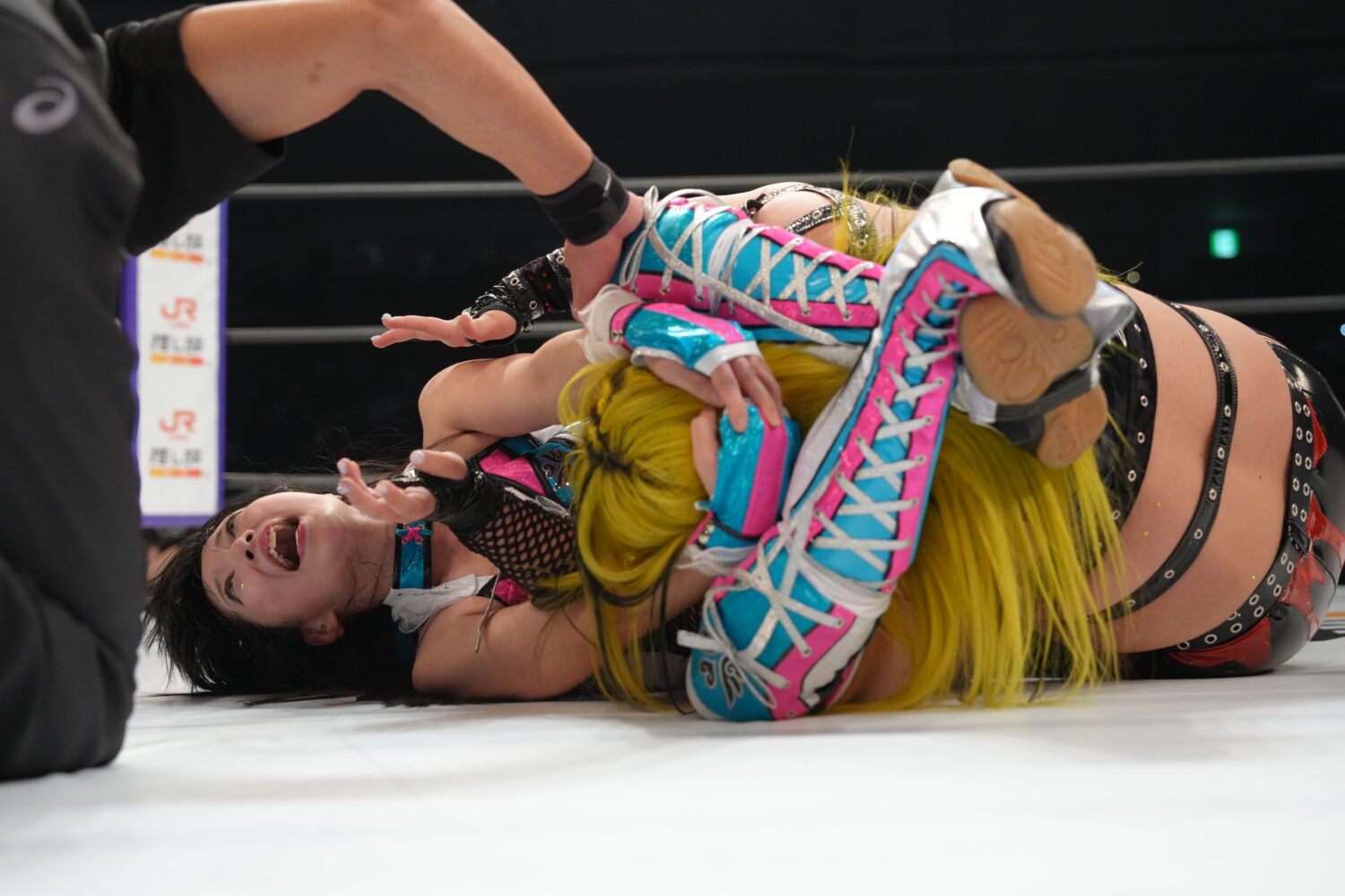 NEW BLOODタッグを奪取し、その勢いでゴッデス・オブ・スターダムタッグリーグ戦に出場、まさかの優勝を成し遂げたさくらあや&玖麗さやか組がゴッデス王座に挑む。王者はH.A.T.E.の刀羅ナツコ&琉悪夏組。優勝決定戦の再現となるわけだが、ナツコ組としては2連敗は許されない。決勝のリベンジか、それとも挑戦者がタッグ2冠を達成するか?