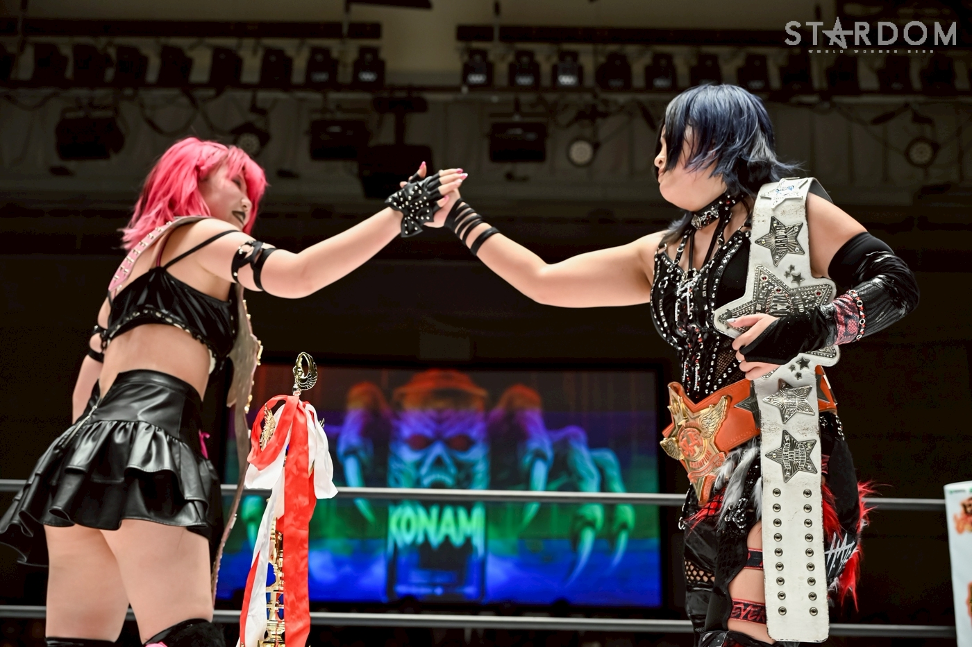 Konami: "Vale, vale, vale. No dijiste nada hoy, así que supongo que lo haremos allí, ¿de acuerdo? Cada vez me emociona más que Rinan y yo arriesguemos este cinturón blanco el 21 de enero. Pero por ahora, nosotras, las Nuevas Tres Hermanas, hemos defendido este cinturón de Artista gracias a tu actuación de hoy, así que, Rinan, tú eres quien cerrará el combate hoy"