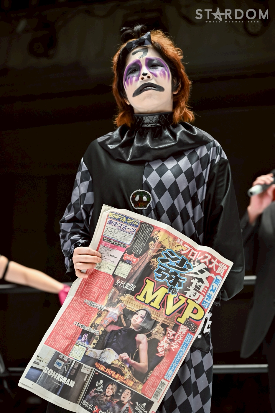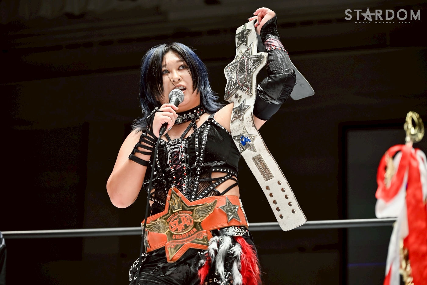 Konami: "¿Qué? ¿Viniste a ayudarme? Yo tampoco te golpeé a propósito. En fin, no pasa nada. Yo también pienso en ti. Vamos a llevar este cinturón blanco, ¿verdad? Es el 15.º aniversario de Stardom, ¿verdad? El próximo 21 de enero, en el Korakuen Hall, es el 15.º aniversario de Stardom. ¿Por qué no llevamos Rina y yo este cinturón Maravilla allí?"
