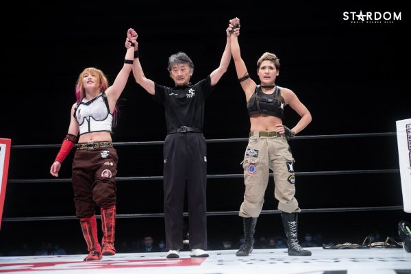 中野「なんか、言いたいこと言って帰っちゃったけど、私たちはいつでも誰の挑戦でも受ける。名古屋のみなさん、こんにちは。今日はご来場いただきありがとうございます。コズミックエンジェルズ、アーティスト・オブ・スターダムチャンピオンシップ最多防衛記録更新しました! チャンピオンとしてドローで悔しいけど、でも、喜んでもいいですよね? 私たちコズエンは、どんなにカッコ悪くても、ボロボロになっても、まだまだこの最多防衛記録に甘んじず、もっともっとスターダムの歴史を、みなさんの記憶をいいものに塗り替えていきますので、どうかこの生きづらい世の中ですけど、私たちをスターダムをこれからも信じてついてきてください。よろしくお願いします」