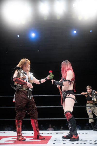 詩美と朱里が先発。ジュリアは「(朱里が)いくんだ」と声をかけると朱里が「(自分が)いく」と返答。試合がスタートするとグラウンドの攻防を展開。朱里が腕十字に入るが詩美がすぐにロープに足をかける。朱里がバックを取りにいくが詩美も取り返す。朱里がヘッドロックに取り絞り上げると詩美がロープに振る。しかし朱里が付き合わずワキ固めへ。詩美が逃れようとすると朱里がバックを取ってアームホイップ。AZMが入り詩美と合体し串刺しドロップキックの連打からドロップキックで競演。朱里が返すと詩美がストンピング。AZMが入ると朱里がサッカーボールキック。朱里は控えの詩美を蹴落としAZMを攻撃。替わったジュリアが自軍コーナーで顔面を踏みつける。そこに朱里も加わる。中央に持っていくとジュリアはネックブリーカー。朱里もコーナーで顔面を踏みつけていく。さらに串刺しニーアタックからサッカーボールキックを連打すると片足でカバー。AZMがすぐに返すがジュリアと朱里がキックの連係で攻撃。ジュリアと朱里はダブルのエルボードロップ。AZMがジュリアにエルボー連打、三角飛びプランチャ。詩美がジュリアにショルダータックル、控えの朱里に向かっていく。ジュリアと朱里がクローズラインも詩美がかわして朱里がリング下へ。詩美はジュリアへミサイルキック、スリーパー。ジュリアが切り返してバックを取る。コーナーに振るとエプロン越しにネックブリーカー。朱里が詩美へドロップキック、スタンディングダイビングギロチン。返されると腕十字、腕固めへ。詩美が切り返しスリーパー。しかし朱里がエスケープ。詩美がバックを取るが朱里が取り返してエルボー。詩美も応戦しエルボーの打ち合い。詩美が連打し朱里がダウン気味に。朱里が立ち上がりミドルキックの連打を浴びせる。詩美が先を読んでエルボーも朱里がニーアタック。詩美がラリアットで朱里を倒すが2カウント。朱里が投げっぱなしジャーマンも詩美がやり返す。10分経過。詩美はコウモリ吊り落とし。すぐに朱里がニーアタック。両者ダウンからタッチ。ジュリアがAZMのドロップキックを食らう。ジュリアはブレーンバスター狙いをこらえて突進。AZMがかわすとミサイルキック、ブレーンバスター。ジュリアが返すと、AZMはワキ固め。ジュリアがエスケープすると、AZMが突進。ジュリアがドロップキックをカウンターで決め朱里を呼び込む。ジュリアと朱里が大蛇からキックの競演。2発目狙いはAZMが切り返し詩美がラリアット。ジュリアを担ぎ上げるとAZMがハイキック、詩美がバックフリップ。AZMがダイビングフットスタンプもジュリアが返す。AZMはフィニッシュを予告してジュリアへミスティカ式ワキ固めから腕固め。しかし朱里がカットに成功。詩美が朱里を場外へ。AZMはジャーマンも2カウント。AZMがジュリアをコーナーに持っていくが朱里がカット。ジュリアが雪崩式を狙うと詩美が介入しアルゼンチン。ジュリアが逃れてドロップキック。朱里がAZMをコーナーから落としてジュリアが二段蹴り。AZMが返すとジュリアはバックドロップ。AZMが切り返し丸め込むがカットされる。朱里は詩美を落としてジュリアと大蛇の合体。しかし詩美がカットする。朱里は詩美にハイキック。ジュリアがAZMにバックドロップ。AZMが返すとジュリアはステルスバイパー。AZMがギブアップし、ジュリア組の勝利となった。試合後、朱里が詩美に赤い薔薇をプレゼント。