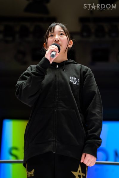 Le stagiaire Matsuda Miyu a été appelé sur le ring par l'annonceur Ando