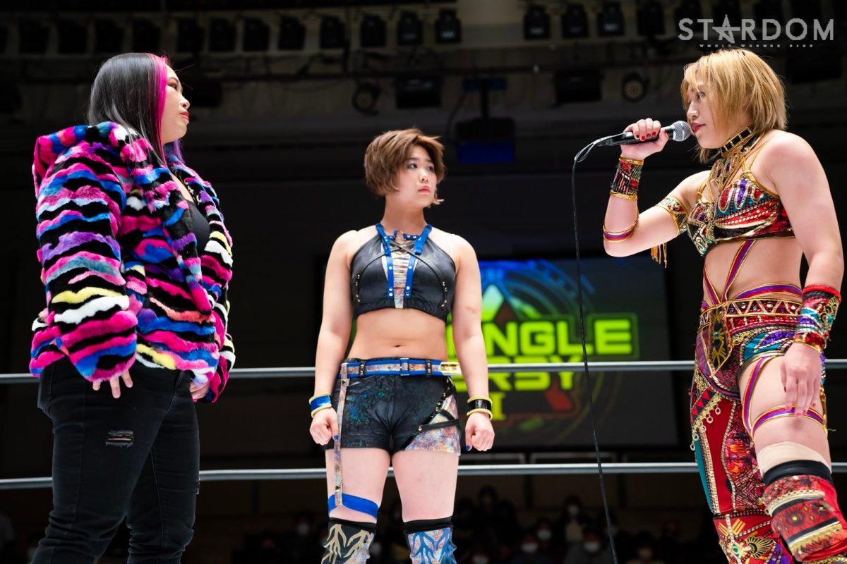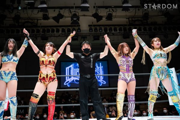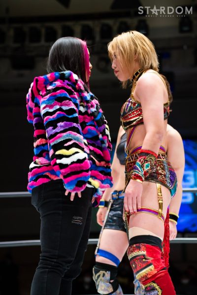 当初は高橋奈七永&優宇&水森由菜組、舞華&ひめか&レディ・C組と公式リーグ戦が予定されていたがカードが変更。トライアングルダービーに出場している舞華&レディ・C組と優宇&水森組によるタッグマッチで、リーグ戦の前哨戦ともなる。また、王者・優宇と両国の3WAYを制して挑戦権をつかんだ舞華には、ゴッデス・オブ・スターダム王座前哨戦だ。