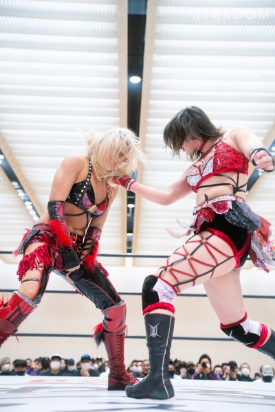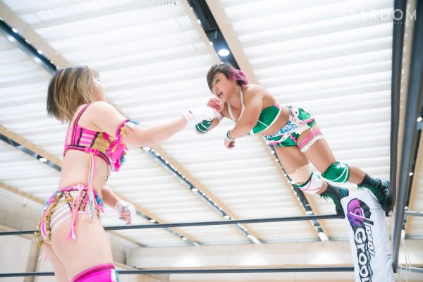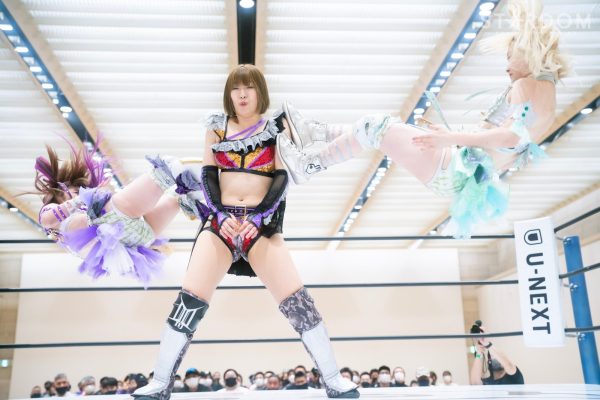 ドンナ・デル・モンドの舞華&桜井まい組とコズミックエンジェルズ、メルティアの中野たむ&なつぽい組がタッグで激突。桜井はコズエンからDDM、なつぽいはDDMからコズエンへとユニットを移籍した経緯がある。桜井、なつぽいが移籍の正当性を表現するには格好のカードと言えるだろう。