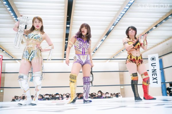 慎重に手四つで組み合いレディと水森が向後を追い詰める。向後が腕を絞り上げるが2人に押し倒されてカバーされる。向後がレディにアームホイップも水森には耐えられる。ロープワークで水森がロープ間を何往復も走らされる。向後が倒してレディがニードロップ。レディ、向後がカバーの奪い合い。レディが向後のクロスボディーをキャッチするとジャイアントスイング10回転。水森が入ってくるとレディが倒してジャイアントスイングを狙う。しかし重くて回らず向後がフットスタンプを水森に見舞う。レディは向後とエルボーの打ち合い。水森がまとめてフライングショルダータックル。向後をレディの上にボディースラム、まとめてボディープレス。水森は向後を捕獲しコーナーに追い込む。向後が水森に変型卍固め。しかしレディがまとめてコブラツイストでギブアップを迫る。レディはまとめてネックブリーカードロップ、水森に逆水平。水森は「もっとこい!」と挑発し強烈な逆水平。レディのチョップをブロックしチョップを打つ。レディも応戦しチョップの応酬。ここに向後がダイビングボディーアタック、まとめて619、ジャックナイフ式エビ固め。2人が返すと向後は水森にブレーンバスター狙い。しかし水森が反対に叩きつける。向後のトラースキックが水森にヒットもレディが押さえ込むと3カウントが入った。