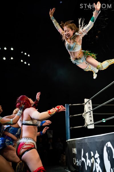 羽南とナツコが先発。ナツコが顔面をかきむしると羽南がドロップキック。STARSが連係でナツコを攻め込む。しかしトリオでのドロップキックは大江戸隊に妨害され不発に。すると大江戸隊が羽南を連係で攻め込み。ナツコがセントーン連発。桃が羽南にボディースラム。すぐに羽南が返すがミドルキックを食らう。羽南が向かっていくも、桃が仁王立ち。羽南がエルボー連打、桃がミドル一発で倒してみせる。しかし羽南がカウンターで払い腰。岩谷が桃にコルバタ、サッカーボールキック。桃の突進を岩谷がかわすが、ナツコがキャノンボールを打ち込みハリケーンドライバー、桃が蒼魔刀、ハイキック。岩谷がトラースキックで両者ダウン状態。飯田と吏南がリングイン。飯田の逆水平連打をかいくぐり吏南がドロップキック。飯田が返すと、羽南が吏南をカットし、エルボーアタックの挟み撃ち。STARSが吏南に合体フェースクラッシャー狙い。大江戸隊がカットし、吏南は飯田に卍固め。吏南が突進をかわすと大江戸隊が次々と串刺し攻撃。ナツコのカミカゼから吏南がダイビングダブルニードロップ、ハイドレンジア。しかし、岩谷と羽南がドロップキックでカット、岩谷と羽南がボディーアタック。吏南のピンクデビルを飯田が切り返し、STARSが合体フェースクラッシャー。返した吏南に飯田はブレーンバスター狙い。吏南が切り返し丸め込むが、飯田がギリギリでクリアーしラリアット。飯田がキン肉バスターから前方に叩きつける達者でな!を見舞うと吏南が返せず、3カウントが入った。