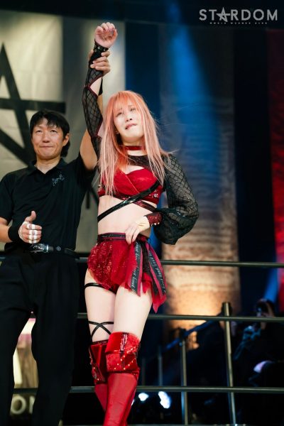 上谷「今日私が最後に取ったフェニックスシャイン。これはミラノさんに伝授してもらった必殺技。そして、フェニックスストライク、そして最大級のフィニッシュ技フェニックススプラッシュ。その3大フェニックスで私は必ず舞華から赤いベルトを奪ってやります。女帝時代も新ユニットも、あと1週間ですべて終わります」