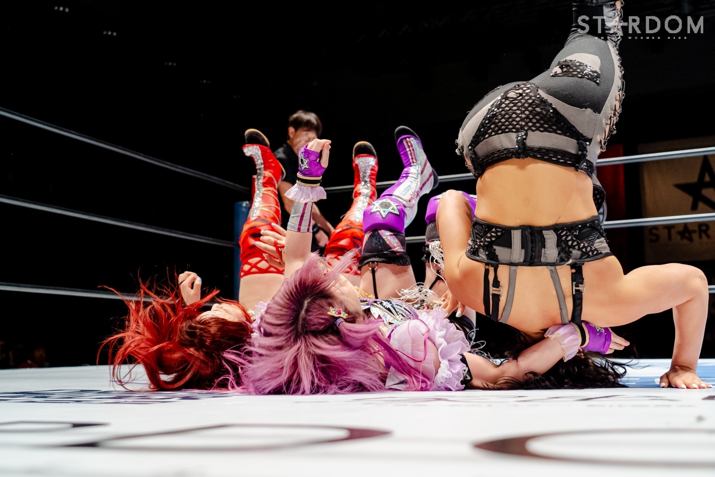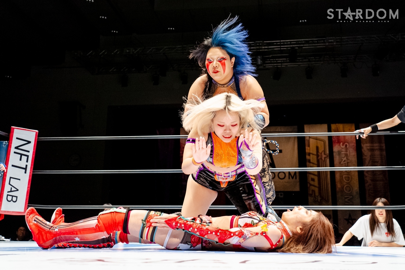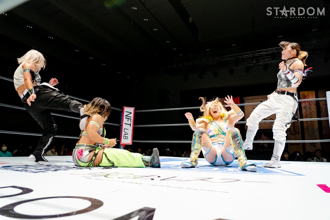 星来がジーナを呼ぶように先発に指名。ジーナがヘッドロック、ロープに振りトリッキーなムーブを見せ、星来のドロップキックをかわして睨み合う。星来が「アクシュー」と手を差し出すが、ジーナが蹴りを入れる。ロープへの振り合いでどちらも譲らないと、ジーナがエルボー、ドロップキック。月山がジーナと合体し、連係で星来に攻撃。月山はヒップバットの連打を星来に浴びせる。ジーナが星来にブレーンバスター。2発目を星来がこらえて足を踏みつけネックブリーカー。キッドがジーナにコルバタ。ダイビングボディーアタックをジーナがキャッチ。キッドがこらえてマットに叩きつける。キッドは星来とダブルのドロップキックで月山を排除、キッドがジーナにその場跳びムーンサルト。ジーナが返してトラースキック。キッドがラリアットをかわすが、ジーナがアームホイップ、トラースキック。返したキッドがジーナのチョップをかわし「ノーチョップ」を主張。チョップを打ってくるジーナにキッドが「やめろって言ってんだろ!」とチョップをやり返す。月山がキッドに串刺しヒップアタック、クロスボディー。星来が月山を捕獲し、串刺しラリアット、「痔になれ!」とヒップを蹴り上げる。しかし、ジーナのアシストを得て月山が星来にヒップアタック連打。極楽ドン狙いを星来が切り返し、ドロップキック。ジーナがカットし、星来に高速で旋回式サイドスラム、月山が極楽ドンを決める。しかし、キッドがカットする。月山は星来を起こしてムーンライトドリーム狙い。星来がこらえると、カウンターで丸め込み。キッドの619から星来が丸め込むと、月山がフォールを奪われた。
