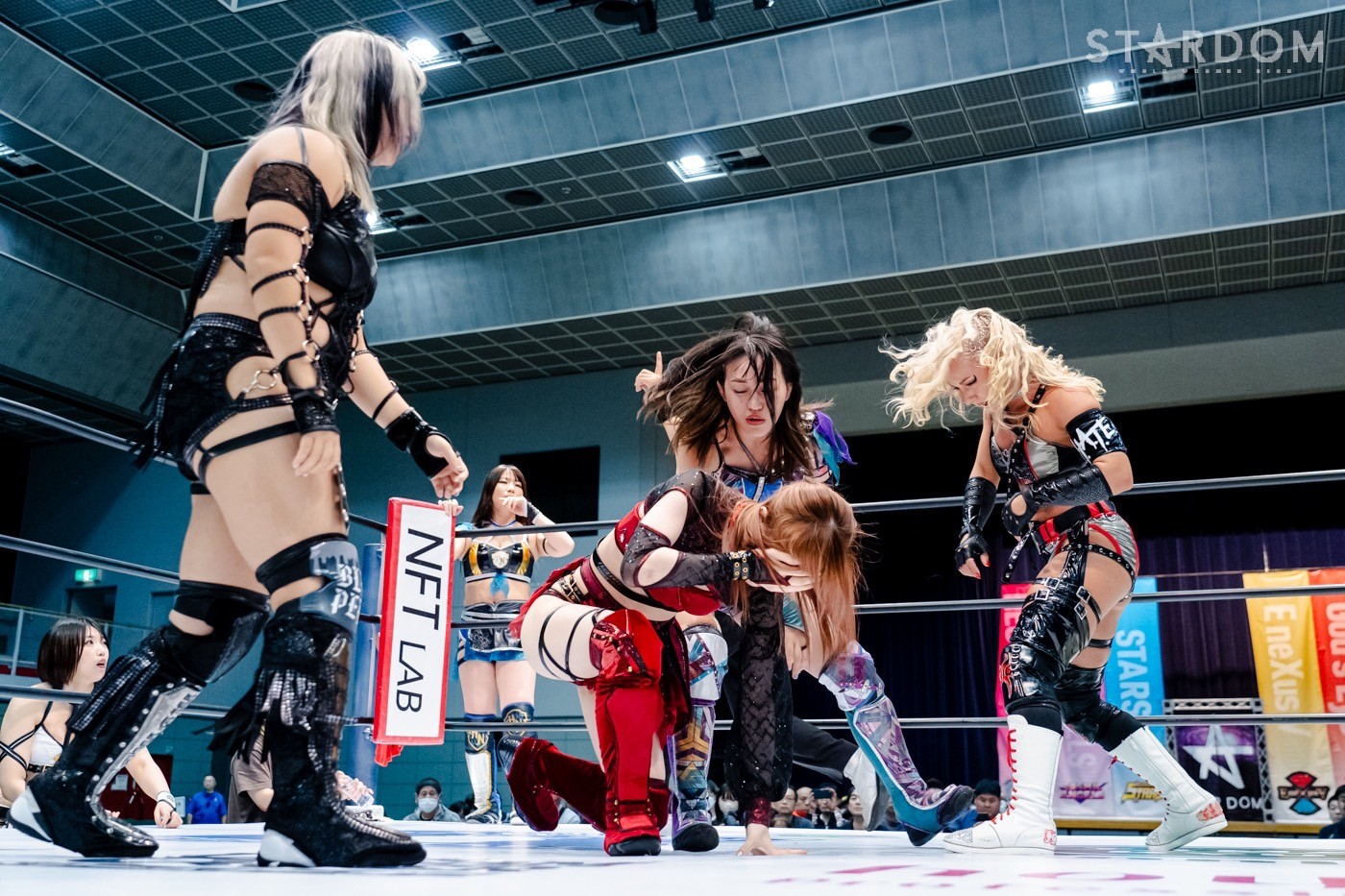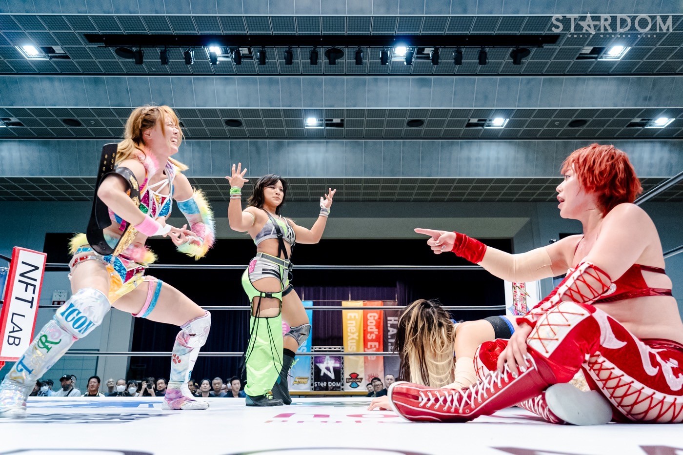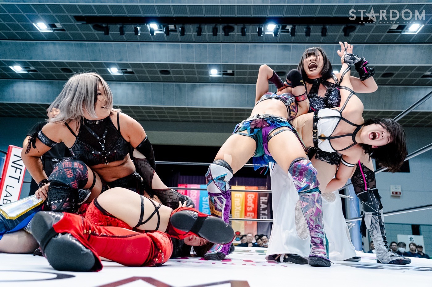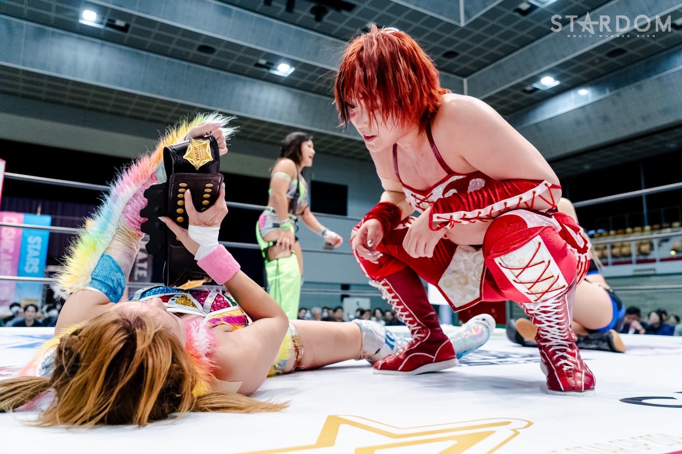 コズミックエンジェルズの中野たむ&なつぽい&安納サオリ組とH.A.T.E.の刀羅ナツコ&上谷沙弥&琉悪夏組がアーティスト・オブ・スターダム王座をかけて激突。中野組はこれが初防衛戦で、アーティスト王座奪取以降、それぞれがシングル王者の立場を変えてのタイトルマッチとなる。中野は鈴季すずを挑戦者に指名しての10・5名古屋でのワールド・オブ・スターダム王座戦が決まり、ワンダー・オブ・スターダム王者のなつぽいはテクラとの防衛戦が前日の仙台大会で確実になった。また、仙女ワールド王者だった安納はベルトを落として出直しのタイトルマッチ。対するH.A.T.E.は、中野に赤いベルトを奪われたナツコの暴れっぷりに要注意だ。さらにはクイーンズクエストを消滅させ闇堕ちした上谷の闘いぶりも不気味である。