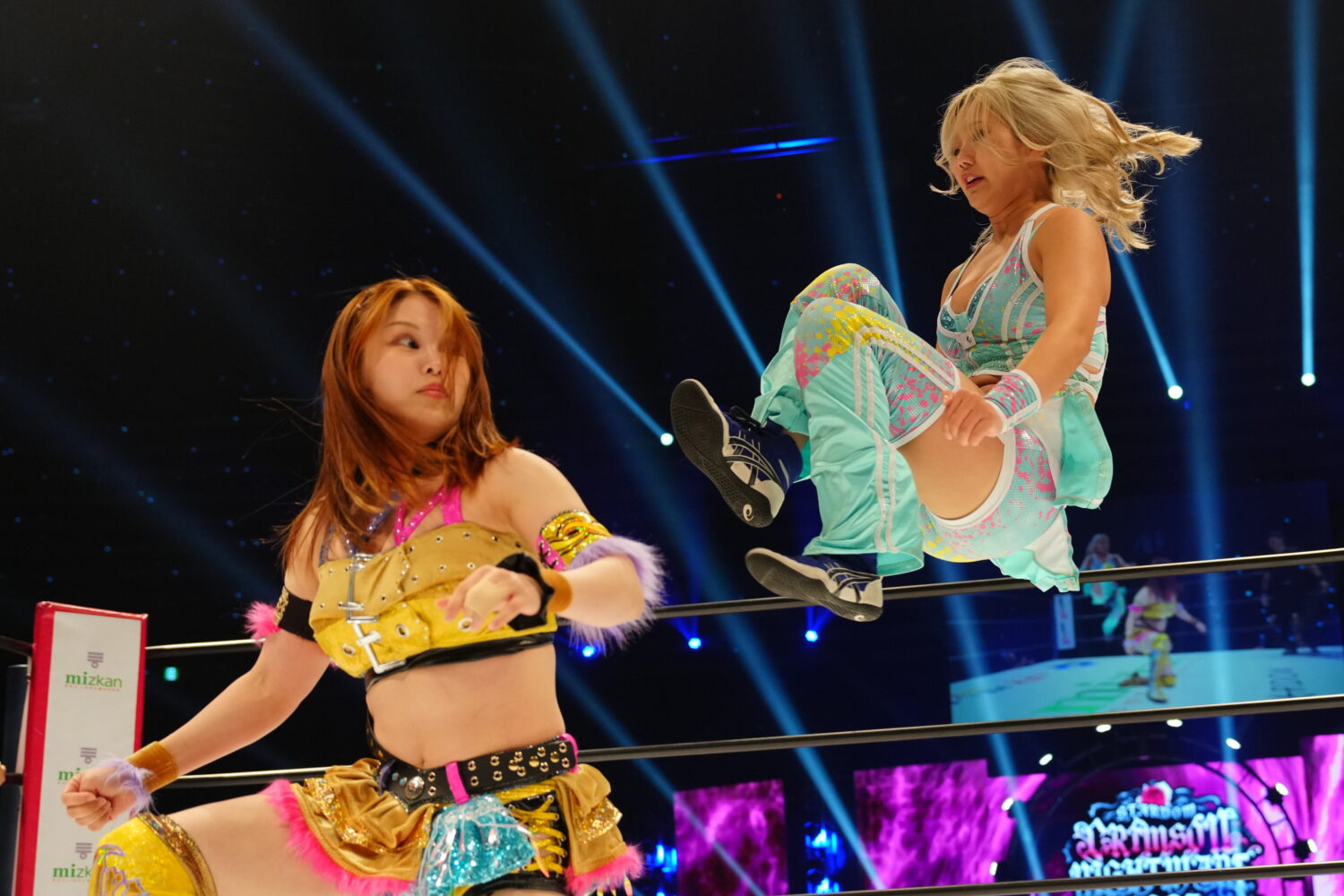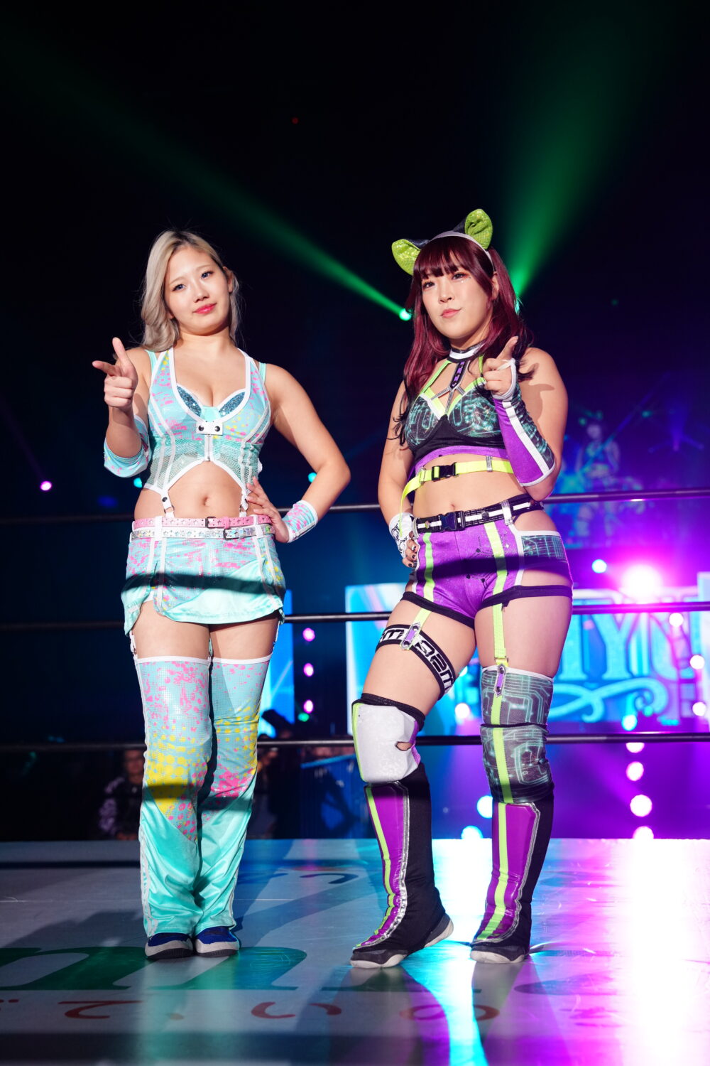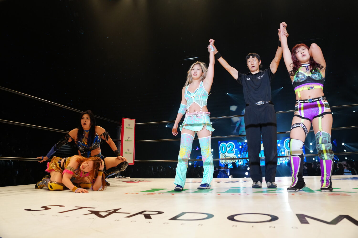 AZMと月山が先発、月山がロープワークでヒップドロップ、天咲が乱入してAZMとドロップキックで合体、AZMは月山にサッカーボールキック。月山が返すと、天咲が串刺しエルボーアタック、ドロップキック、DDT。月山が返すと、天咲がサブミッション。月山がエスケープすると、ヒップアタック。HANAKOがショルダータックル連打も、天咲が返す。HANAKOがアルゼンチンにいくとAZMがカット。HANAKOは次々と串刺し攻撃で相手を分断。天咲がHANAKOへDDT。HANAKOが2発目をこらえて持ち上げる。天咲が切り返してDDT、HANAKOがショルダータックル。AZMが背後から飛びつくが月山が丸め込み。AZMも切り返すが、月山も切り返す。HANAKOがAZMにボディースラム、月山がクロスボディー、合体ヒップドロップ。AZMが返すと月山はヒップバット連打。AZMが月山の突進をかわし、天咲とキックの競演、AZMがミサイルキック、ワキ固め、腕固め。月山がエスケープすると、AZMはダイビングフットスタンプへ。月山がかわすと、HANAKOが介入、しかし天咲がDDTで分断。月山がAZMを丸め込み。AZMが返すとハイキックをぶち込んでダイビングフットスタンプ投下。しかしHANAKOがカットする。HANAKOはAZMを持ち上げるが天咲がカット。しかしHANAKOがブレーンバスター、AZMにラリアット。月山がオースイにいこうとするも、AZMが切り返して丸め込んだ。