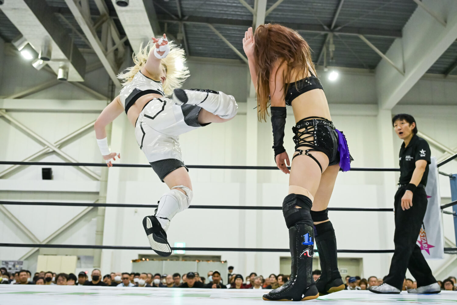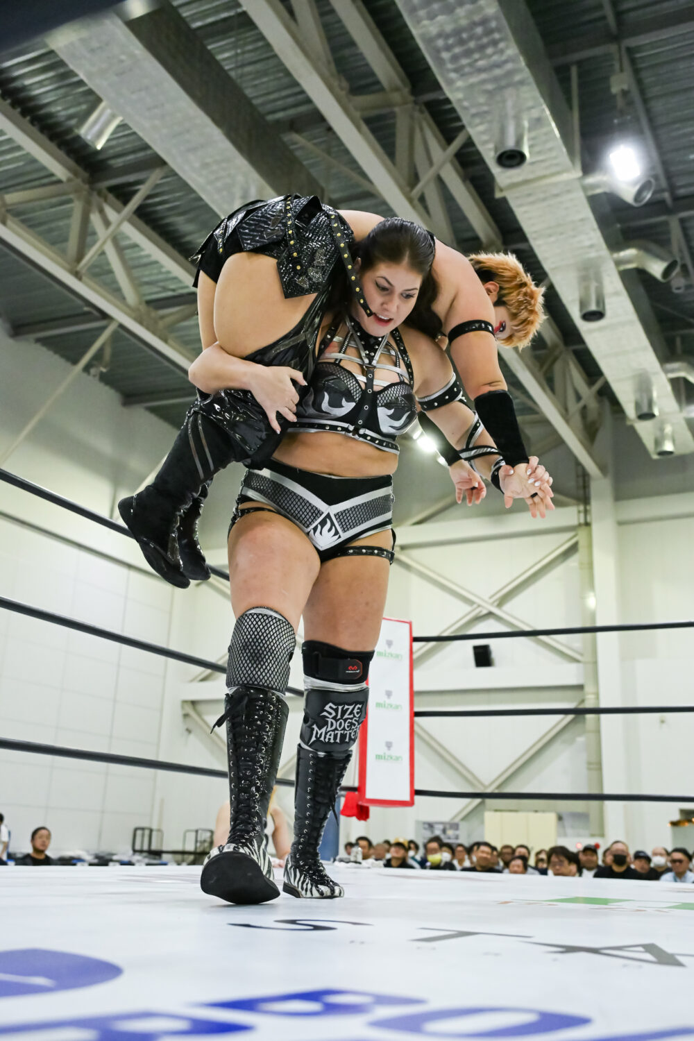ボジラ&鉄アキラ組のミ・ヴィダ・ロカと刀羅ナツコ&稲葉あずさ組のH.A.T.E.がタッグマッチで激突。ボジラとナツコのぶつかり合いがどんな化学反応を見せるのか? 注目のパワー対決だ。