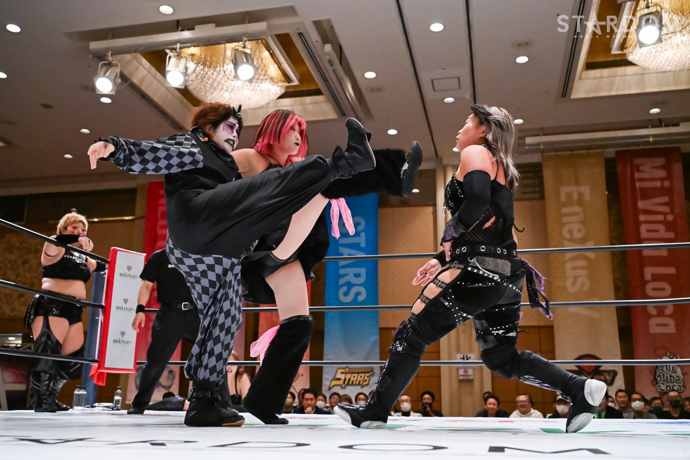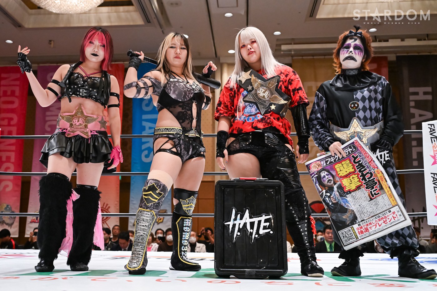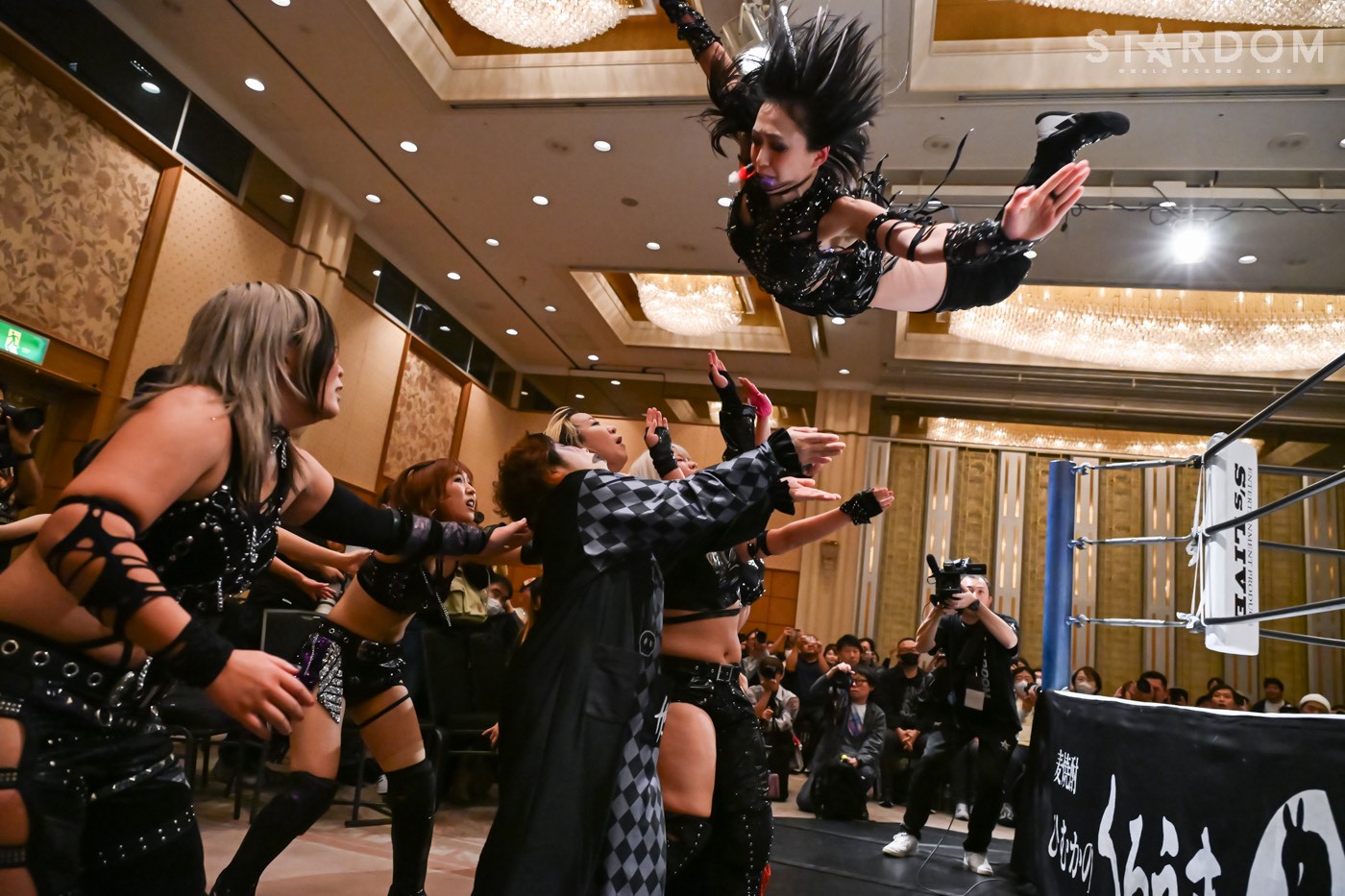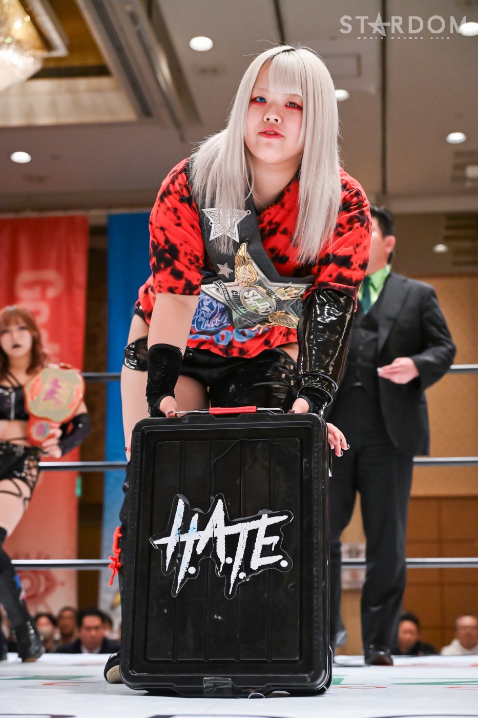 上谷と桃が、いきなり退治。試合がスタートしロープワークの攻防。上谷が桃のミドルをキャッチ、蹴りをかわし合って睨み合う。吏南とあずさが蹴りのかわし合い。あずさがソバットからミドルで吏南を倒す。琉悪夏があずさの足を引いて場外戦へ。桃が上谷を本部席に叩きつけ、2本のベルトを誇示。しかし後方から小波が襲撃。吏南と琉悪夏があずさに連係攻撃。あずさが返すと、吏南がヘアーホイップ、コーナーに追い込み顔面を踏みつける。フキゲンがあずさにスポーツ紙を読みながらキャメルクラッチ。フキゲンの串刺し攻撃には、あずさが足を出していく。あずさが突進すると、フキゲンが花をつまむ。あずさはカウンターで二段蹴り。ナツコがフキゲンをリング下に投げて再び場外戦。リングに戻り、ナツコがフキゲンにショルダータックル。フキゲンが上谷をかいくぐるが、タッチはできず。上谷が小波にタッチ。小波はフキゲンにフィッシャーマンを予告。かわしたフキゲンがブレーンバスターを予告、小波が切り返してワキ固め。フキゲンがサミングからブレーンバスターを宣言して丸め込む。吏南が小波にミサイルキック、卍固め。あずさがカットに入るが、吏南はまとめてホールド、小波にドロップキック。小波が吏南にミドルキック。吏南がビッグブーツでやり返す。小波のダッシュに吏南が「このクソ姉貴が!」とビッグブーツ。小波がかわしてスリーパー。フキゲンのスポーツ紙殴打、セントーンから吏南がジャックナイフ。吏南のダイビングフットスタンプを小波がかわしてミドルキック、フィッシャーマン。ナツコが吏南にセントーン。払い腰をナツコがこらえてエルボー連打、吏南がかいくぐりビッグブーツから払い腰をナツコに決める。琉悪夏がナツコに串刺しラリアット、フェイントをかけてエルボー、ナツコもフェイントをやり返してエルボースマッシュ。桃と琉悪夏が連係でナツコを攻め込む。琉悪夏はナツコにフェースロック。ナツコがエスケープすると、琉悪夏は串刺しクロスボディー。コーナーに上がると、あずさが妨害してデッドリードライブ。ナツコが琉悪夏にキャノンボール。返した琉悪夏にナツコはダイビングボディープレス。琉悪夏がかわしてナツコとラリアットをぶつけ合う。ナツコが逆水平連打、琉悪夏がラリアット、ナツコもラリアット、2人のクロスボディーが交錯。上谷と桃がエルボーの応酬。15分経過。桃が上谷の連打を受けて立つ。上谷の突進を髪を引いて阻止。上谷が押さえ込みを返すが、桃がブレーンバスターの3連発。上谷が返すと、桃がチキンウイングフェースロック。桃組が上谷に次々と串刺し攻撃。しかし上谷が梨杏にビッグブーツ。ナツコがラリアットで分断し、桃に上谷が二段蹴り。残り3分。上谷が桃をリング下に送り出し、「桃!」と叫んでスワンダイブ式プランチャ。桃を戻すと、小波とナツコで合体ラリアット、ジャーマン。上谷が引き起こしフィッシャーマン。スタークラッシャー狙いを桃がこらえてハイキック。パイルの体勢を上谷が切り返して突進、桃が捕まえて叩きつける。しかしカットされてリング上でH.A.T.E.が入り乱れる。残り1分。リング上は上谷と桃。上谷が二段蹴り、桃が投げっぱなしドラゴン、ダブルニーアタック。上谷が返すと、桃が突進もナツコが鉄パイプで殴打、上谷のフランケンが決まるが、琉悪夏がボックスを投げつけてカバーをカット。そのままタイムアップとなり、時間切れ引き分けに。試合後、桃が襲いかかり上谷と乱闘。桃は「こいよ!」と挑発。