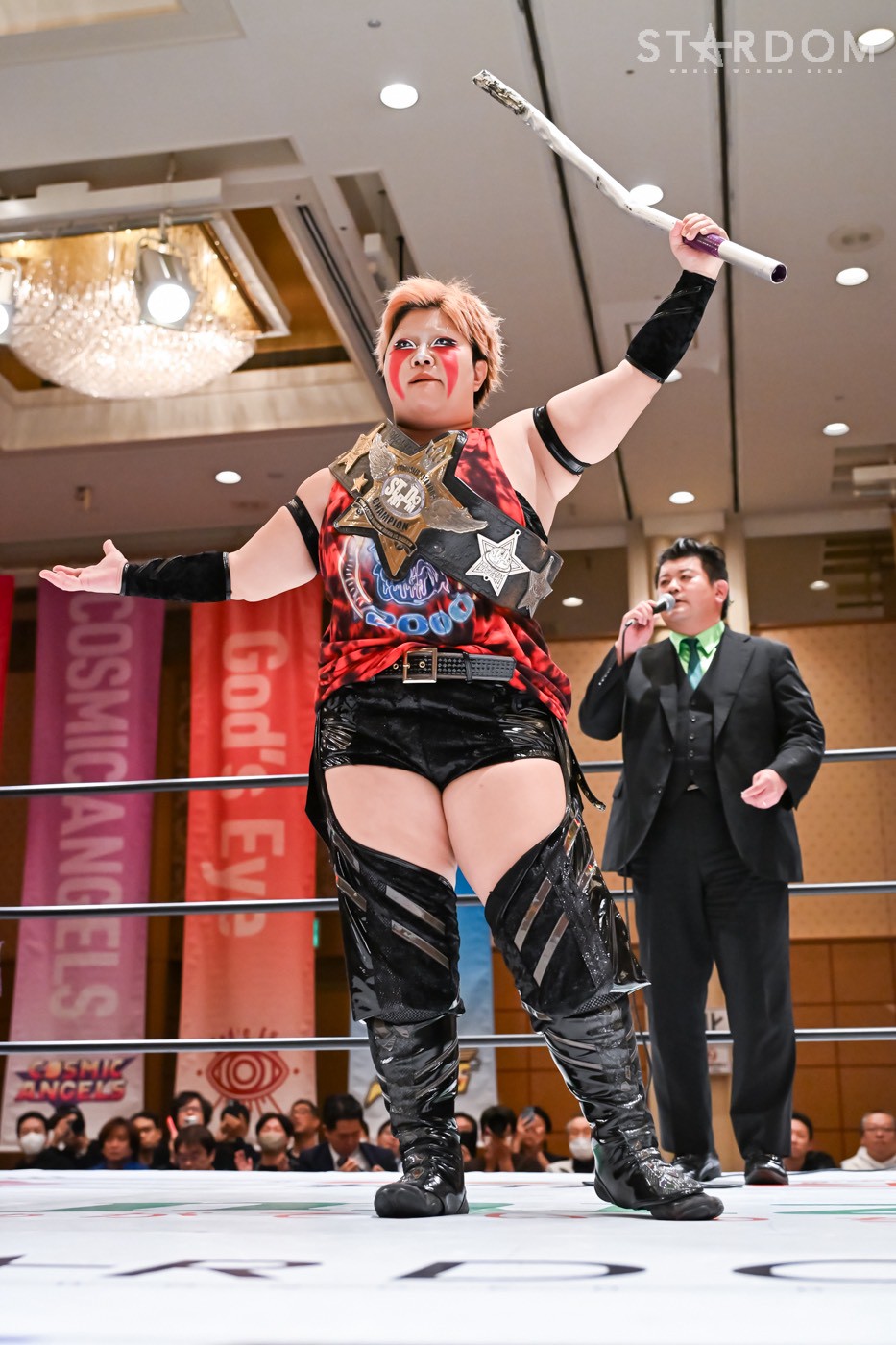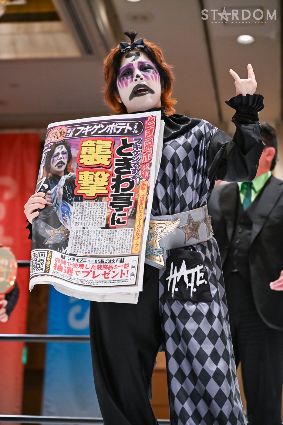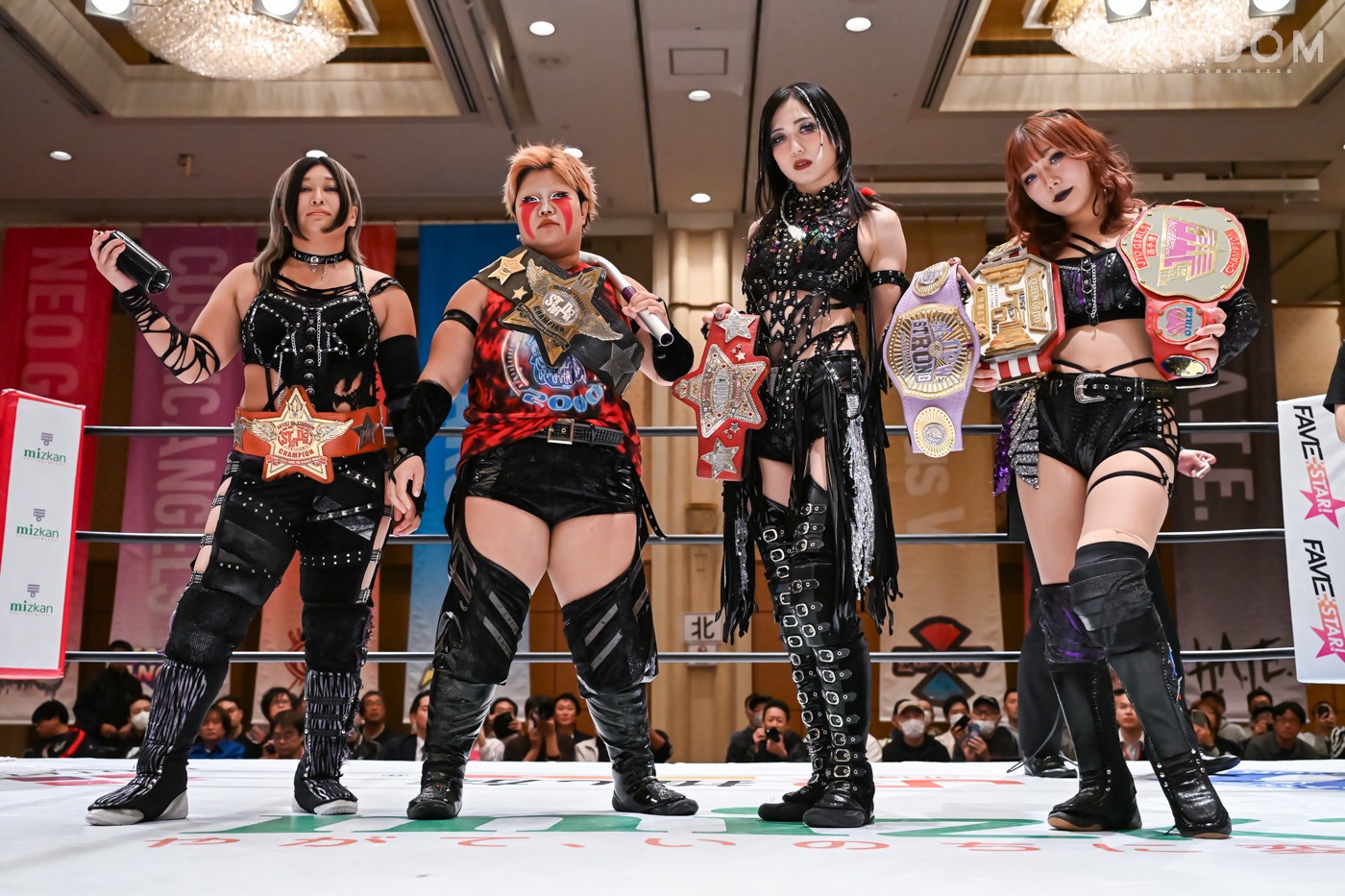 上谷と桃が、いきなり退治。試合がスタートしロープワークの攻防。上谷が桃のミドルをキャッチ、蹴りをかわし合って睨み合う。吏南とあずさが蹴りのかわし合い。あずさがソバットからミドルで吏南を倒す。琉悪夏があずさの足を引いて場外戦へ。桃が上谷を本部席に叩きつけ、2本のベルトを誇示。しかし後方から小波が襲撃。吏南と琉悪夏があずさに連係攻撃。あずさが返すと、吏南がヘアーホイップ、コーナーに追い込み顔面を踏みつける。フキゲンがあずさにスポーツ紙を読みながらキャメルクラッチ。フキゲンの串刺し攻撃には、あずさが足を出していく。あずさが突進すると、フキゲンが花をつまむ。あずさはカウンターで二段蹴り。ナツコがフキゲンをリング下に投げて再び場外戦。リングに戻り、ナツコがフキゲンにショルダータックル。フキゲンが上谷をかいくぐるが、タッチはできず。上谷が小波にタッチ。小波はフキゲンにフィッシャーマンを予告。かわしたフキゲンがブレーンバスターを予告、小波が切り返してワキ固め。フキゲンがサミングからブレーンバスターを宣言して丸め込む。吏南が小波にミサイルキック、卍固め。あずさがカットに入るが、吏南はまとめてホールド、小波にドロップキック。小波が吏南にミドルキック。吏南がビッグブーツでやり返す。小波のダッシュに吏南が「このクソ姉貴が!」とビッグブーツ。小波がかわしてスリーパー。フキゲンのスポーツ紙殴打、セントーンから吏南がジャックナイフ。吏南のダイビングフットスタンプを小波がかわしてミドルキック、フィッシャーマン。ナツコが吏南にセントーン。払い腰をナツコがこらえてエルボー連打、吏南がかいくぐりビッグブーツから払い腰をナツコに決める。琉悪夏がナツコに串刺しラリアット、フェイントをかけてエルボー、ナツコもフェイントをやり返してエルボースマッシュ。桃と琉悪夏が連係でナツコを攻め込む。琉悪夏はナツコにフェースロック。ナツコがエスケープすると、琉悪夏は串刺しクロスボディー。コーナーに上がると、あずさが妨害してデッドリードライブ。ナツコが琉悪夏にキャノンボール。返した琉悪夏にナツコはダイビングボディープレス。琉悪夏がかわしてナツコとラリアットをぶつけ合う。ナツコが逆水平連打、琉悪夏がラリアット、ナツコもラリアット、2人のクロスボディーが交錯。上谷と桃がエルボーの応酬。15分経過。桃が上谷の連打を受けて立つ。上谷の突進を髪を引いて阻止。上谷が押さえ込みを返すが、桃がブレーンバスターの3連発。上谷が返すと、桃がチキンウイングフェースロック。桃組が上谷に次々と串刺し攻撃。しかし上谷が梨杏にビッグブーツ。ナツコがラリアットで分断し、桃に上谷が二段蹴り。残り3分。上谷が桃をリング下に送り出し、「桃!」と叫んでスワンダイブ式プランチャ。桃を戻すと、小波とナツコで合体ラリアット、ジャーマン。上谷が引き起こしフィッシャーマン。スタークラッシャー狙いを桃がこらえてハイキック。パイルの体勢を上谷が切り返して突進、桃が捕まえて叩きつける。しかしカットされてリング上でH.A.T.E.が入り乱れる。残り1分。リング上は上谷と桃。上谷が二段蹴り、桃が投げっぱなしドラゴン、ダブルニーアタック。上谷が返すと、桃が突進もナツコが鉄パイプで殴打、上谷のフランケンが決まるが、琉悪夏がボックスを投げつけてカバーをカット。そのままタイムアップとなり、時間切れ引き分けに。試合後、桃が襲いかかり上谷と乱闘。桃は「こいよ!」と挑発。