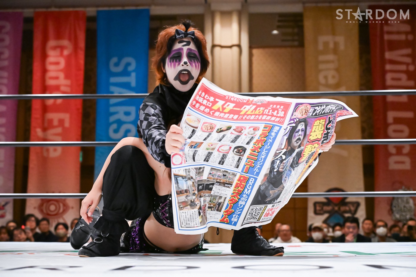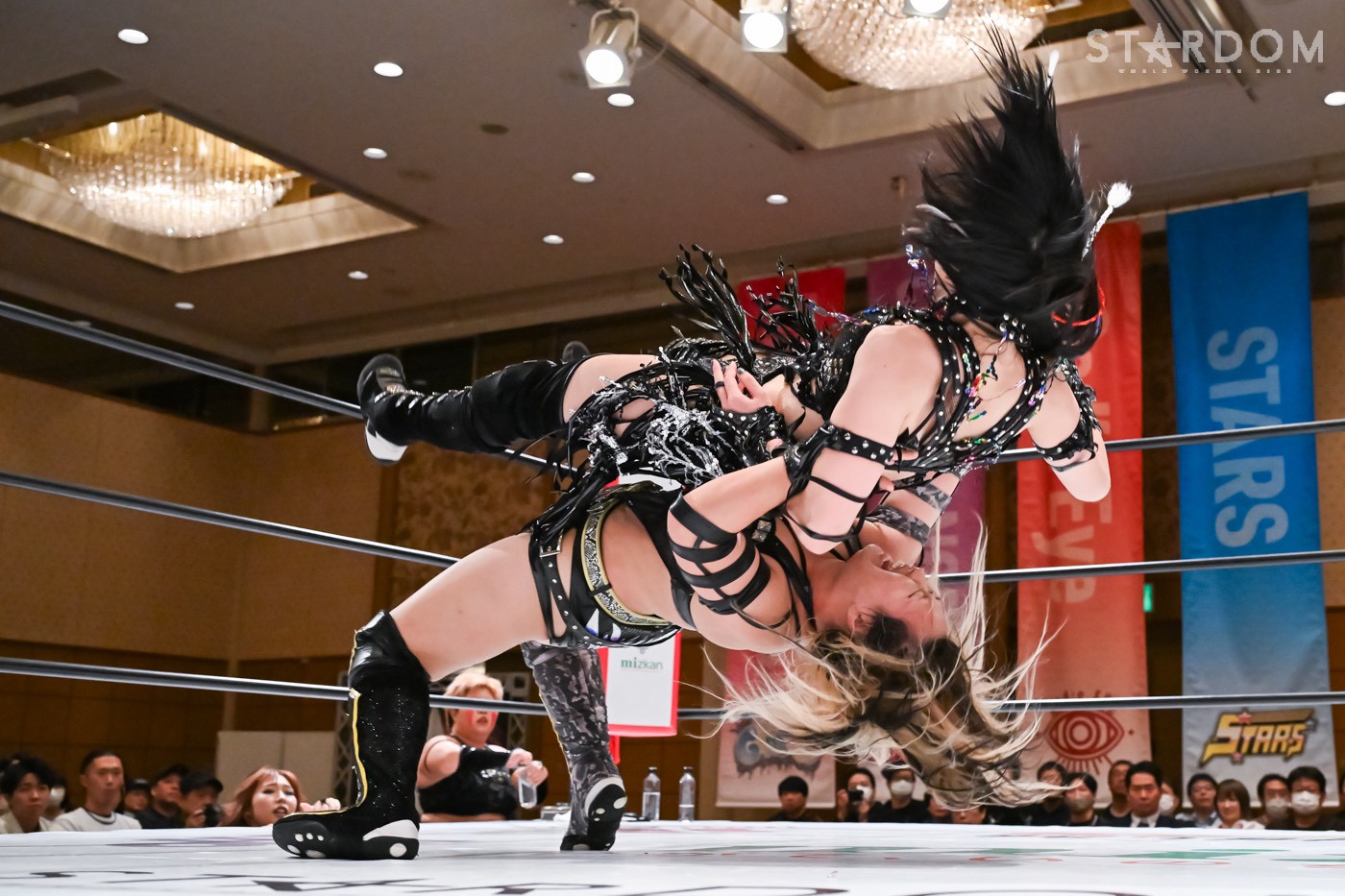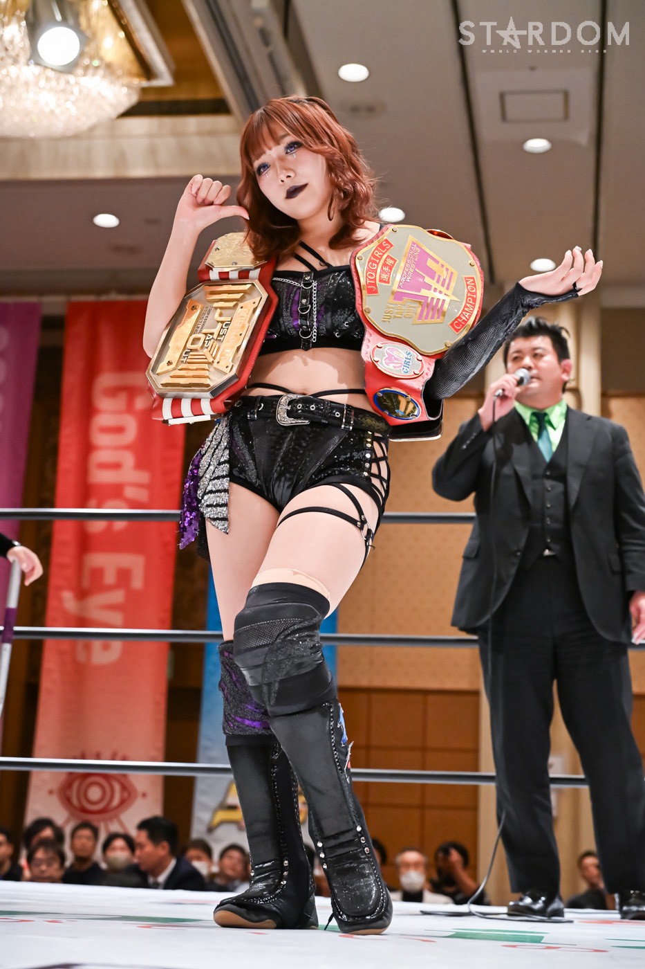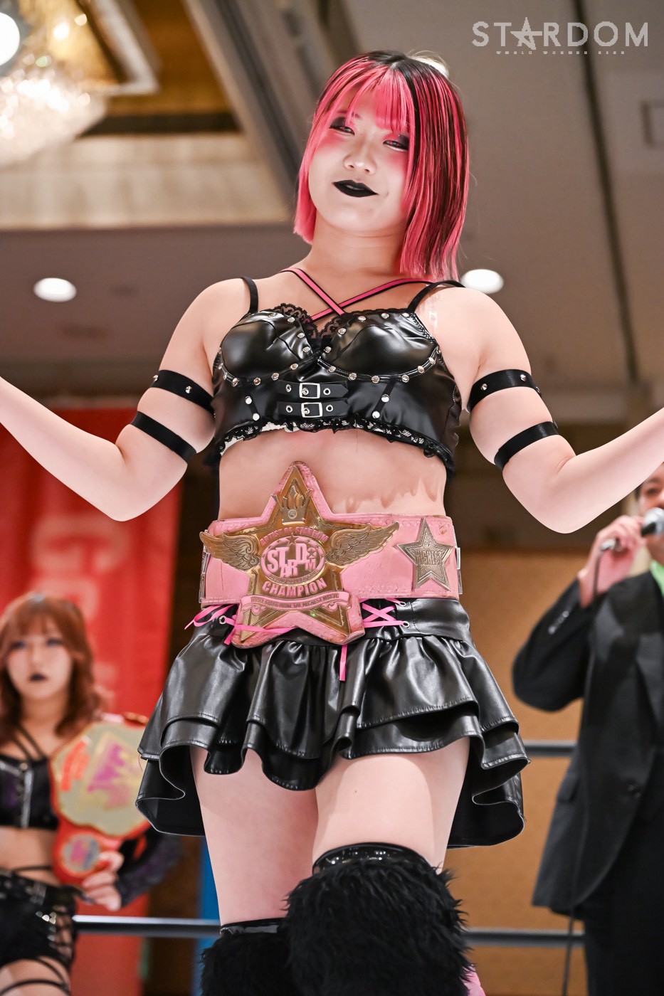 上谷と桃が、いきなり退治。試合がスタートしロープワークの攻防。上谷が桃のミドルをキャッチ、蹴りをかわし合って睨み合う。吏南とあずさが蹴りのかわし合い。あずさがソバットからミドルで吏南を倒す。琉悪夏があずさの足を引いて場外戦へ。桃が上谷を本部席に叩きつけ、2本のベルトを誇示。しかし後方から小波が襲撃。吏南と琉悪夏があずさに連係攻撃。あずさが返すと、吏南がヘアーホイップ、コーナーに追い込み顔面を踏みつける。フキゲンがあずさにスポーツ紙を読みながらキャメルクラッチ。フキゲンの串刺し攻撃には、あずさが足を出していく。あずさが突進すると、フキゲンが花をつまむ。あずさはカウンターで二段蹴り。ナツコがフキゲンをリング下に投げて再び場外戦。リングに戻り、ナツコがフキゲンにショルダータックル。フキゲンが上谷をかいくぐるが、タッチはできず。上谷が小波にタッチ。小波はフキゲンにフィッシャーマンを予告。かわしたフキゲンがブレーンバスターを予告、小波が切り返してワキ固め。フキゲンがサミングからブレーンバスターを宣言して丸め込む。吏南が小波にミサイルキック、卍固め。あずさがカットに入るが、吏南はまとめてホールド、小波にドロップキック。小波が吏南にミドルキック。吏南がビッグブーツでやり返す。小波のダッシュに吏南が「このクソ姉貴が!」とビッグブーツ。小波がかわしてスリーパー。フキゲンのスポーツ紙殴打、セントーンから吏南がジャックナイフ。吏南のダイビングフットスタンプを小波がかわしてミドルキック、フィッシャーマン。ナツコが吏南にセントーン。払い腰をナツコがこらえてエルボー連打、吏南がかいくぐりビッグブーツから払い腰をナツコに決める。琉悪夏がナツコに串刺しラリアット、フェイントをかけてエルボー、ナツコもフェイントをやり返してエルボースマッシュ。桃と琉悪夏が連係でナツコを攻め込む。琉悪夏はナツコにフェースロック。ナツコがエスケープすると、琉悪夏は串刺しクロスボディー。コーナーに上がると、あずさが妨害してデッドリードライブ。ナツコが琉悪夏にキャノンボール。返した琉悪夏にナツコはダイビングボディープレス。琉悪夏がかわしてナツコとラリアットをぶつけ合う。ナツコが逆水平連打、琉悪夏がラリアット、ナツコもラリアット、2人のクロスボディーが交錯。上谷と桃がエルボーの応酬。15分経過。桃が上谷の連打を受けて立つ。上谷の突進を髪を引いて阻止。上谷が押さえ込みを返すが、桃がブレーンバスターの3連発。上谷が返すと、桃がチキンウイングフェースロック。桃組が上谷に次々と串刺し攻撃。しかし上谷が梨杏にビッグブーツ。ナツコがラリアットで分断し、桃に上谷が二段蹴り。残り3分。上谷が桃をリング下に送り出し、「桃!」と叫んでスワンダイブ式プランチャ。桃を戻すと、小波とナツコで合体ラリアット、ジャーマン。上谷が引き起こしフィッシャーマン。スタークラッシャー狙いを桃がこらえてハイキック。パイルの体勢を上谷が切り返して突進、桃が捕まえて叩きつける。しかしカットされてリング上でH.A.T.E.が入り乱れる。残り1分。リング上は上谷と桃。上谷が二段蹴り、桃が投げっぱなしドラゴン、ダブルニーアタック。上谷が返すと、桃が突進もナツコが鉄パイプで殴打、上谷のフランケンが決まるが、琉悪夏がボックスを投げつけてカバーをカット。そのままタイムアップとなり、時間切れ引き分けに。試合後、桃が襲いかかり上谷と乱闘。桃は「こいよ!」と挑発。