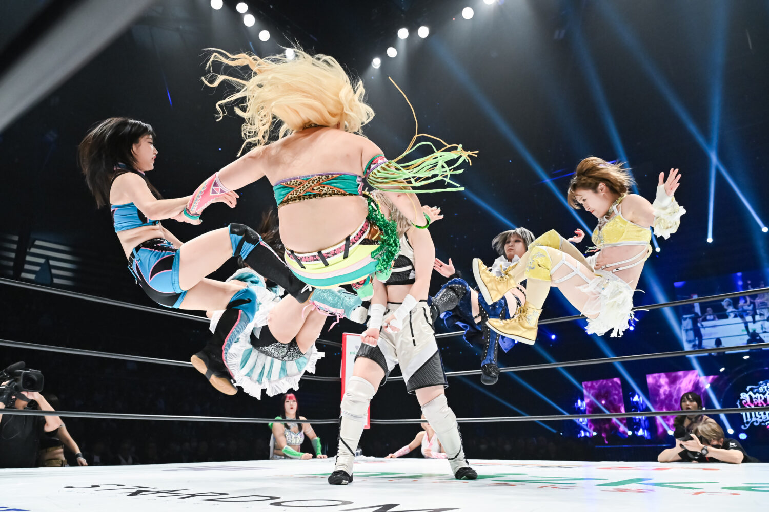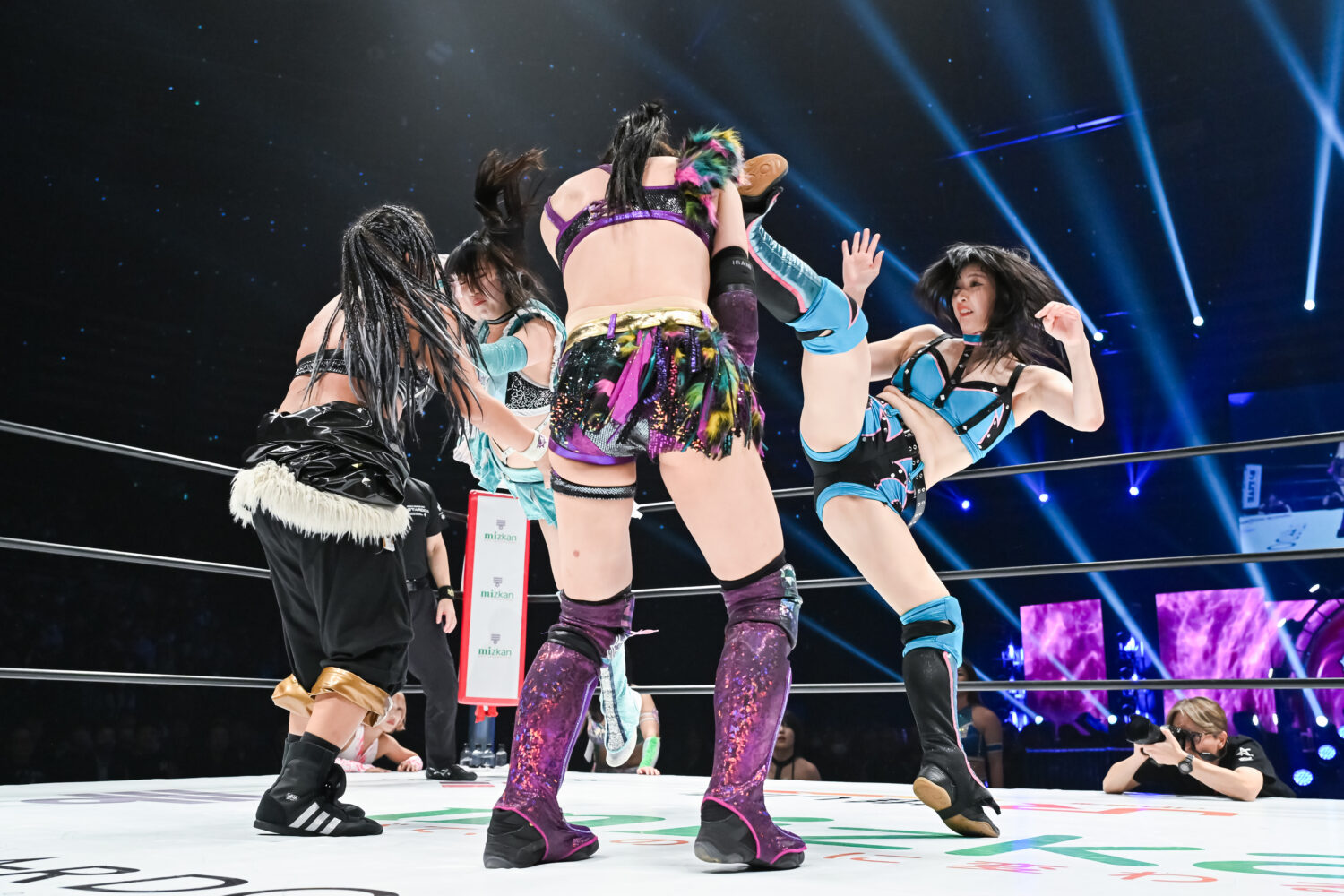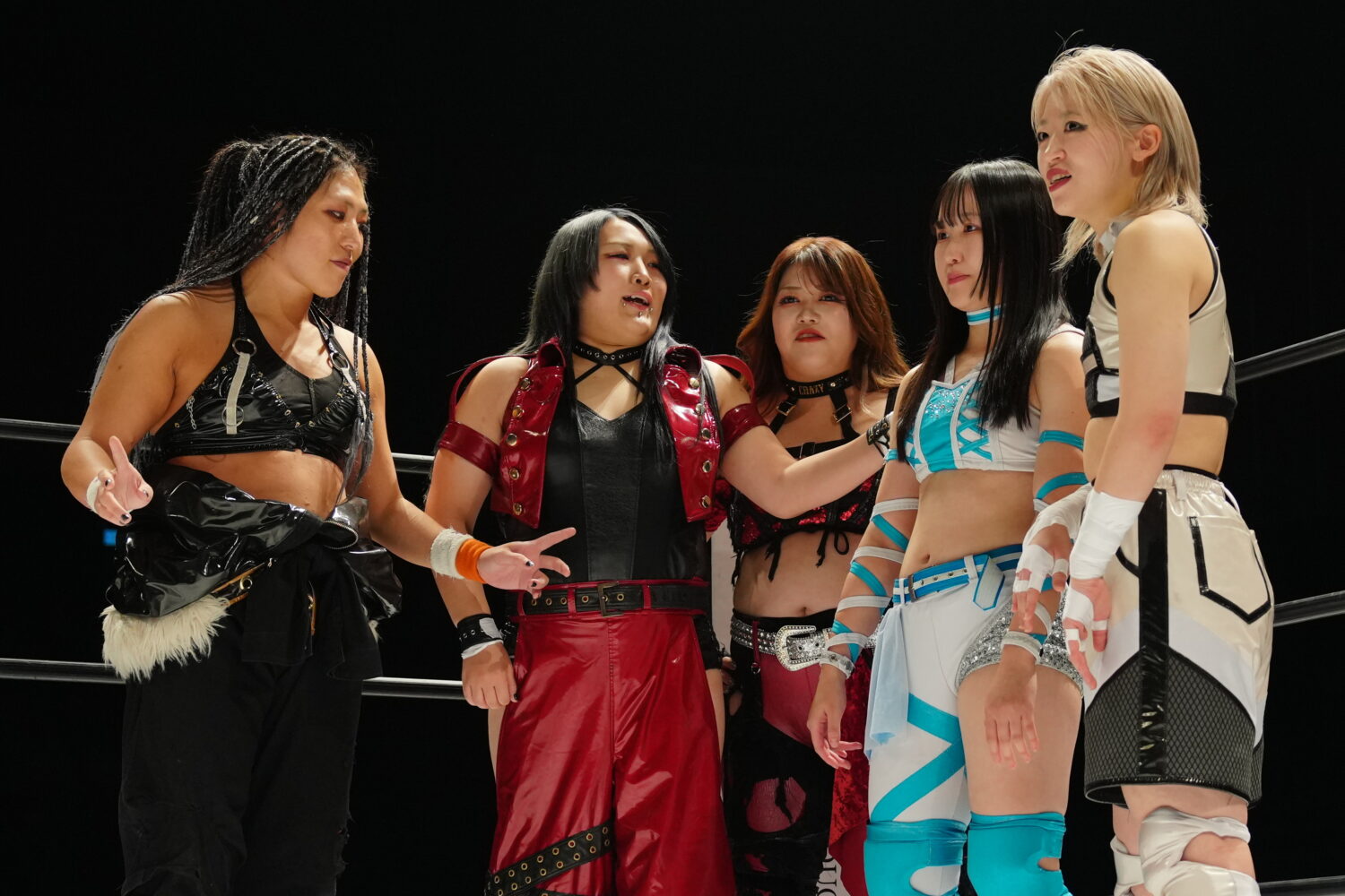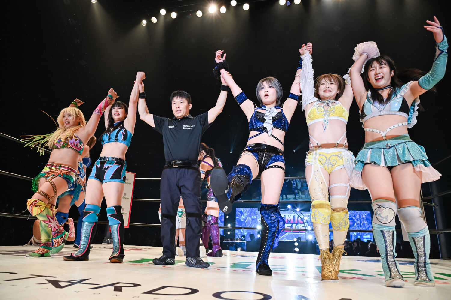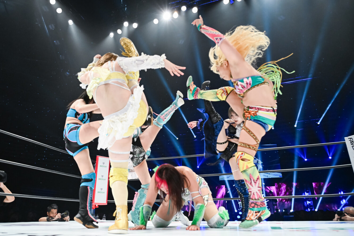 この試合は、タッチをかわさずともリング内にいる選手に試合権利のあるノータッチルール。青木が「ウチはエマちゃんを出すぜ」。さくら、虎龍、儛島の先発でスタート。儛島がさくらにドロップキック。虎龍とさくらが蹴りのかわし合い、さくらも加わり威嚇しあう。なつぽい、妃南、青木がリングへ。青木がかかってこいと挑発すると、なつぽいと妃南が共闘してドロップキック。青木が2人を誘い、まとめて河津落とし。MVLがなつぽいを捕獲しヘアーホイップの連続、儛島、アキラがドロップキック。山下がボディースラムで叩きつけ、MVLをアピールする。なつぽいがアキラをかわし、安納とダブルのドロップキック。コズエンでドロップキックを連打する。ゴッズアイがコズエンを丸め込み。返されるとサブミッションの競演。MVLがカットし、アキラが妃南にドロップキック連打。妃南が返すと、アキラをブロックして払い腰。青木が妃南を捕まえるが、安納もアキラを捕まえる。水森が入り妃南、アキラにラリアット連打、妃南にギロチンドロップ。レディと妃南がネックブリーカーの競演、山下と青木が妃南とレディを止めて鉢合わせに。山下と鈴季がレディにエルボーの挟み撃ち。しかし朱里がカットする。朱里は鈴季とや間下にコードブレイカー、山下にサッカーボールキック、PKは山下が止めて朱里と打撃の応酬。朱里が山下にジャーマン、ニーアタック、エルボーが交錯するとさくらと玖麗が介入してコズエンで連係攻撃、玖麗が朱里にスピア、水森がスーパーガール。妃南と虎龍がキックの競演で分断。レディと壮麗が水森に合体ブレーンバスター、壮麗が水森にラリアット。水森が返すと、壮麗の突進に青木がラリアット、儛島がボディーアタック、MVLがキックで競演し、鈴季が壮麗にテキーラショット。しかし、レディがカットする。鈴季が壮麗にジャーマン狙い。壮麗が切り返すと安納がミサイルキック。10分経過。コズエンがコーナーから一斉ダイブ、安納が壮麗にミサイルキック。壮麗が返すと、安納がバックを取る。壮麗が切り返してラリアット。安納が返すと、壮麗がブルーサンダーの構え。コズエンが勝っといてカカト落としの競演。そこから安納がスペシャルポテリングで壮麗を押さえ込んだ。
