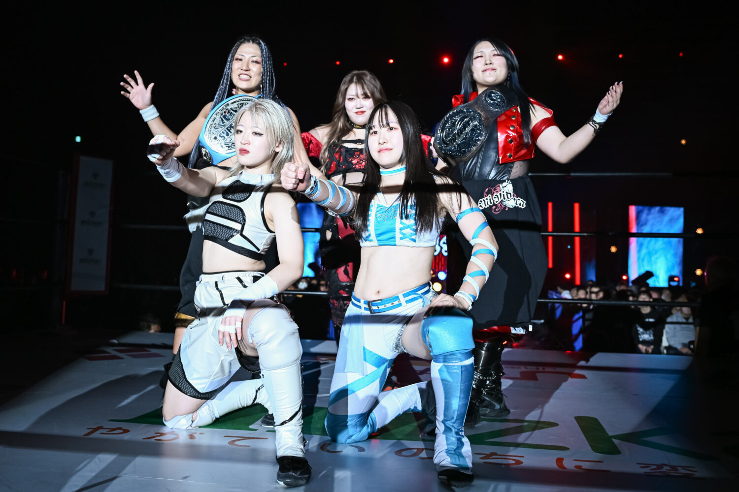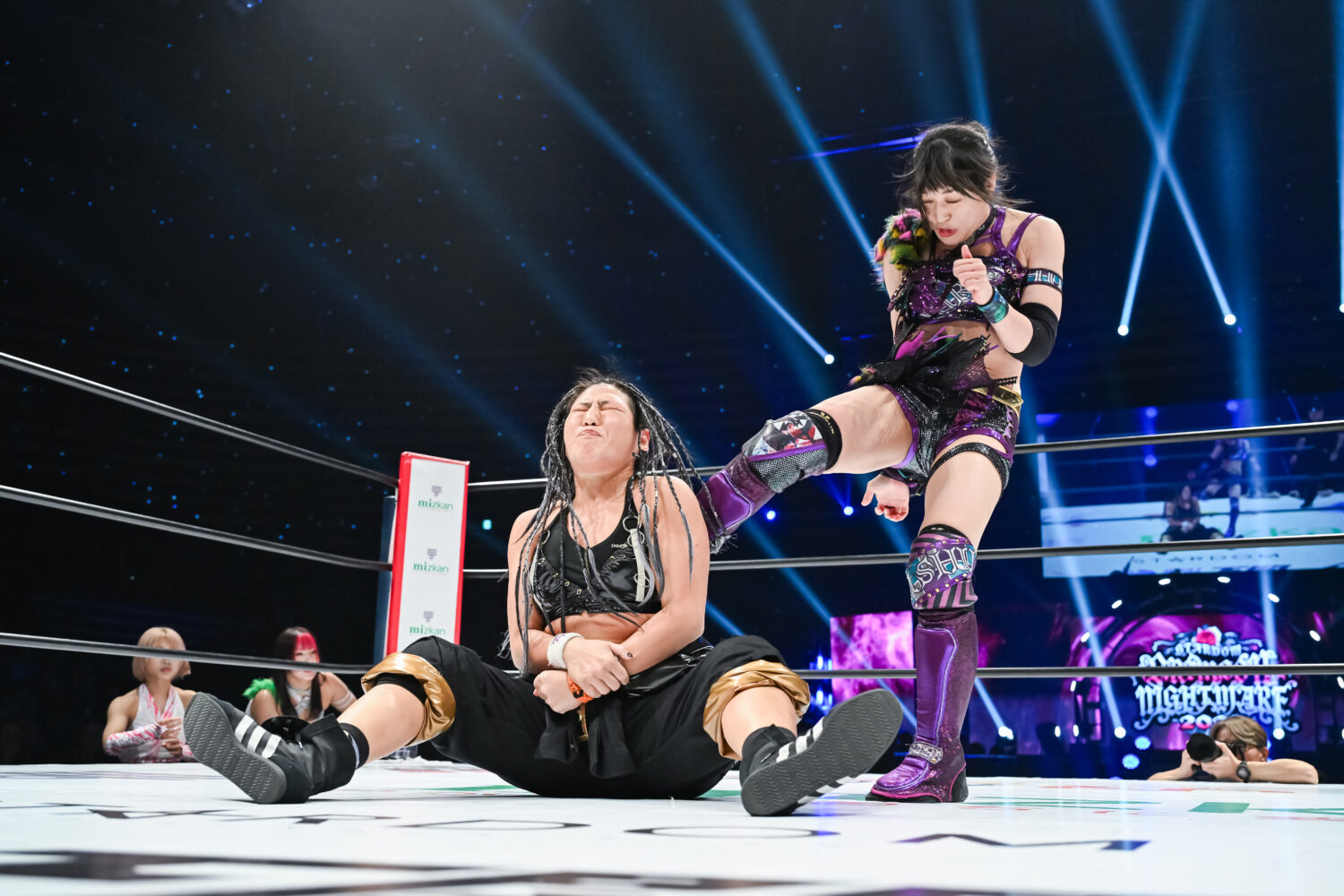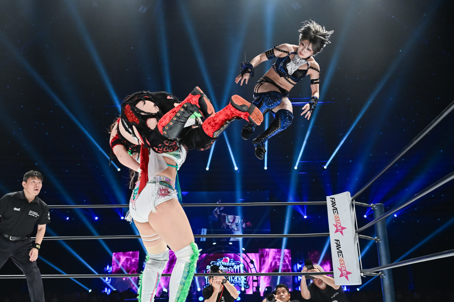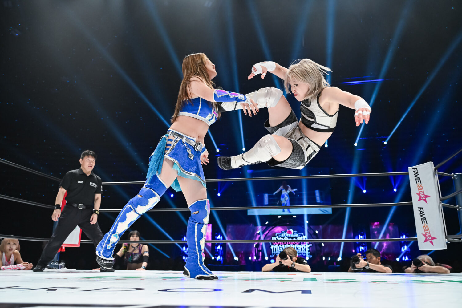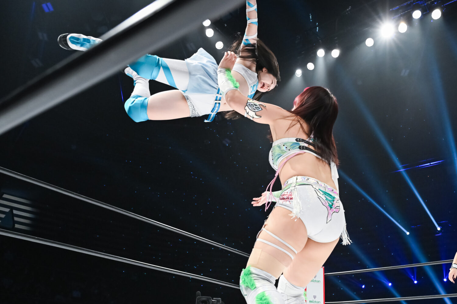 この試合は、タッチをかわさずともリング内にいる選手に試合権利のあるノータッチルール。青木が「ウチはエマちゃんを出すぜ」。さくら、虎龍、儛島の先発でスタート。儛島がさくらにドロップキック。虎龍とさくらが蹴りのかわし合い、さくらも加わり威嚇しあう。なつぽい、妃南、青木がリングへ。青木がかかってこいと挑発すると、なつぽいと妃南が共闘してドロップキック。青木が2人を誘い、まとめて河津落とし。MVLがなつぽいを捕獲しヘアーホイップの連続、儛島、アキラがドロップキック。山下がボディースラムで叩きつけ、MVLをアピールする。なつぽいがアキラをかわし、安納とダブルのドロップキック。コズエンでドロップキックを連打する。ゴッズアイがコズエンを丸め込み。返されるとサブミッションの競演。MVLがカットし、アキラが妃南にドロップキック連打。妃南が返すと、アキラをブロックして払い腰。青木が妃南を捕まえるが、安納もアキラを捕まえる。水森が入り妃南、アキラにラリアット連打、妃南にギロチンドロップ。レディと妃南がネックブリーカーの競演、山下と青木が妃南とレディを止めて鉢合わせに。山下と鈴季がレディにエルボーの挟み撃ち。しかし朱里がカットする。朱里は鈴季とや間下にコードブレイカー、山下にサッカーボールキック、PKは山下が止めて朱里と打撃の応酬。朱里が山下にジャーマン、ニーアタック、エルボーが交錯するとさくらと玖麗が介入してコズエンで連係攻撃、玖麗が朱里にスピア、水森がスーパーガール。妃南と虎龍がキックの競演で分断。レディと壮麗が水森に合体ブレーンバスター、壮麗が水森にラリアット。水森が返すと、壮麗の突進に青木がラリアット、儛島がボディーアタック、MVLがキックで競演し、鈴季が壮麗にテキーラショット。しかし、レディがカットする。鈴季が壮麗にジャーマン狙い。壮麗が切り返すと安納がミサイルキック。10分経過。コズエンがコーナーから一斉ダイブ、安納が壮麗にミサイルキック。壮麗が返すと、安納がバックを取る。壮麗が切り返してラリアット。安納が返すと、壮麗がブルーサンダーの構え。コズエンが勝っといてカカト落としの競演。そこから安納がスペシャルポテリングで壮麗を押さえ込んだ。