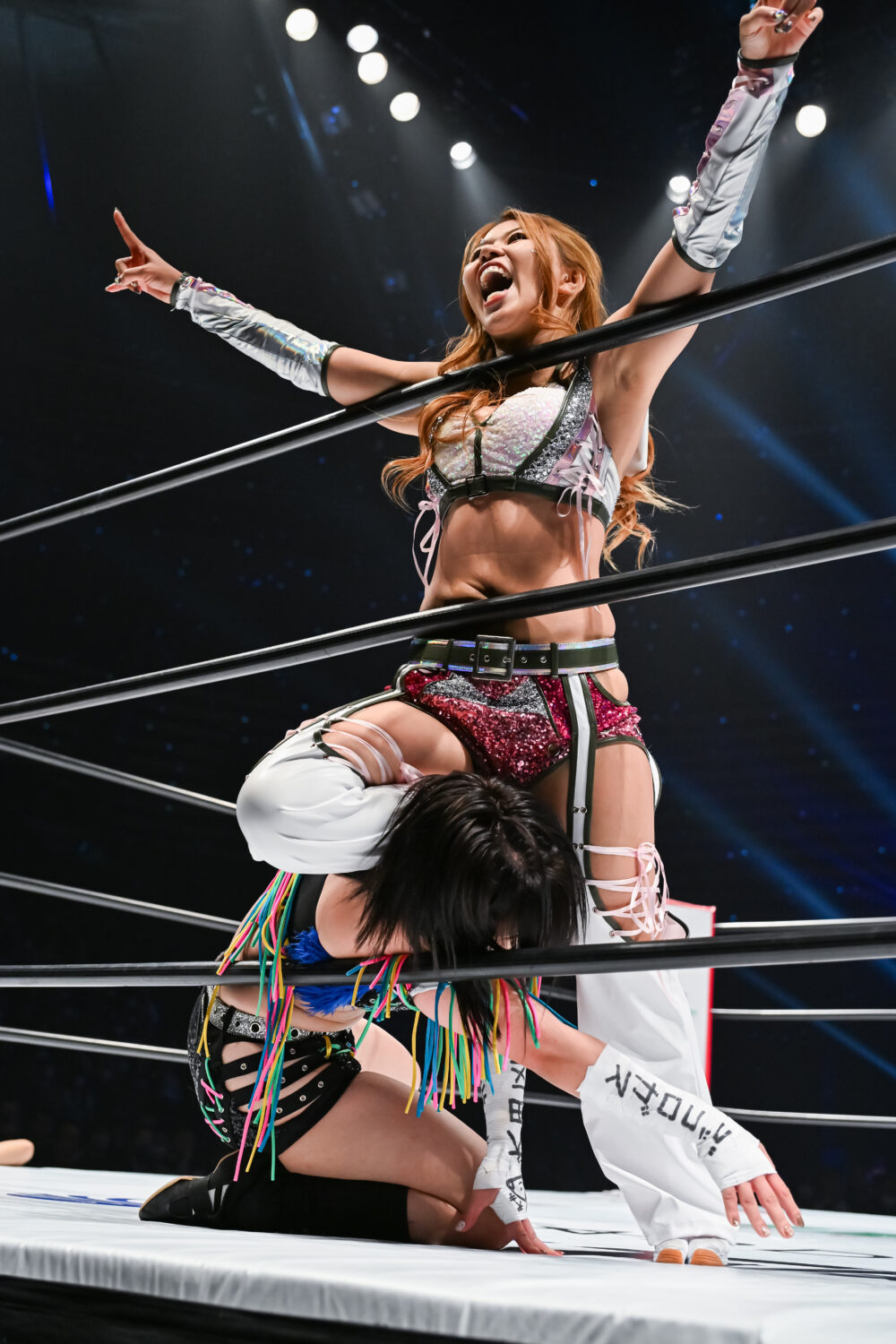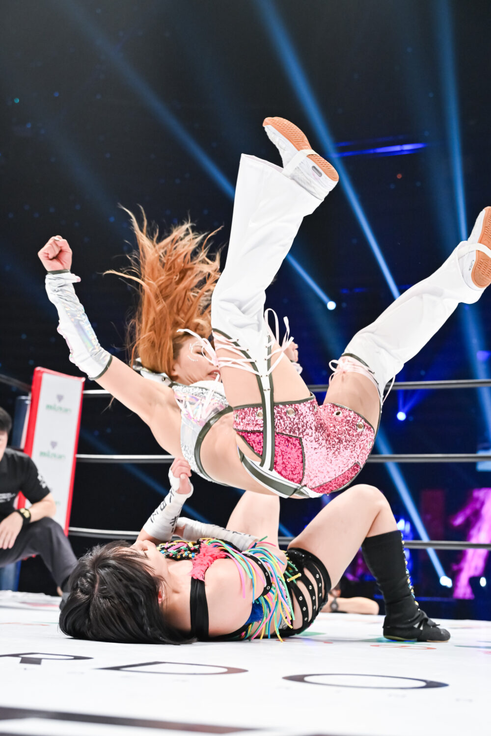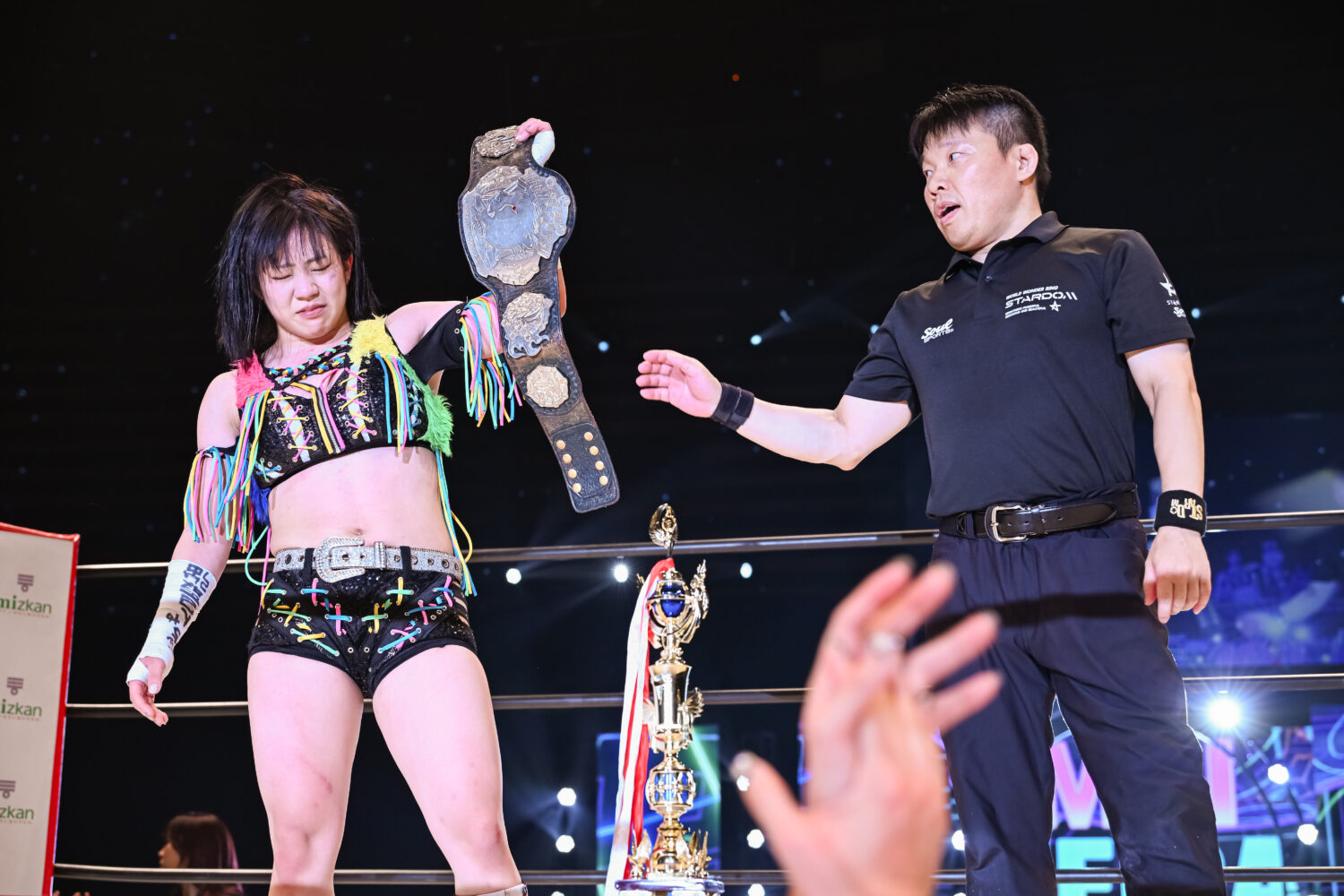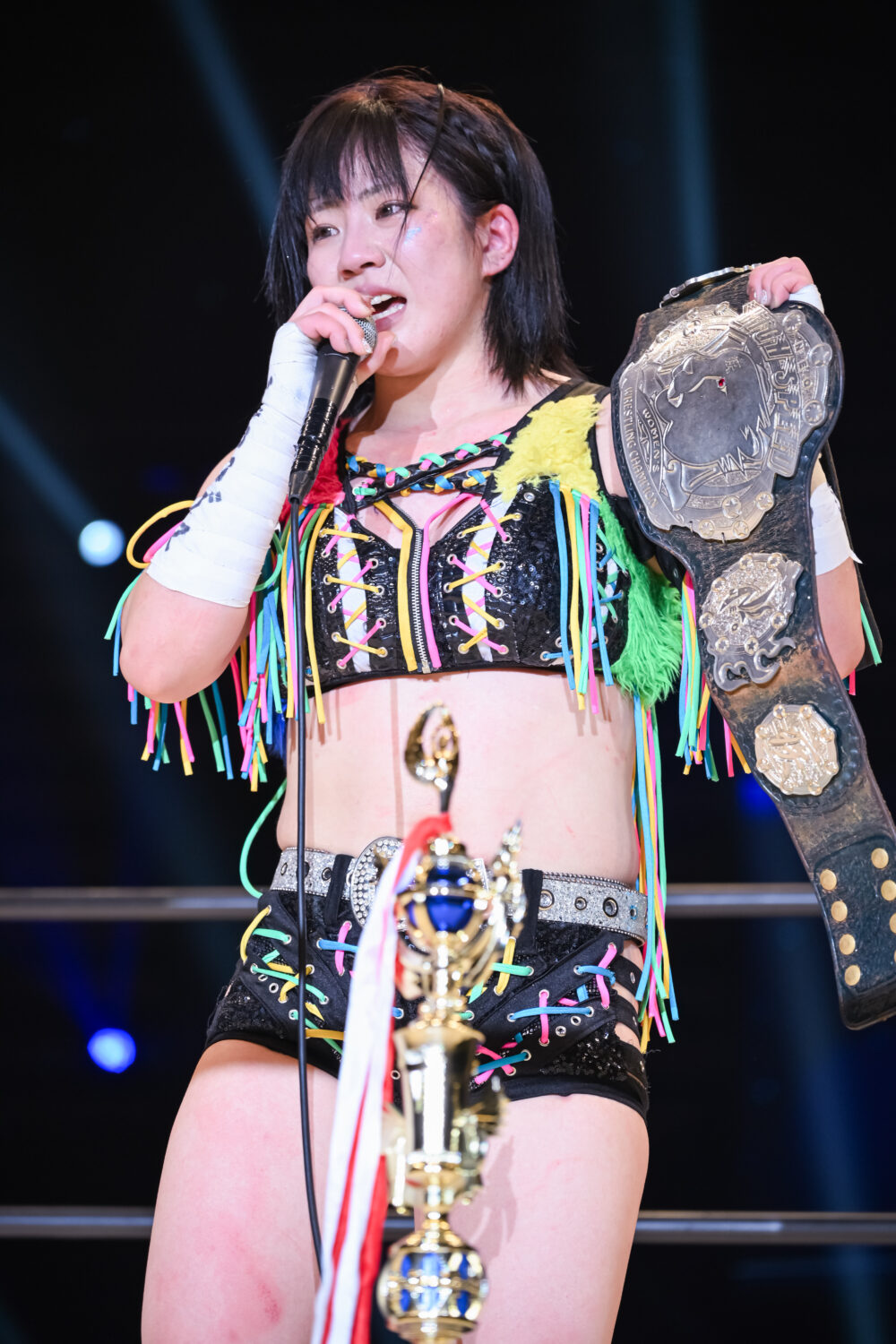 星来「今日、本当に試合前、緊張してて、もういま、ちょっと安心しました。本当に自分は不器用で、すぐ結果を出すということがあまりできないんですけど、ちゃんと自分のペースで、芽依のハイスピードで、このベルトの価値上げていくんで、みなさんついてきてください。ありがとうございました」