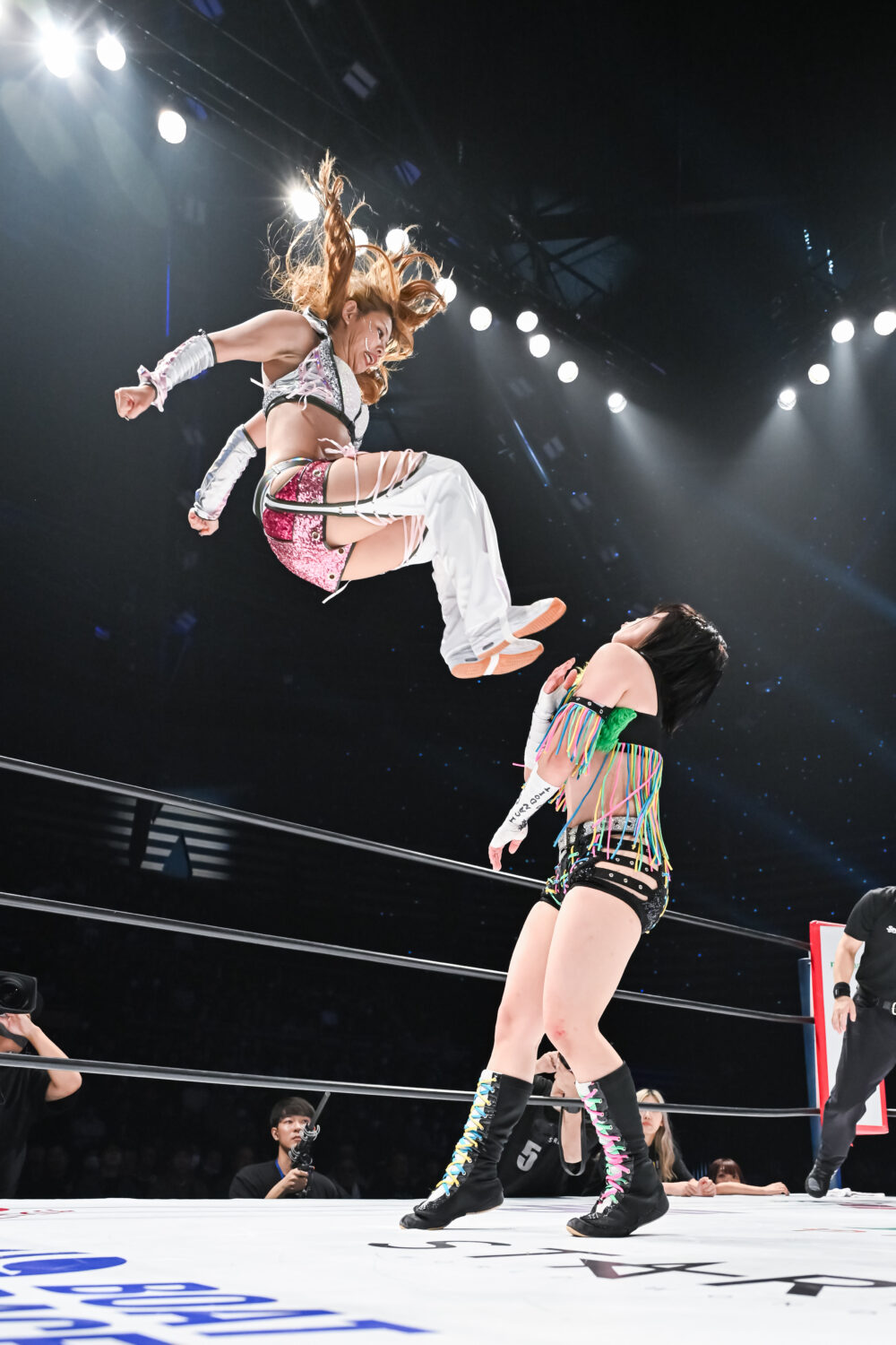 ロックアップから葉月が倒して丸め込み、星来が首を取りグラウンドでやり合う。葉月がロープワークから飛びついて星来を場外に送り出す。フェイントをかけて葉月がポーズ。星来がリングに戻り葉月が蹴りを入れてからドロップキック。葉月は片足でカバー。星来が返すと葉月が顔面を蹴飛ばしていく。葉月がチョップを打ち込みコーナーへ串刺しエルボー連打、セントーン。星来が返すと、葉月が踏みつけてセントーン。葉月が首、脚を取ってサブミッション。星来がエスケープすると、葉月はロープに追い込み顔面ウォッシュ。しかし星来がドロップキックで場外に送り出し、プランチャで舞う。星来が葉月を戻してセカンドからミサイルキック、ラリアットを葉月がかわすが星来がブレーンバスター。葉月が返すと、5分経過。エルボーの応酬から葉月の突進を呼んで星来がラリアット、葉月がエルボー、セカンドに飛んでコルバタ、ビッグブーツ。リング下に落ちた星来に葉月はトペを見舞う。さらにコーナーからミサイルキックで星来を吹っ飛ばす。星来が返すと、葉月が串刺しエルボー、ブレーンバスター。セカンドからダイビングダブルニードロップ。星来が返すと葉月はトップへ。星来が下から張り手、フィニッシュ狙いで雪崩式フランケン。葉月がすぐに立ち上がり二段蹴り、星来がドロップキック、丸め込みの応酬から葉月が飛びつく。星来がかわしてジャーマン。星来はコーナーに上がるが葉月が落としてカバー。星来が返すと、葉月がダイビングセントーン。星来がなんとか返し、ブレーンバスター狙いを切り返してチェックメイト。10分経過、返した葉月に星来がさよなら✌狙い。葉月がリバースで叩きつけて押さえ込む。星来が返すと二段蹴りをかわしてパワーボム。フィニッシュを宣言してチェックメイトを決めると3カウントが入った。