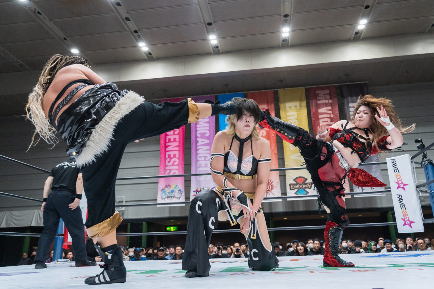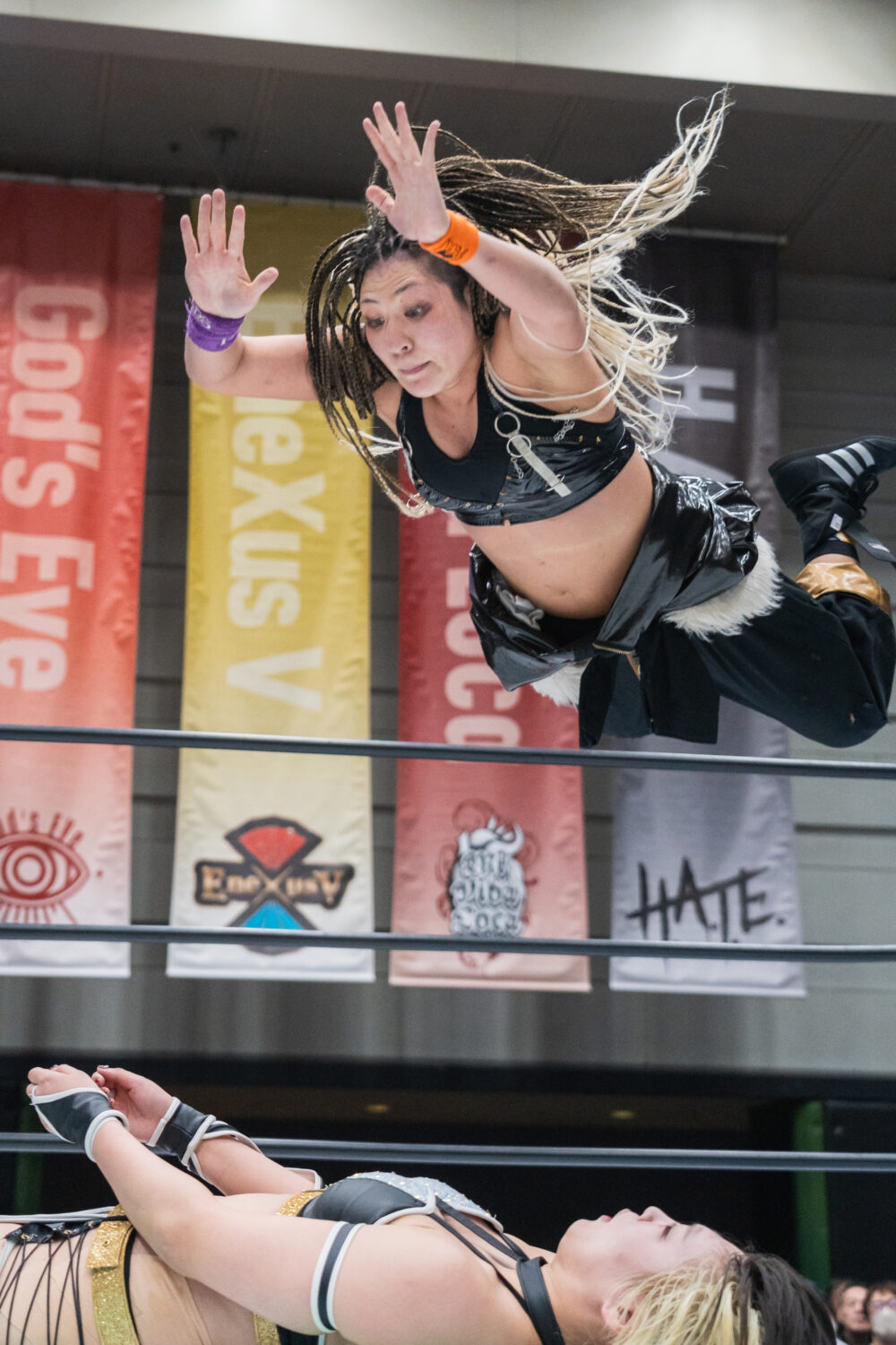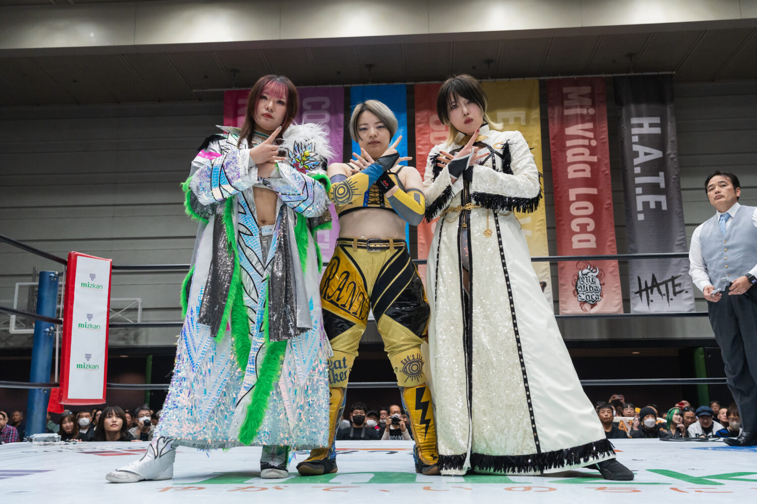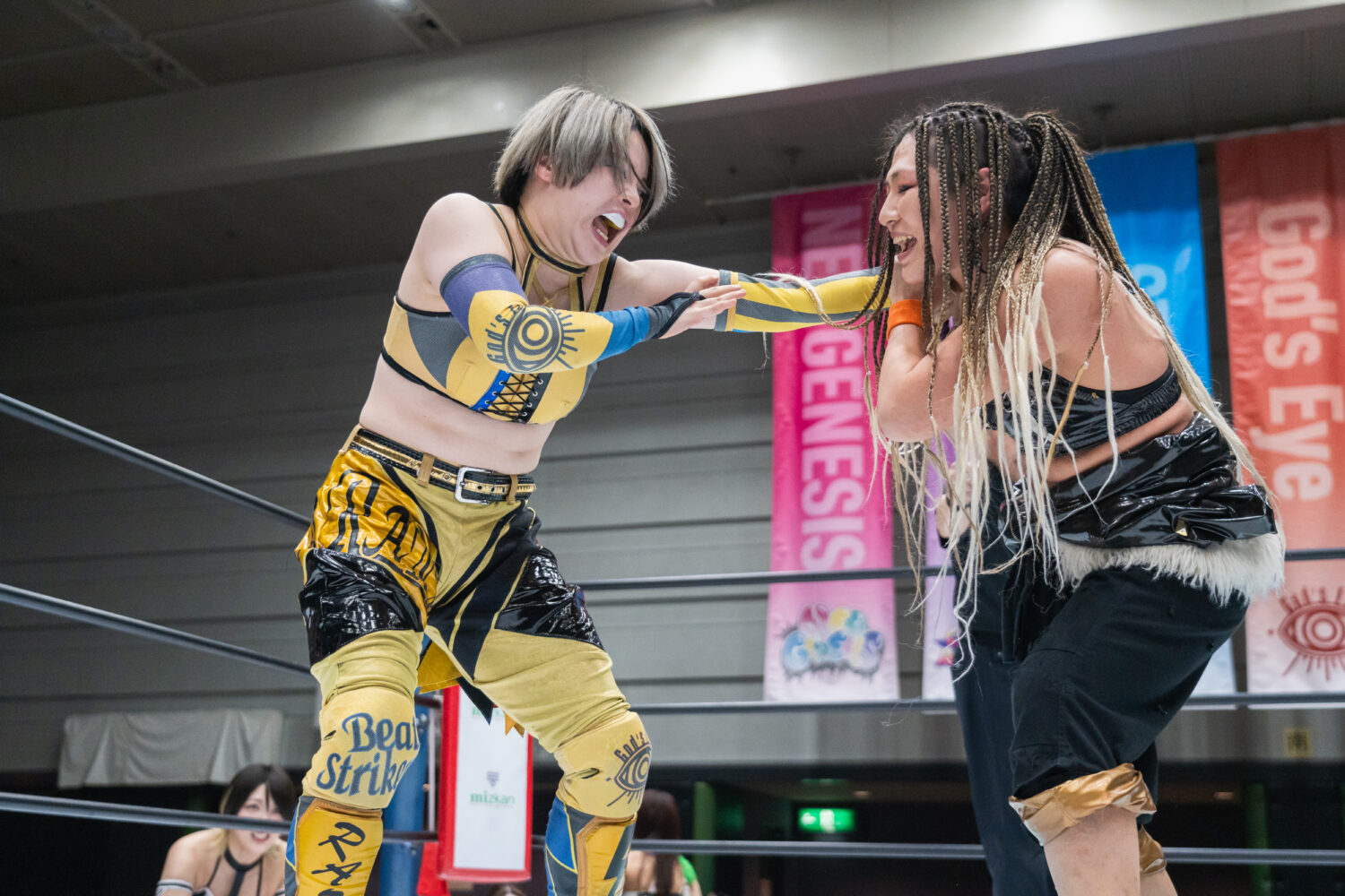 壮麗亜美&妃南&レディ・C&八神蘭奈組vs鈴季すず&山下りな&ボジラ&鉄アキラ組の8人タッグマッチから壮麗亜美&レディ・C&八神蘭奈組vs鈴季すず&山下りな&ボジラ組にカード変更。ゴッズアイとミ・ヴィダ・ロカが正面から激突する。