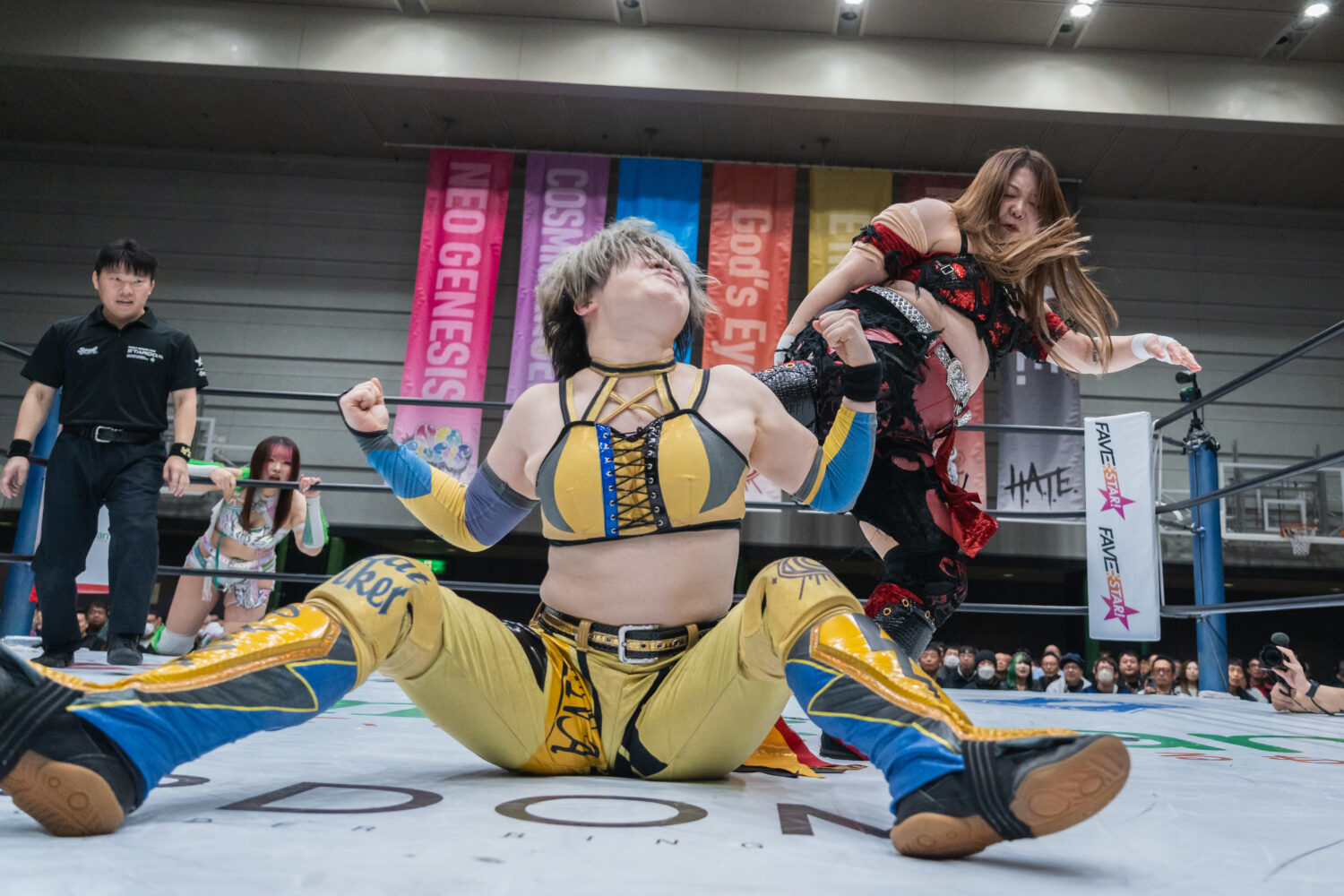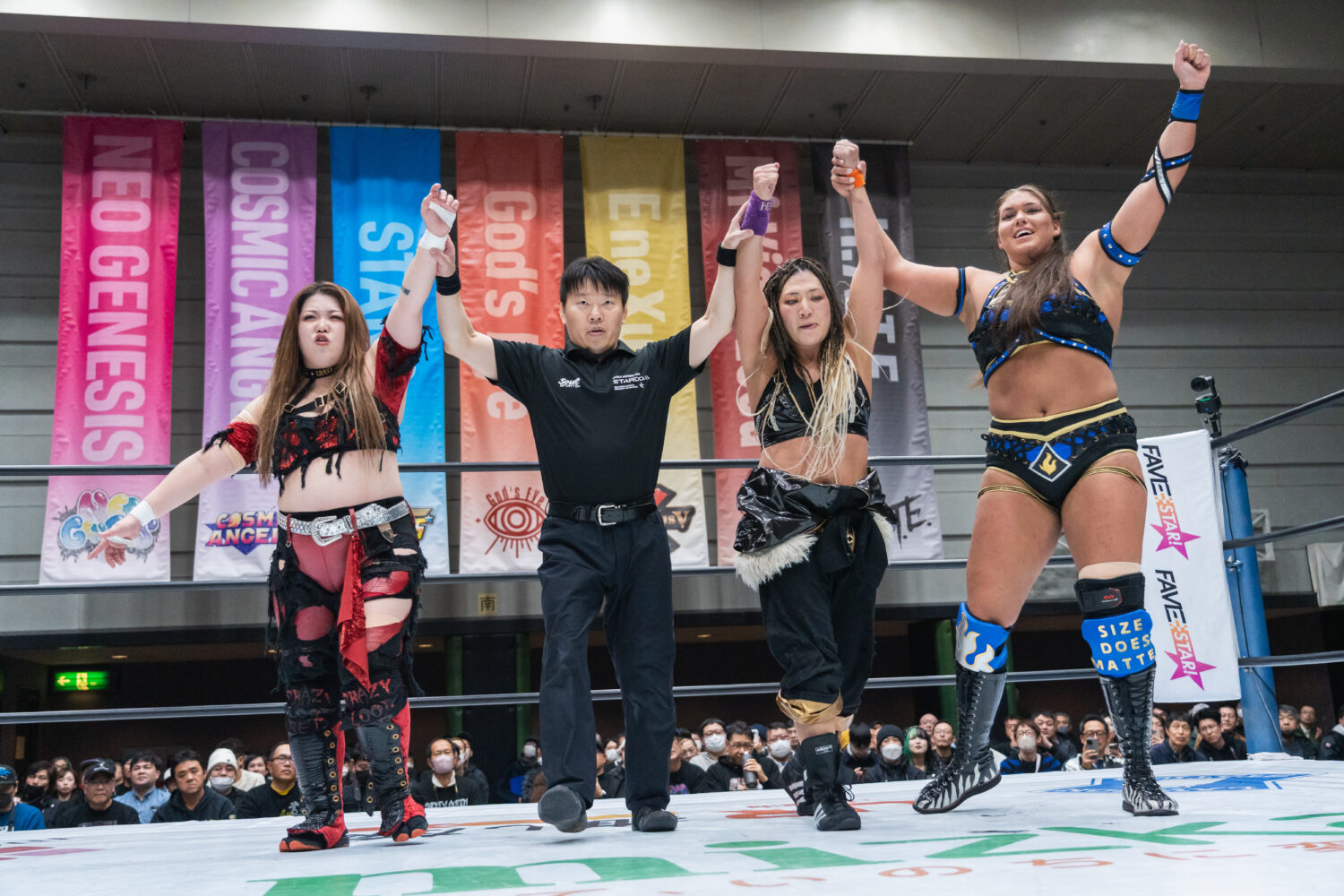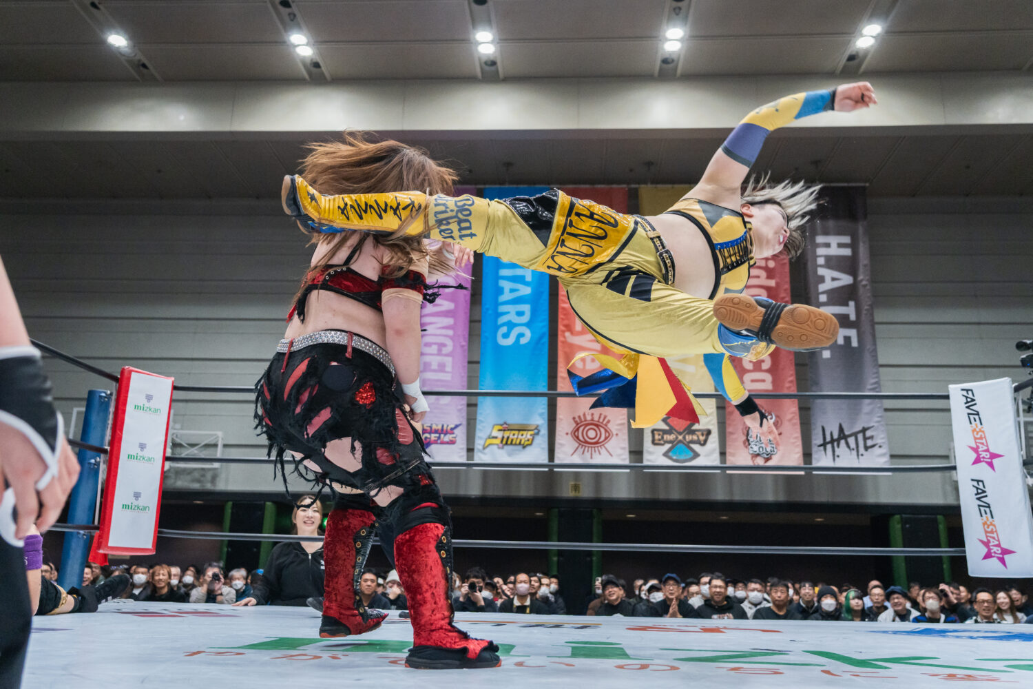 壮麗亜美&妃南&レディ・C&八神蘭奈組vs鈴季すず&山下りな&ボジラ&鉄アキラ組の8人タッグマッチから壮麗亜美&レディ・C&八神蘭奈組vs鈴季すず&山下りな&ボジラ組にカード変更。ゴッズアイとミ・ヴィダ・ロカが正面から激突する。