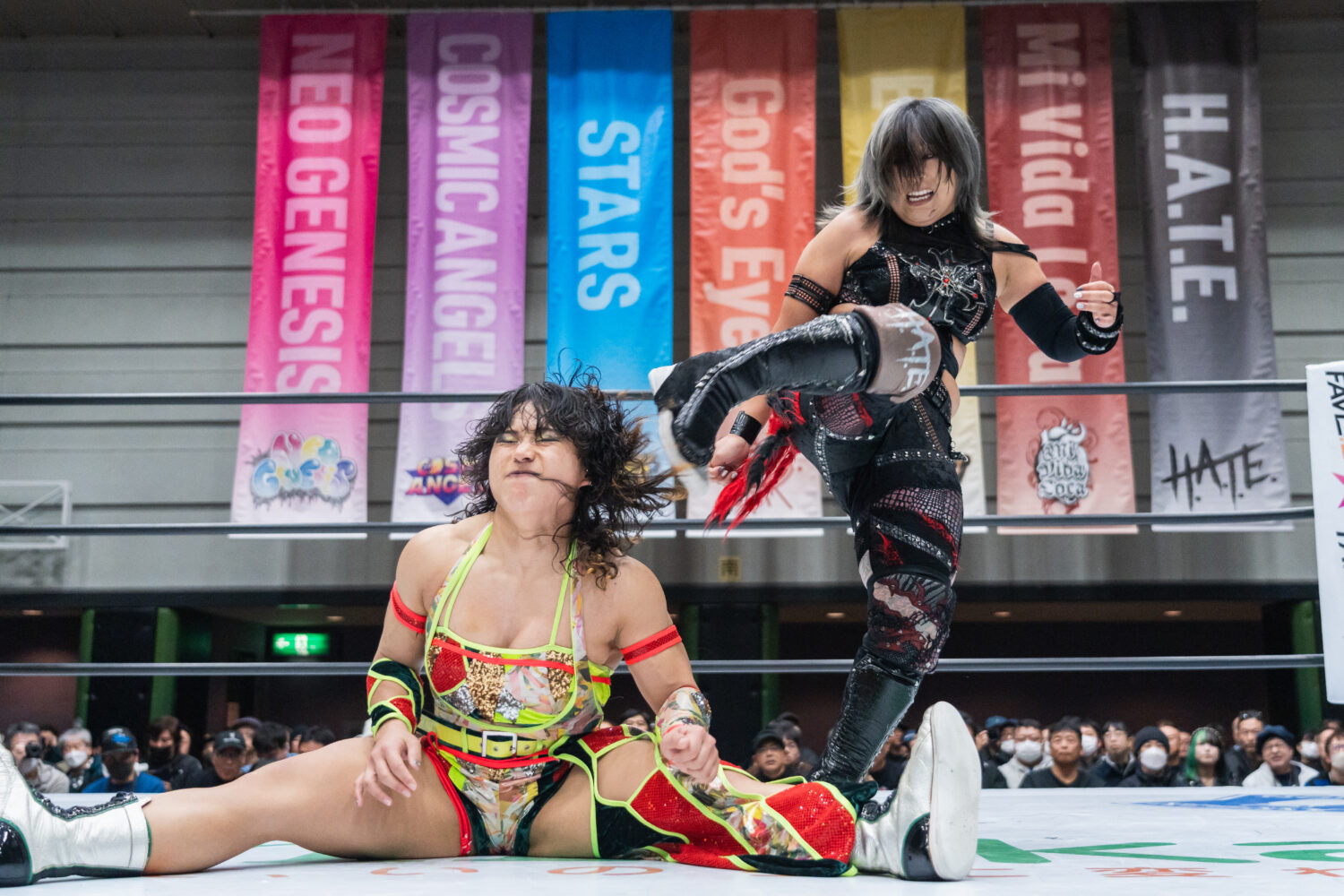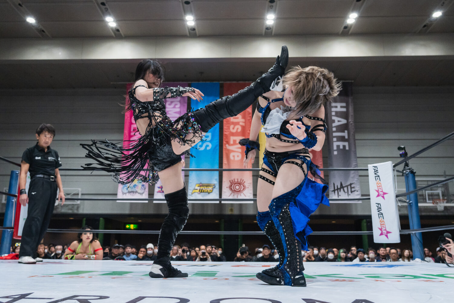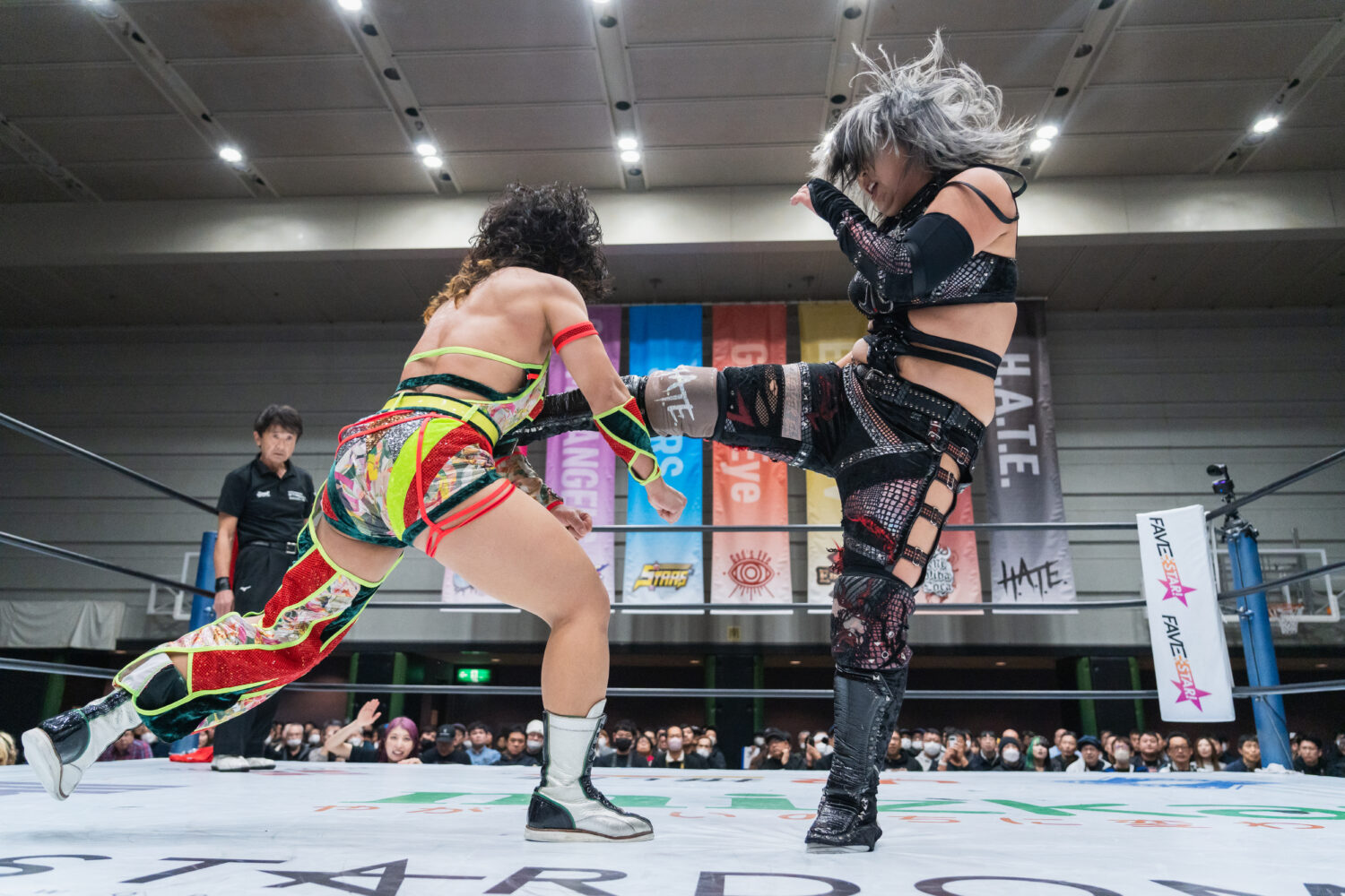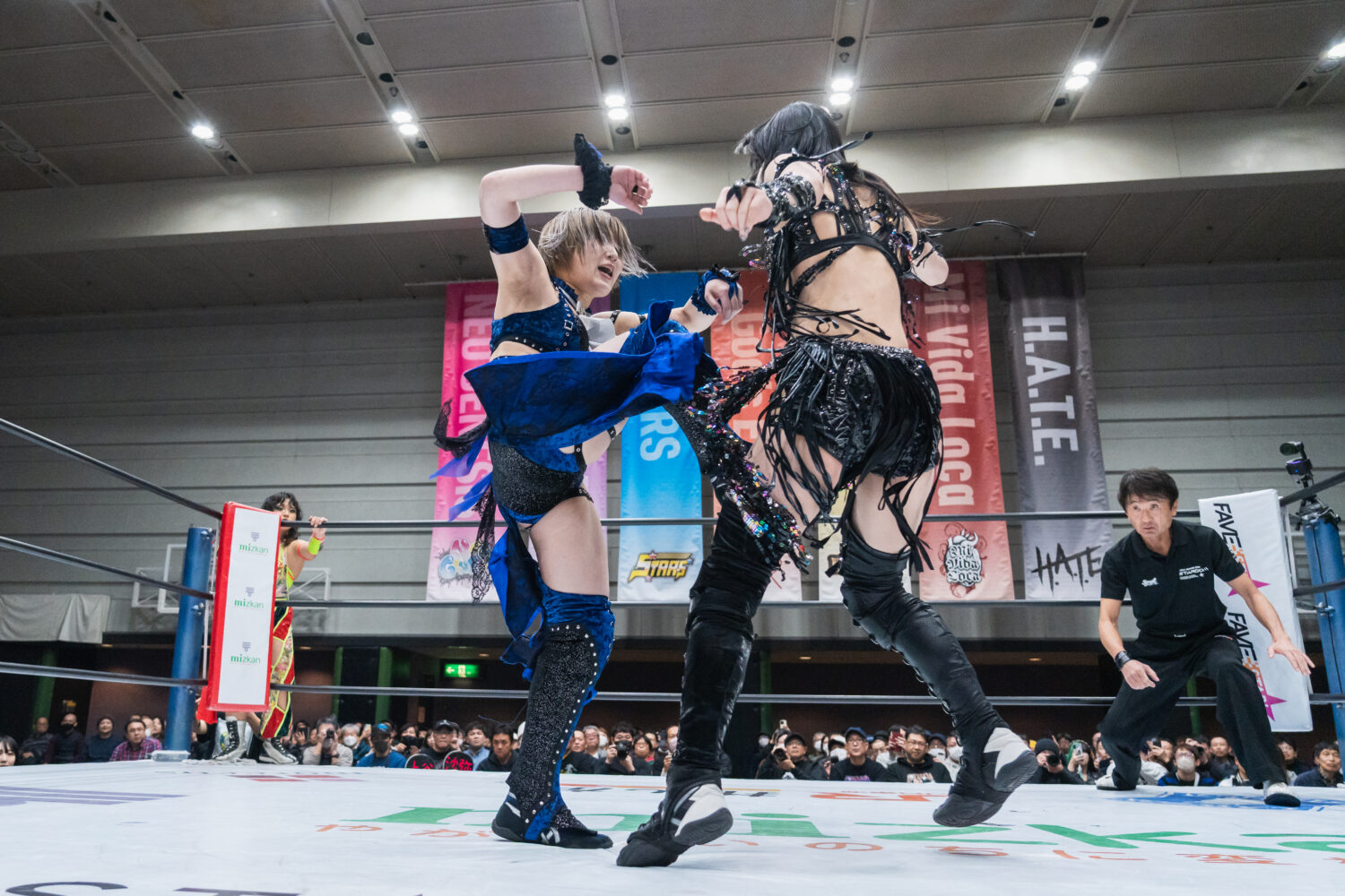 安納サオリと飯田沙耶が組んでH.A.T.E.の上谷沙弥&小波組とタッグマッチで対戦。安納は上谷のワールド・オブ・スターダム王座、飯田は小波のワンダー・オブ・スターダム王座に12・29両国で挑戦。連日にわたる前哨戦だが、今回は赤と白の王者と挑戦者が正面からぶつかることとなる。