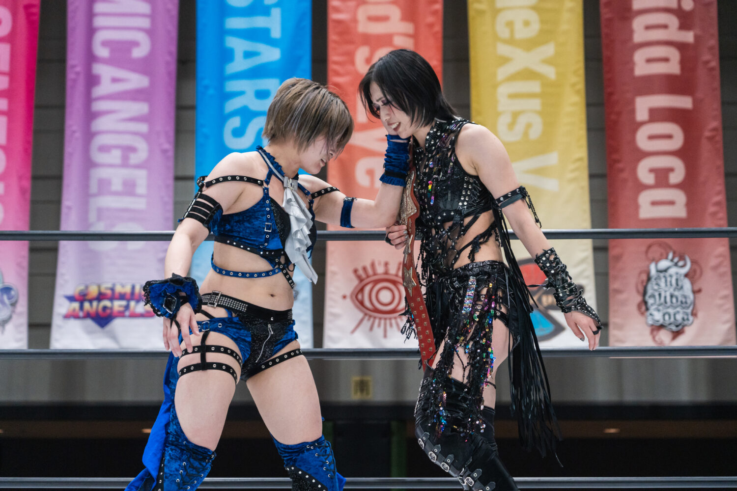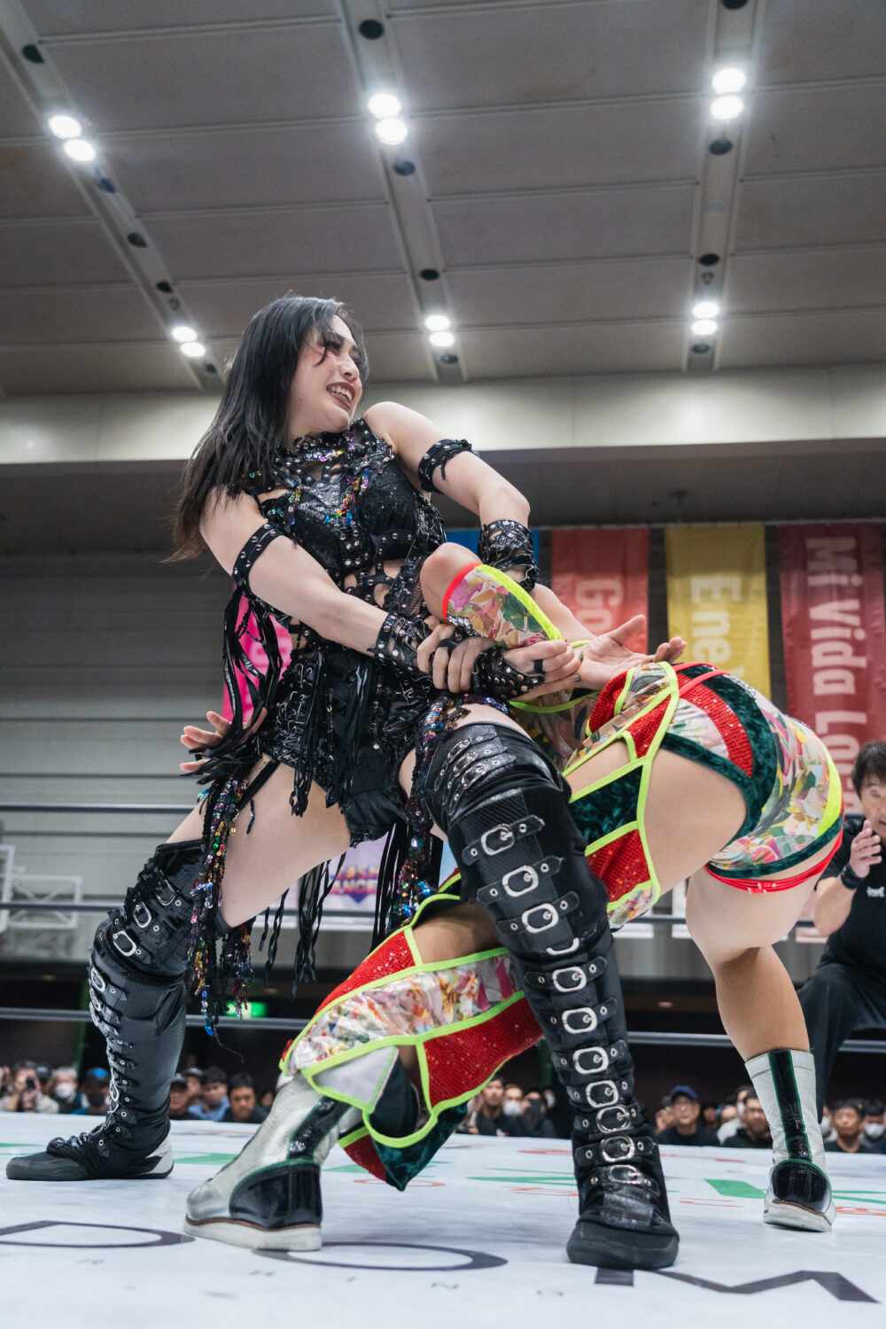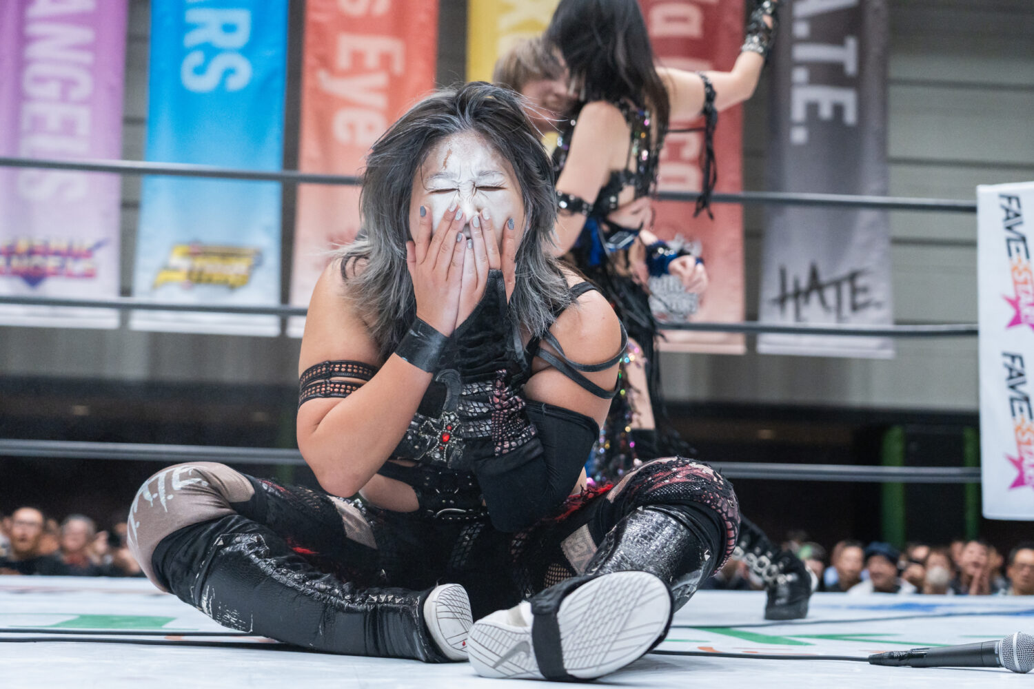 安納「飯田、ありがとう。飯田と力を合わせるようになってホンマに心強い。同じ気持ちになってるっていうことがすごい力になってるし、私たちだけじゃない。さくららも朱里も、ほかのベビーのみんなもそう。みんな同じ目標を持ってこのスターダムを変えようと思って闘ってる、リングに立ってる。やってやろうよ」