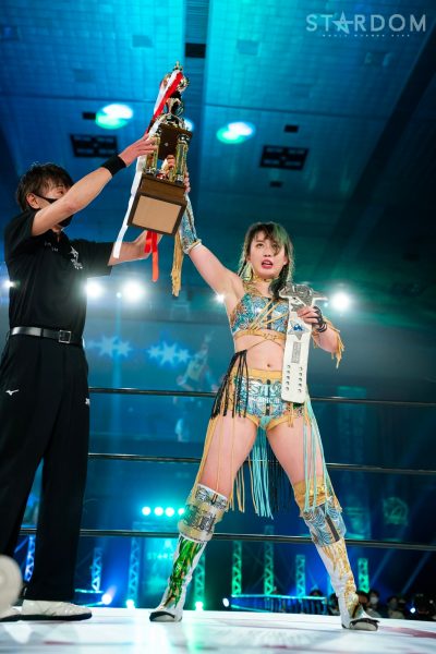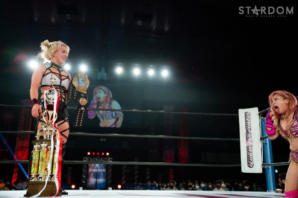 「赤いベルト、次期挑戦者として、今回のドロー、勝てなかったっていうのはスゲー悔しい…。でも、両国の2日目、27日、自分が必ず赤いベルト、スターダムの象徴、スターダムの主役になる。そして自分が勝ったら、ジュリア、中野たむ、オマエらそれぞれ倒して…(床に倒れ込んでコメントできず)」