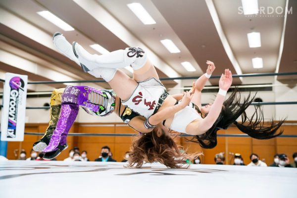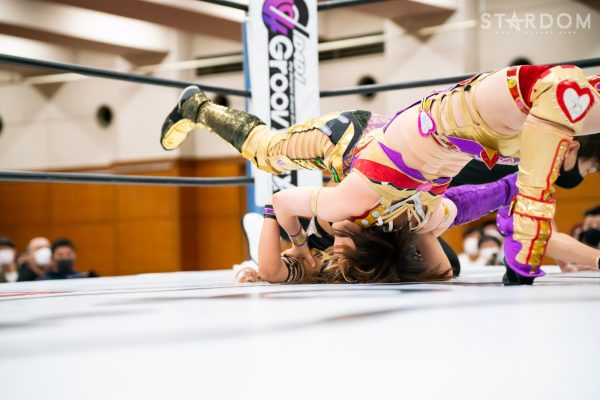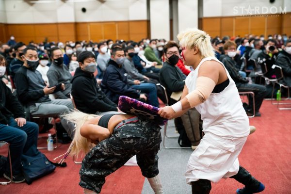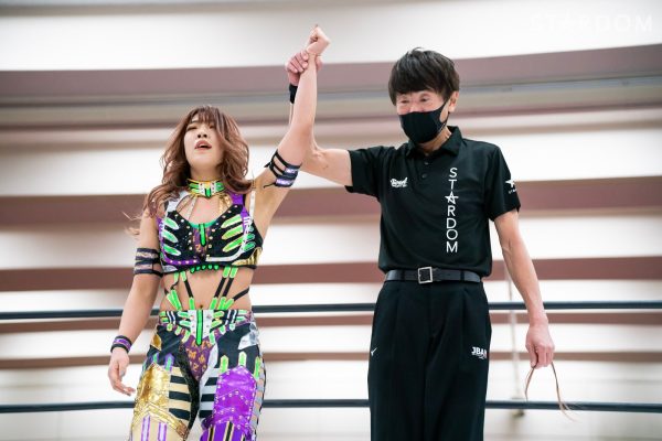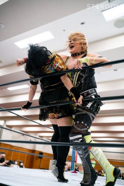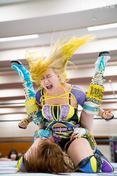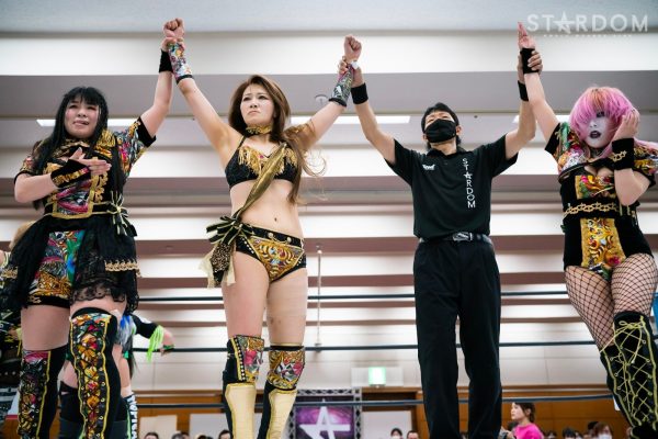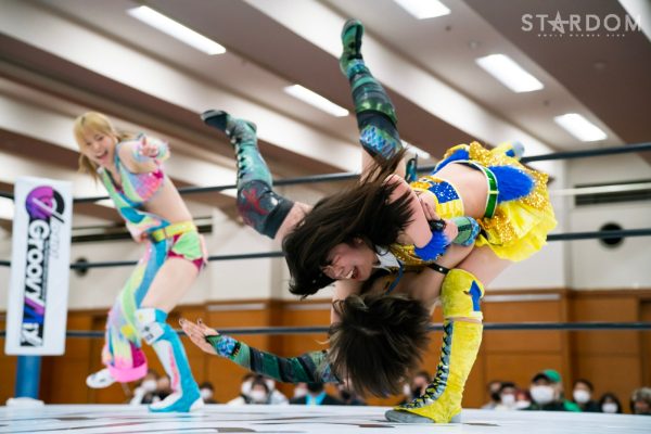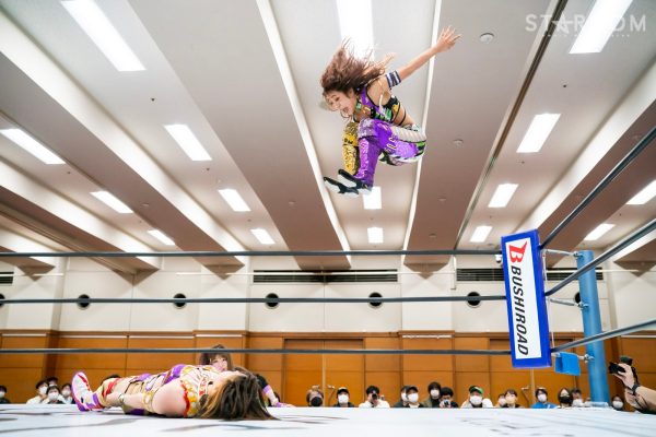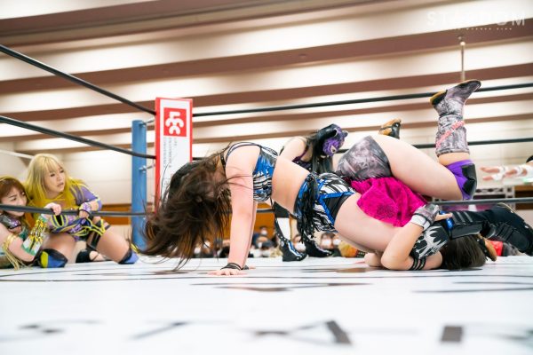 中野たむ&なつぽい&SAKI組のコズミックエンジェルズと葉月&コグマ&飯田沙耶によるSTARSの同級生トリオが公式戦。ここまでコズエンは2勝2敗の五分で、葉月組は1勝3敗とあとがない状態。葉月組は崖っぷちで、中野組も優勝を狙うには絶対に落とせない闘いとなる。